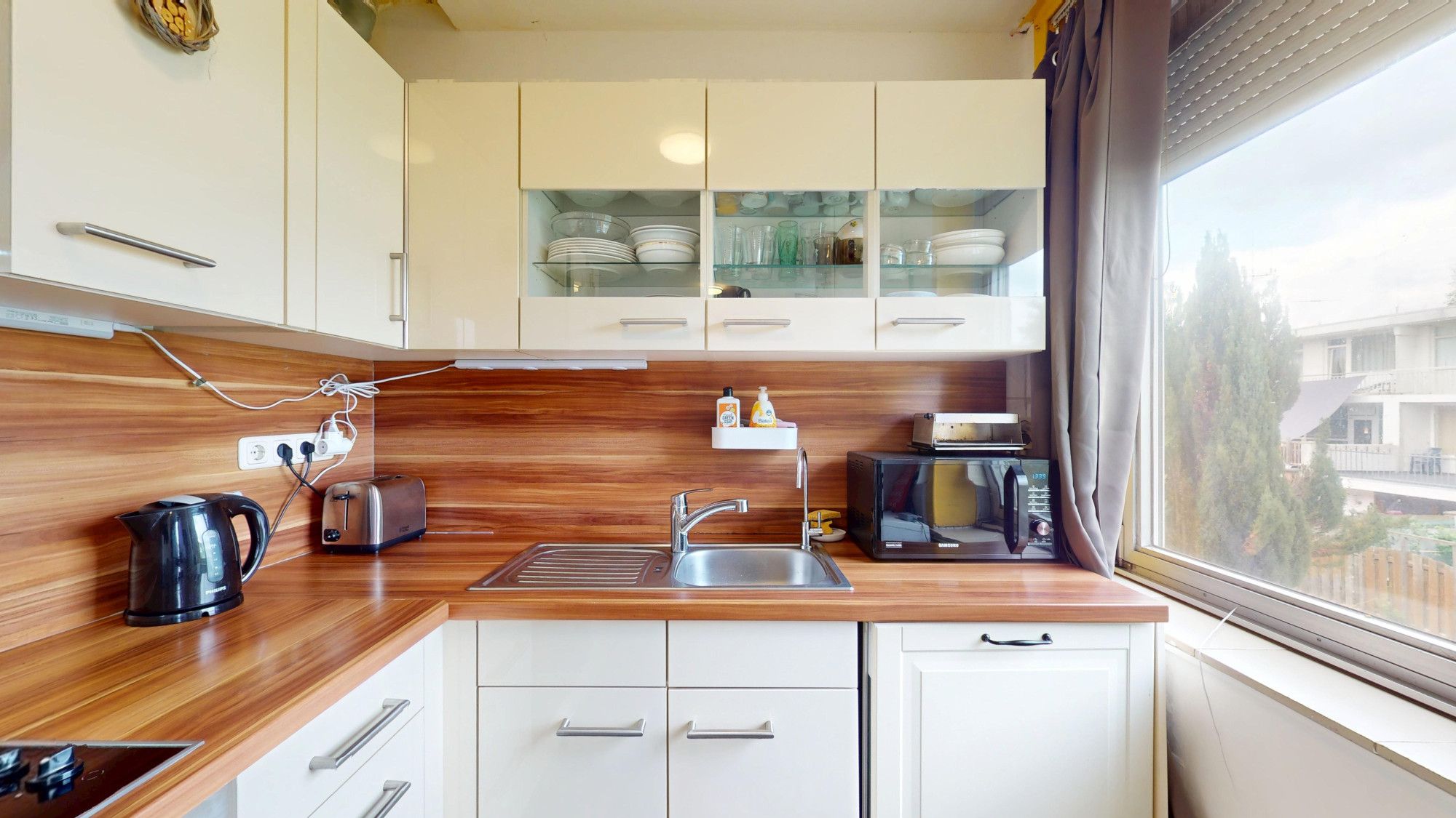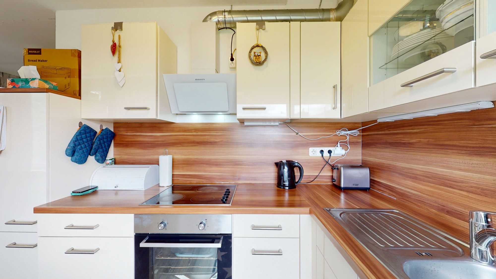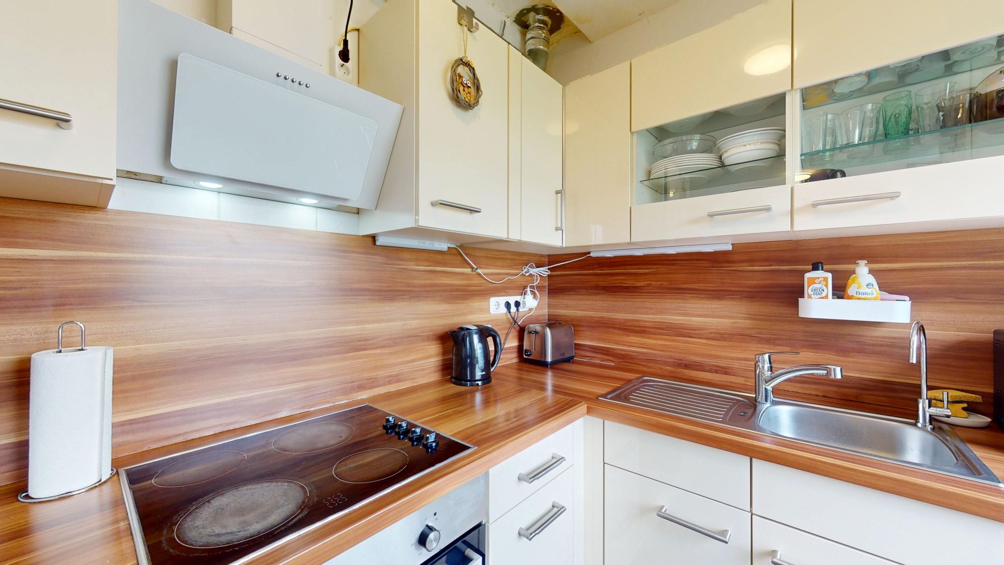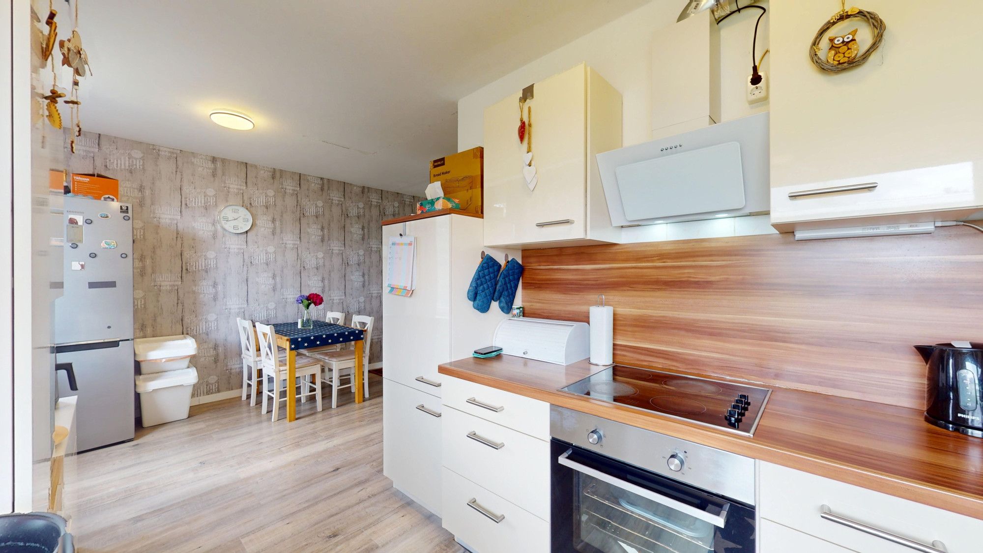 Closed kitchen (5.65 x 3.35/2.25 m) with laminate flooring and a neat corner unit with the following built-in appliances: oven, 4-burner ceramic hob, freestanding refrigerator, extractor hood, and dishwasher. Spacious living room (5.65 x 4.1 m) with laminate flooring and access to the balcony.