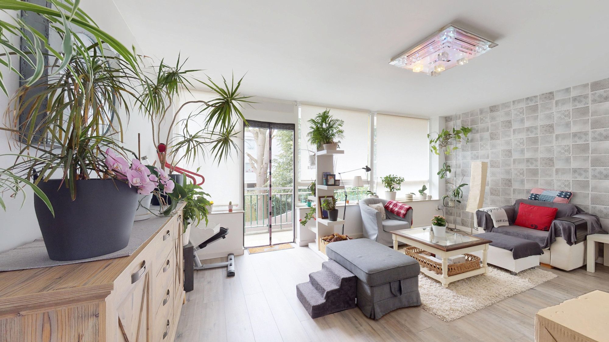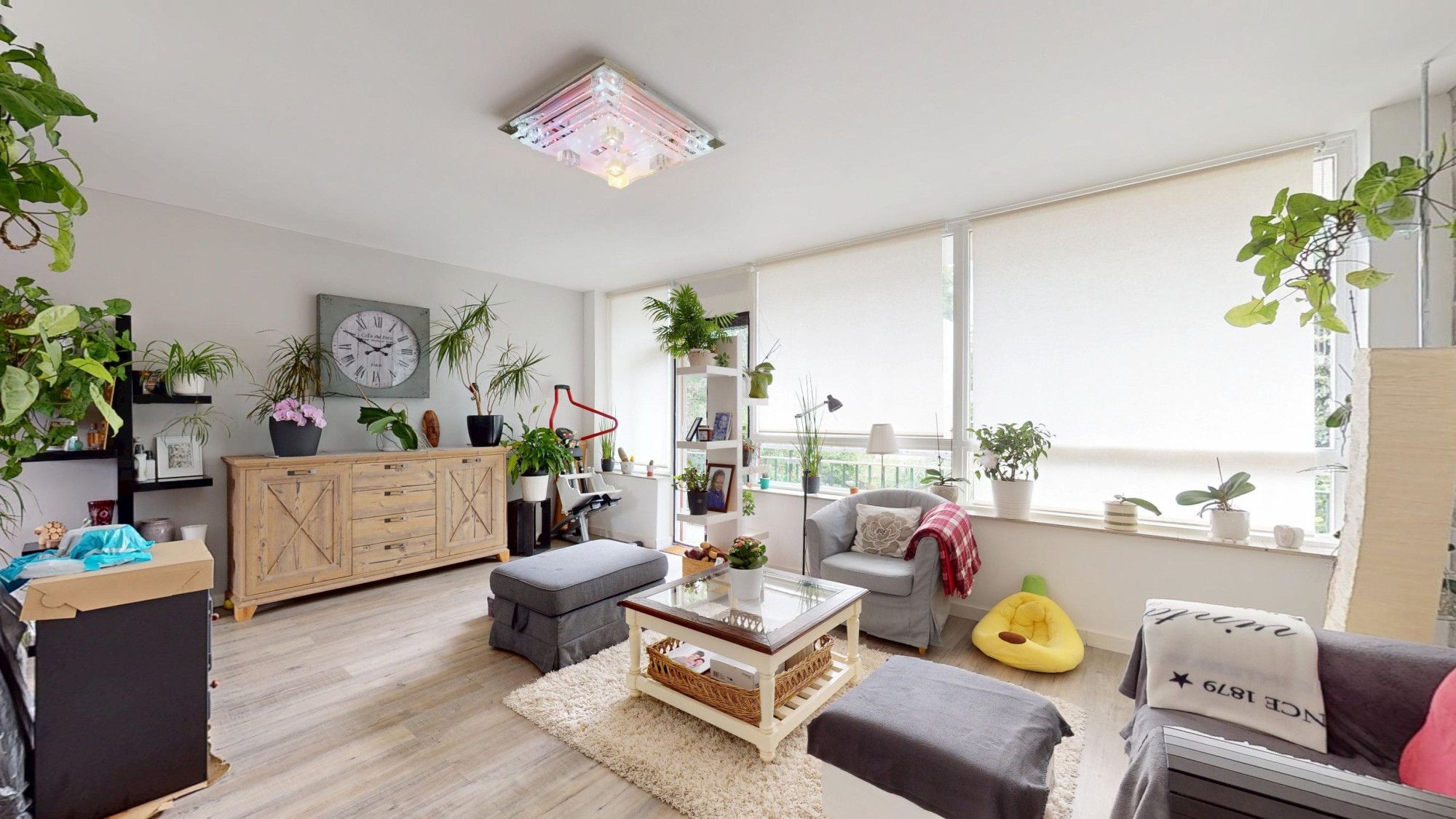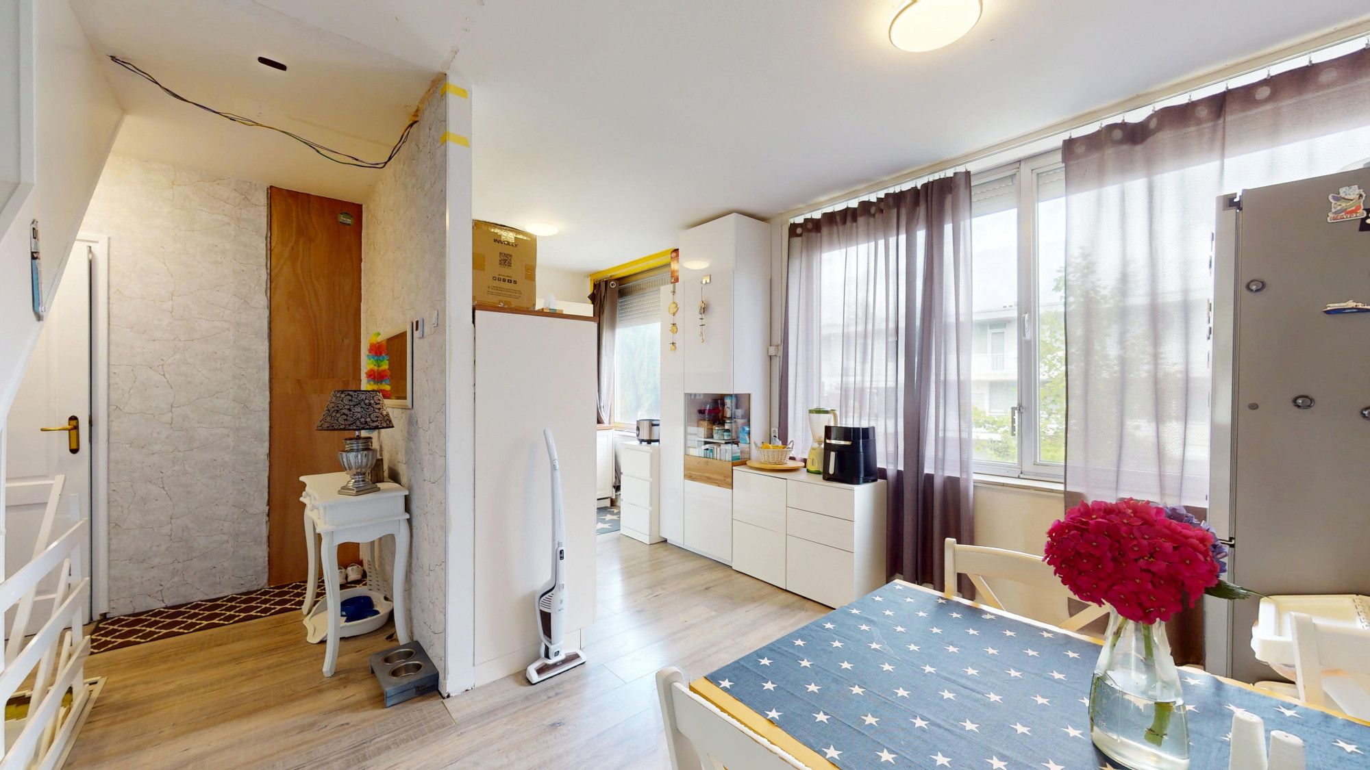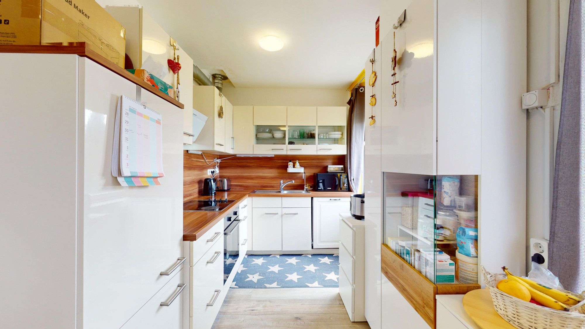 Closed kitchen (5.65 x 3.35/2.25 m) with laminate flooring and a neat corner unit with the following built-in appliances: oven, 4-burner ceramic hob, freestanding refrigerator, extractor hood, and dishwasher. Spacious living room (5.65 x 4.1 m) with laminate flooring and access to the balcony.