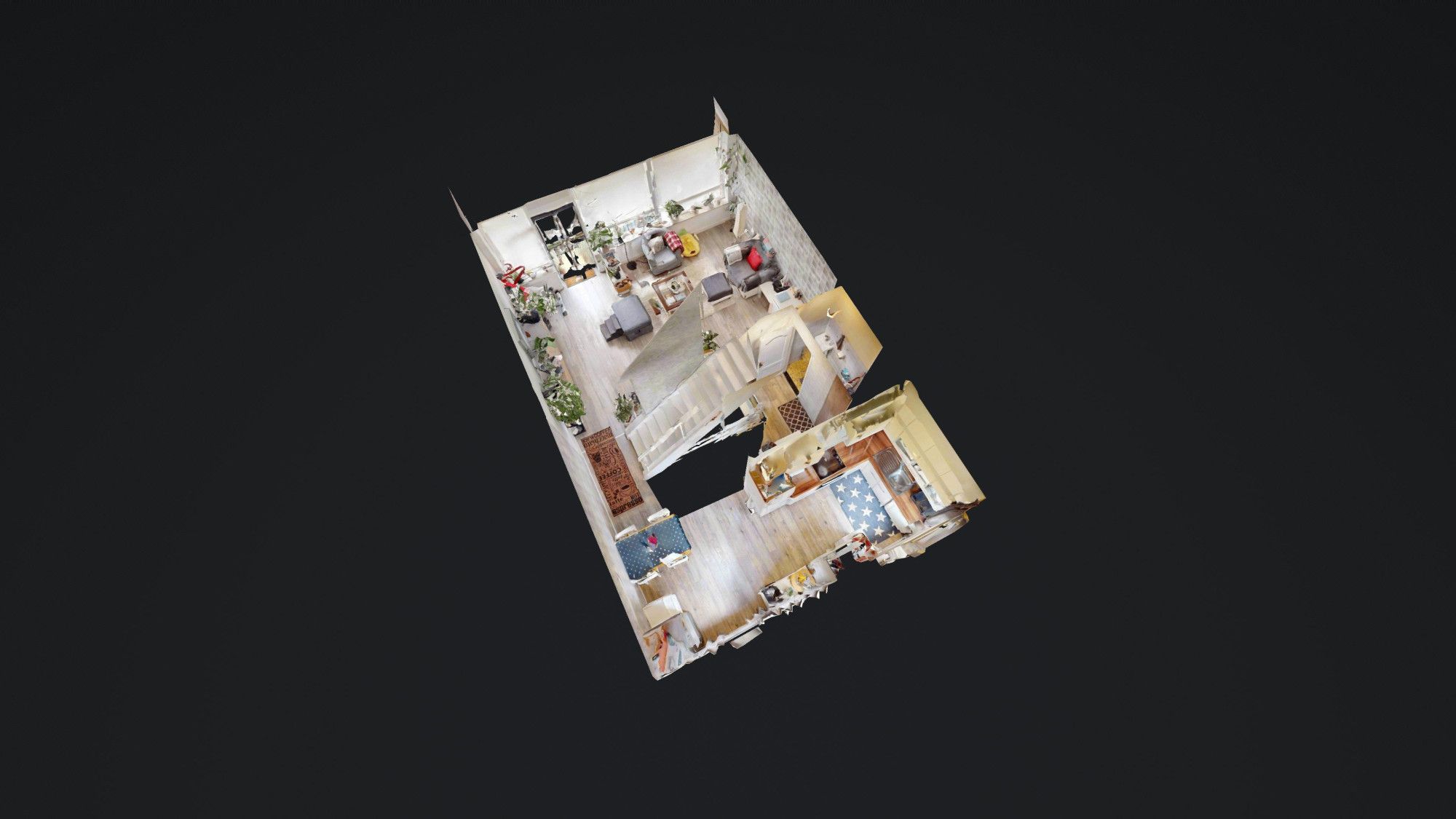Landing (2.1 x 1.9 m) with laminate flooring, with stairs to the second floor.