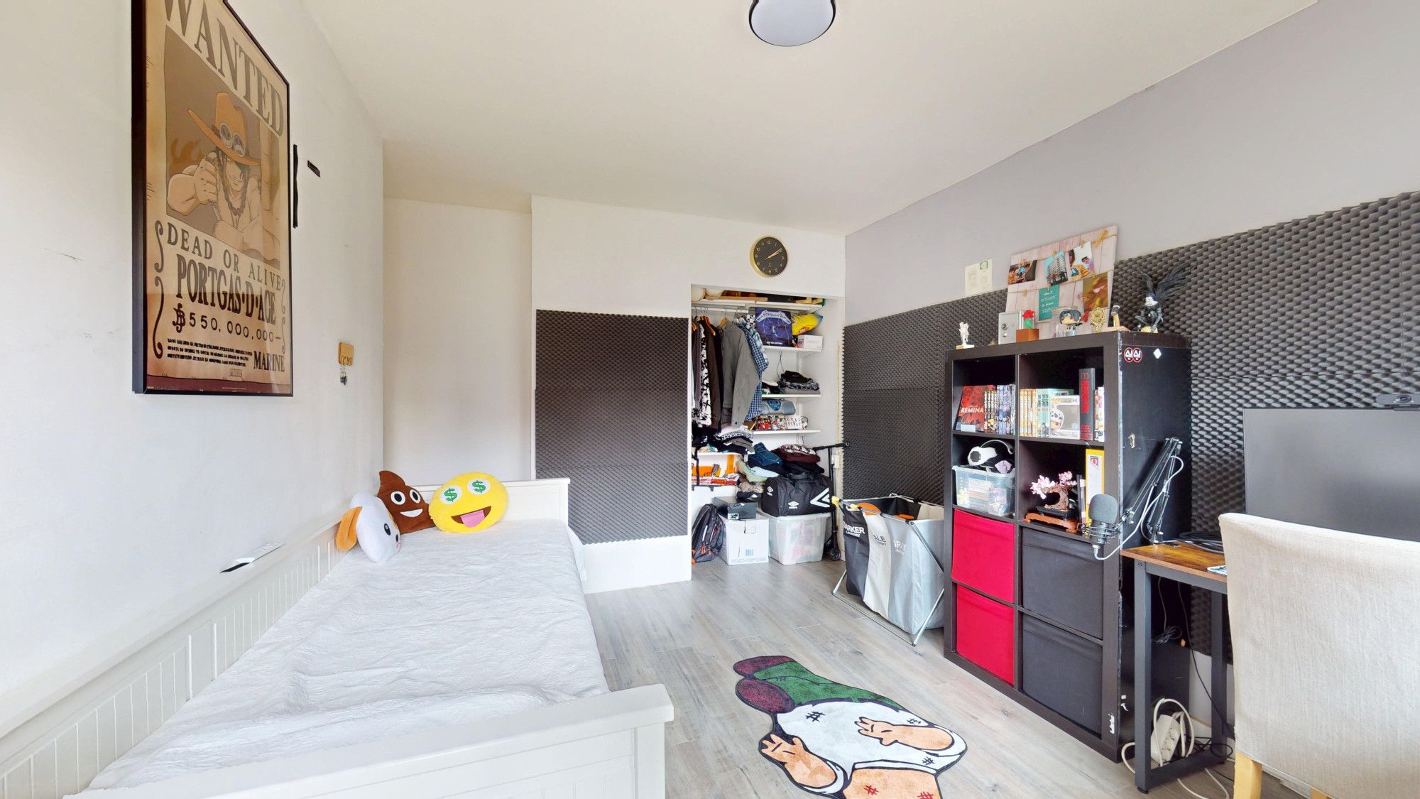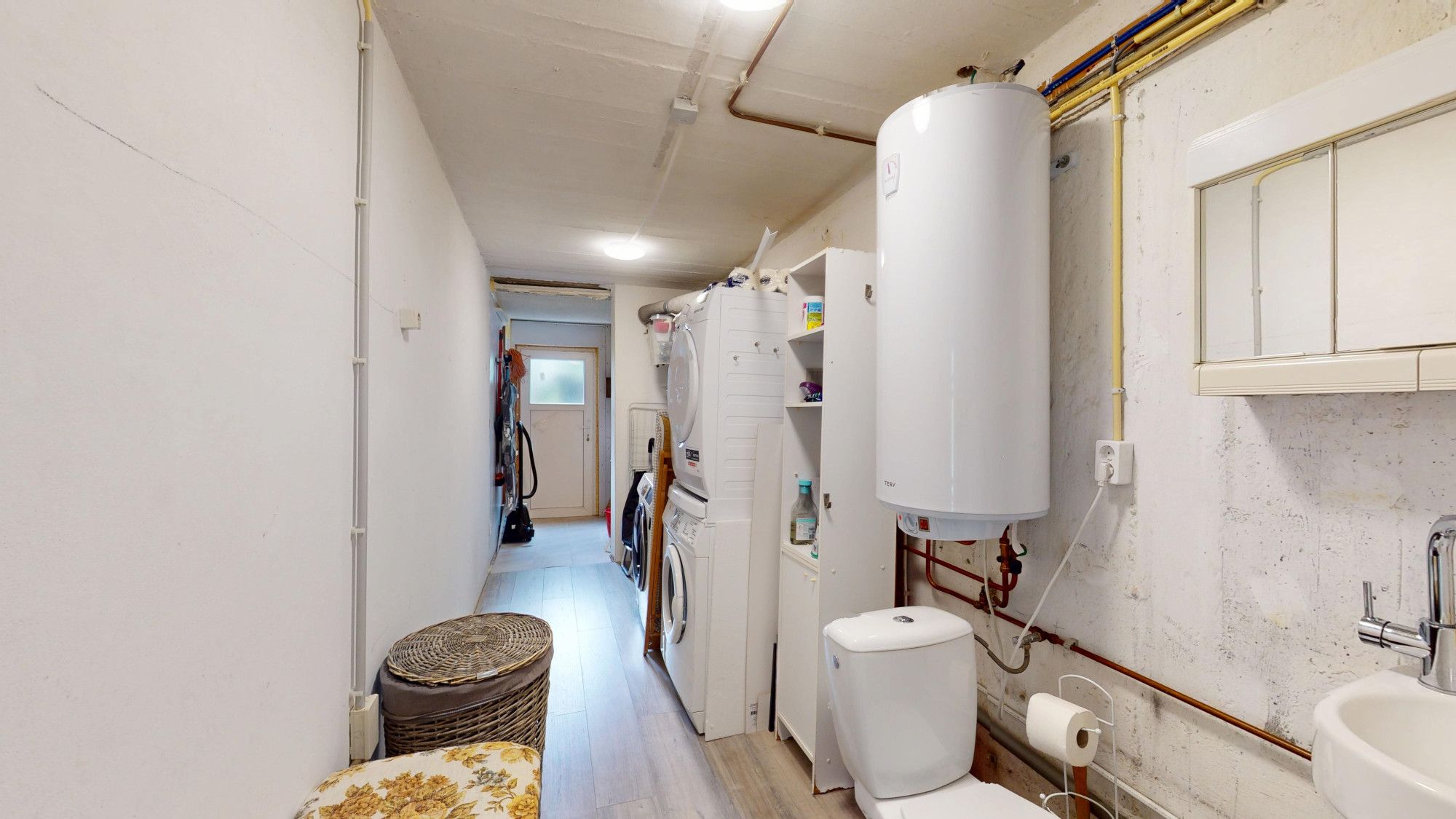 Bedroom/multipurpose room (5.1 x 3.8 m) with laminate flooring and access to the backyard. Laundry/storage room (5.7 x 1.75 m) with laminate flooring, electrical wiring, washing machine connections, electric boiler (2022, owned), and access to the back garden.