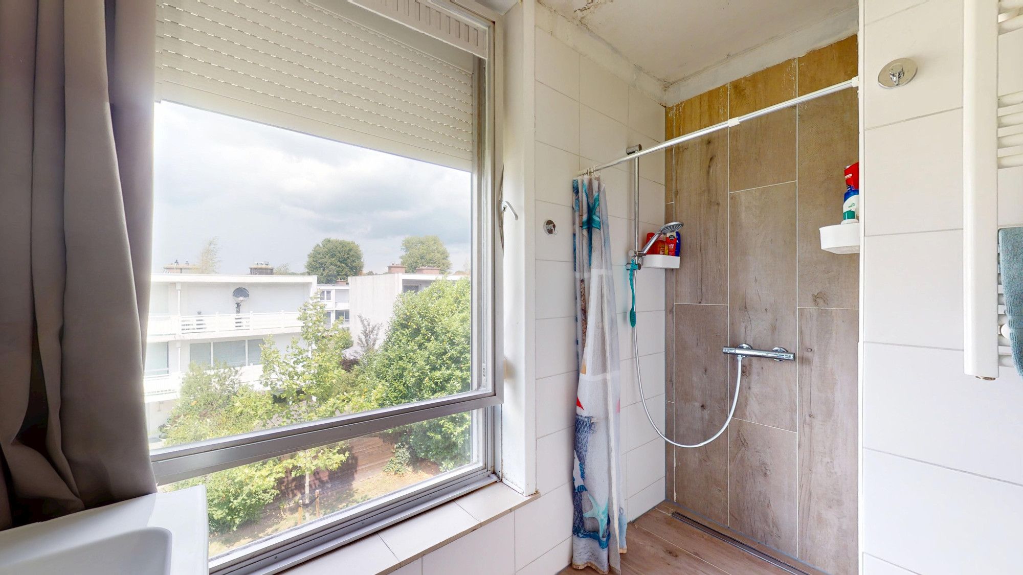 Fully tiled bathroom (2.65 x 2 m) equipped with a walk-in shower, sink, and second wall-hung toilet.