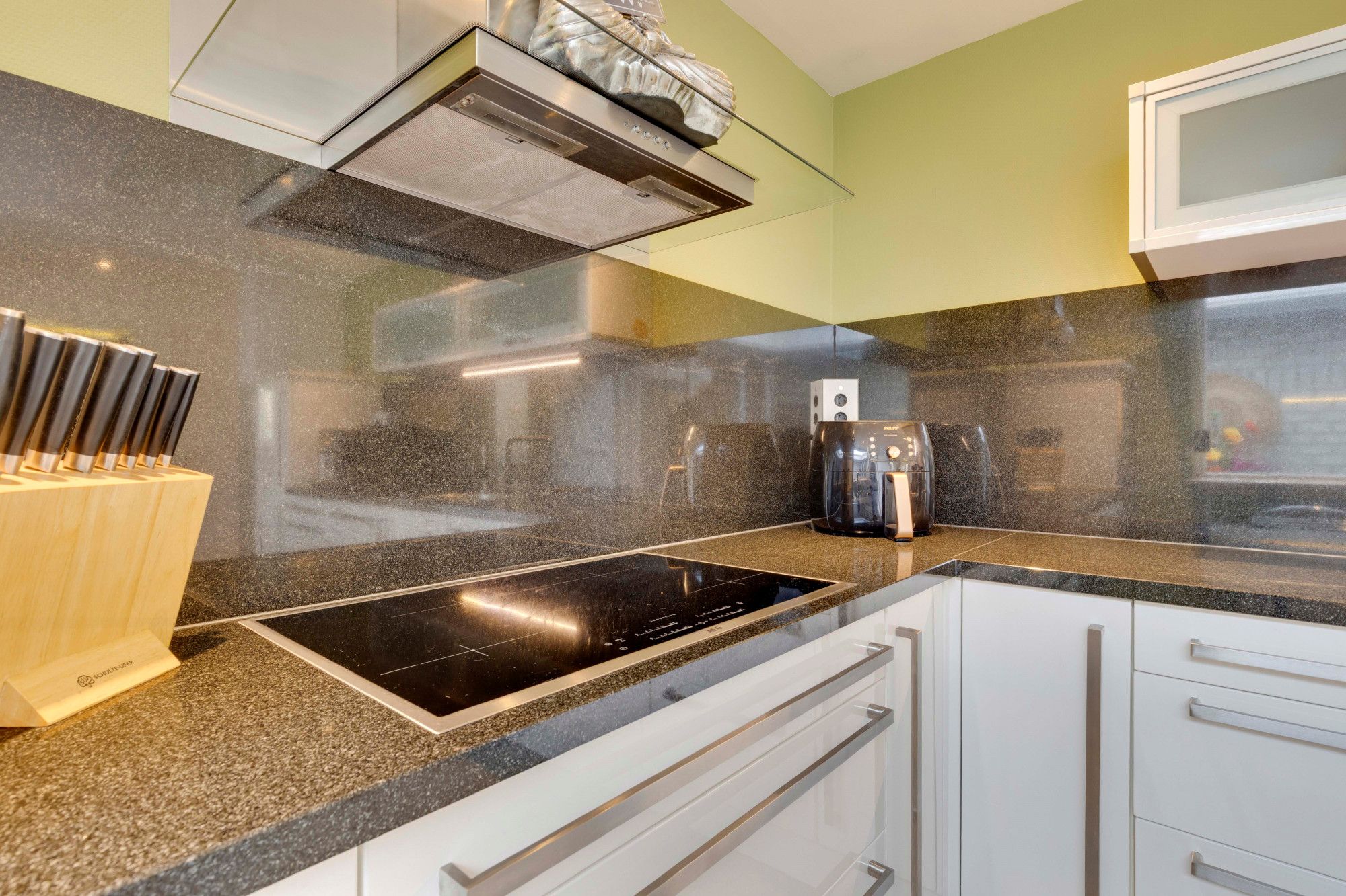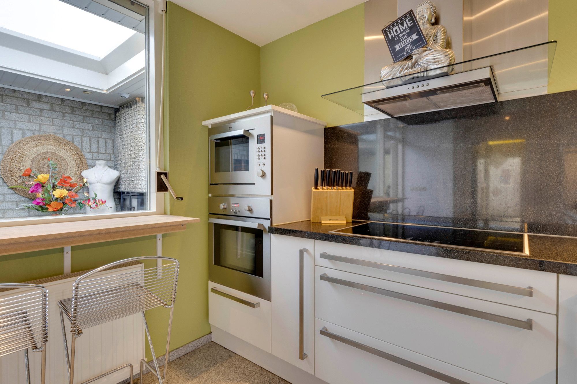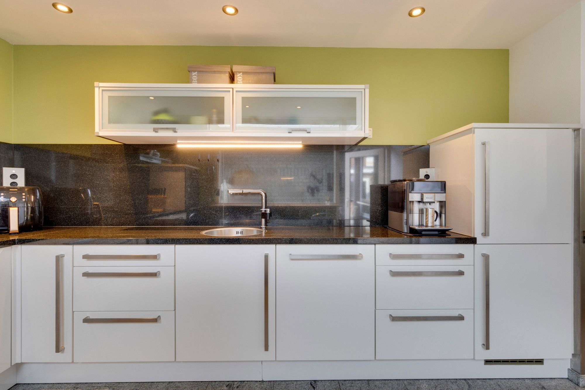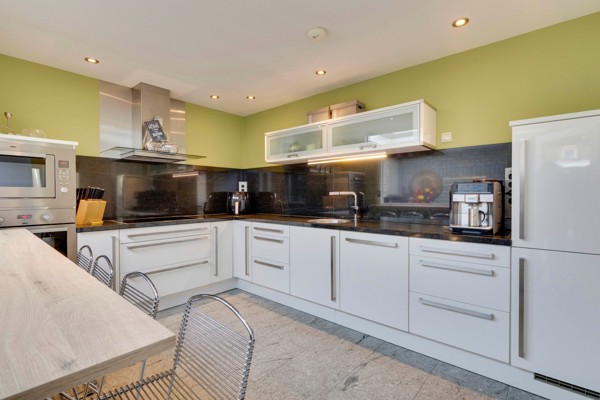 De woonkamer vloeit naadloos over in de moderne aanbouw. Hier vindt u de separate keuken in hoekopstelling, voorzien van een granieten blad en alle denkbare inbouwapparatuur (inductieplaat, combi-magnetron, heteluchtoven, vaatwasser, etc.).