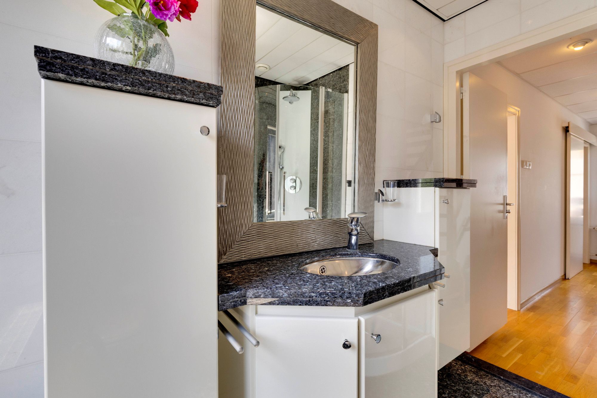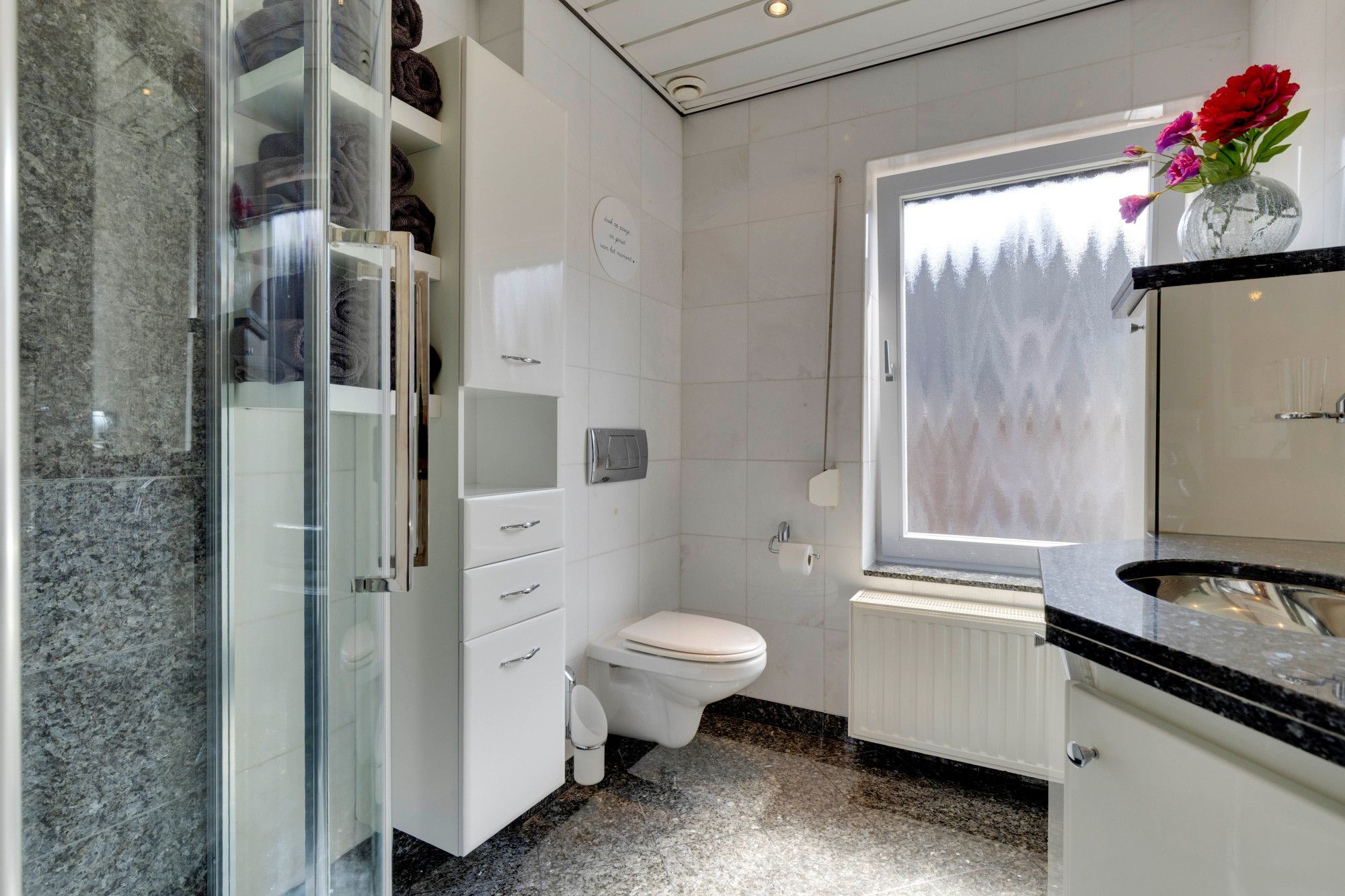 Via de fraaie hardhouten trap bereikt u de overloop met parketvloer. Deze verdieping telt twee zeer royale slaapkamers, beide netjes afgewerkt met parket. De luxe badkamer is een plaatje, met marmeren wanden, een granieten vloer, een hangtoilet, een wastafelmeubel en een hoogwaardige douchecabine (vernieuwd eind 2023).