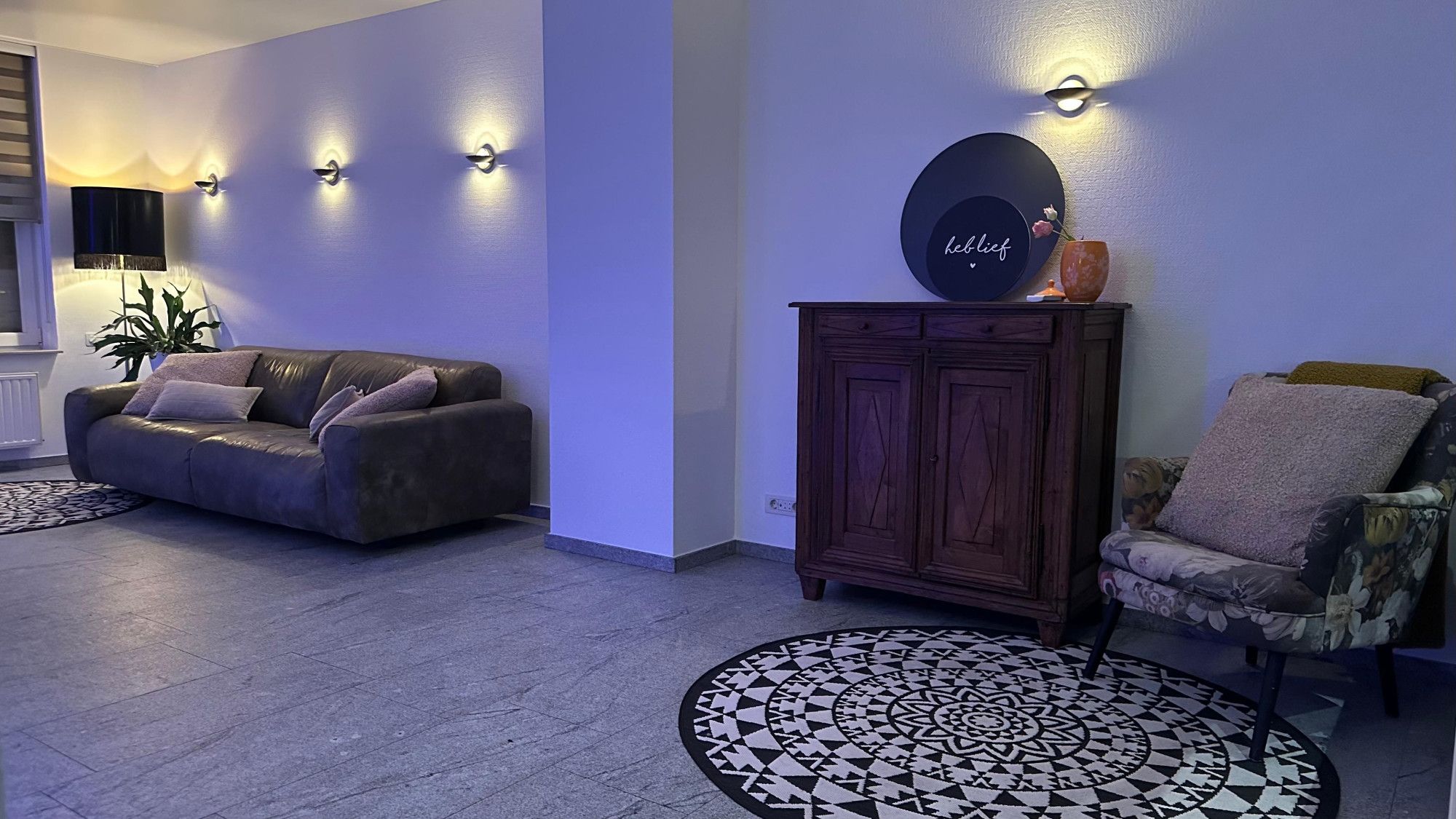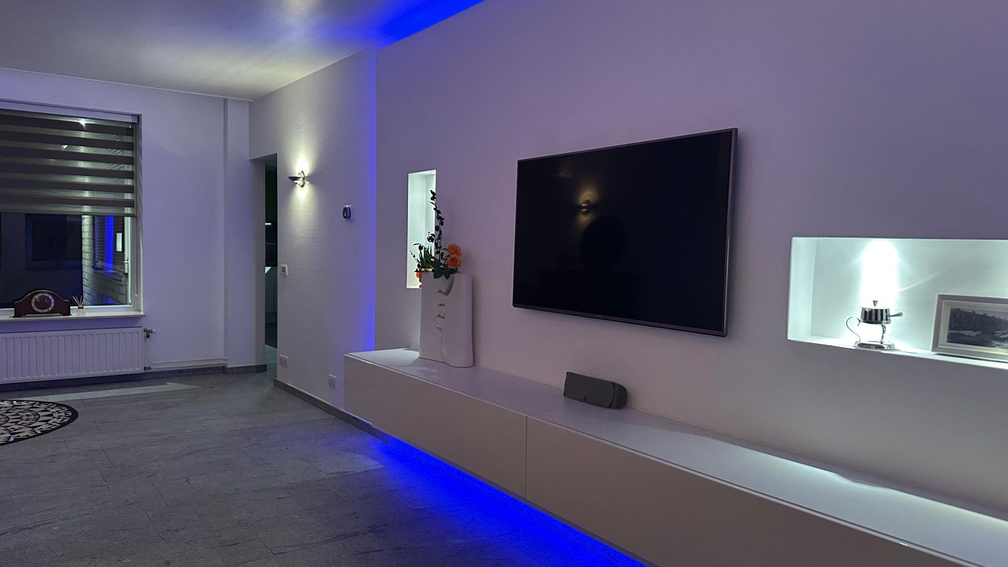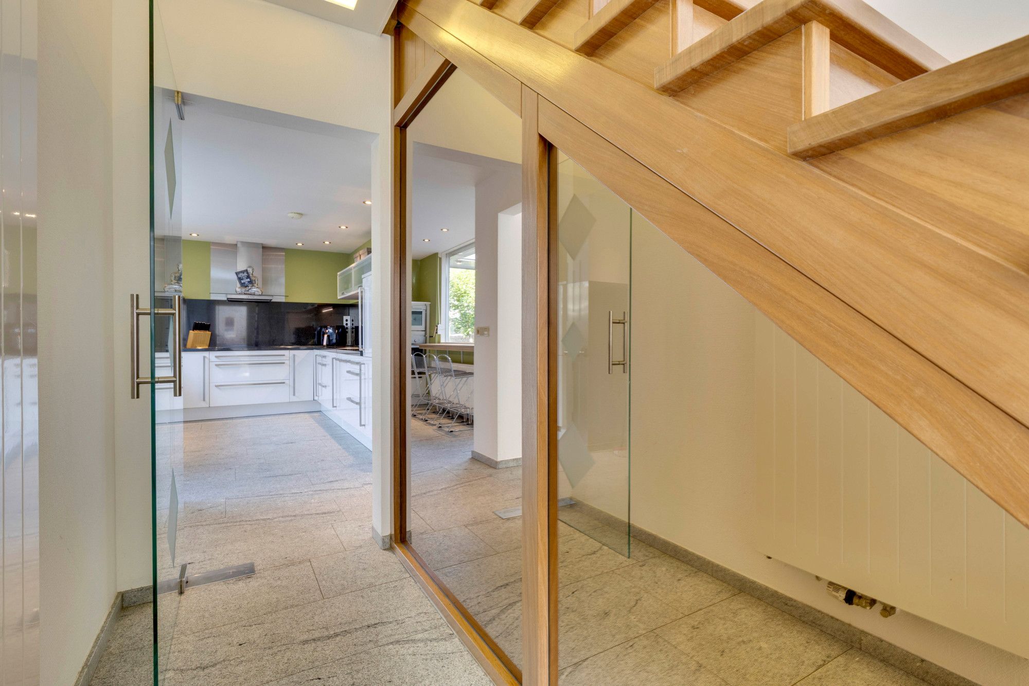 U betreedt de woning via de stijlvolle hal met indirecte verlichting en een glazen deur naar de keuken. De royale, lichte woonkamer (met airco!) heeft een mooi stucplafond en de mogelijkheid voor een houtkachel.