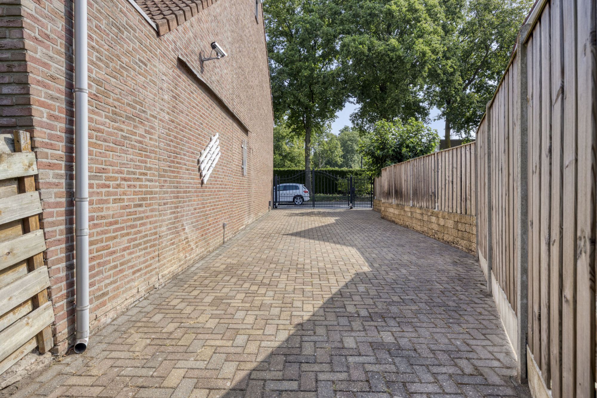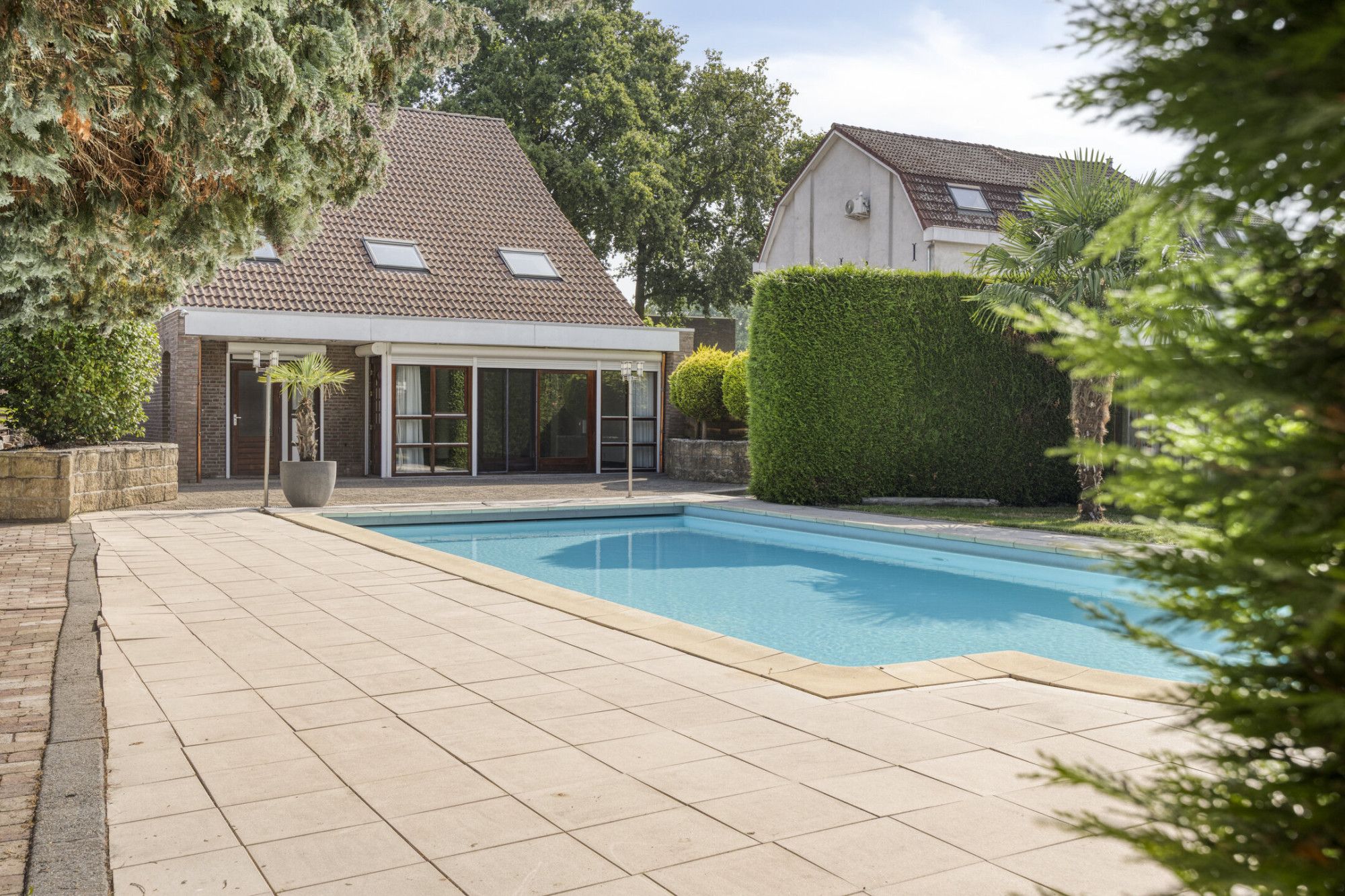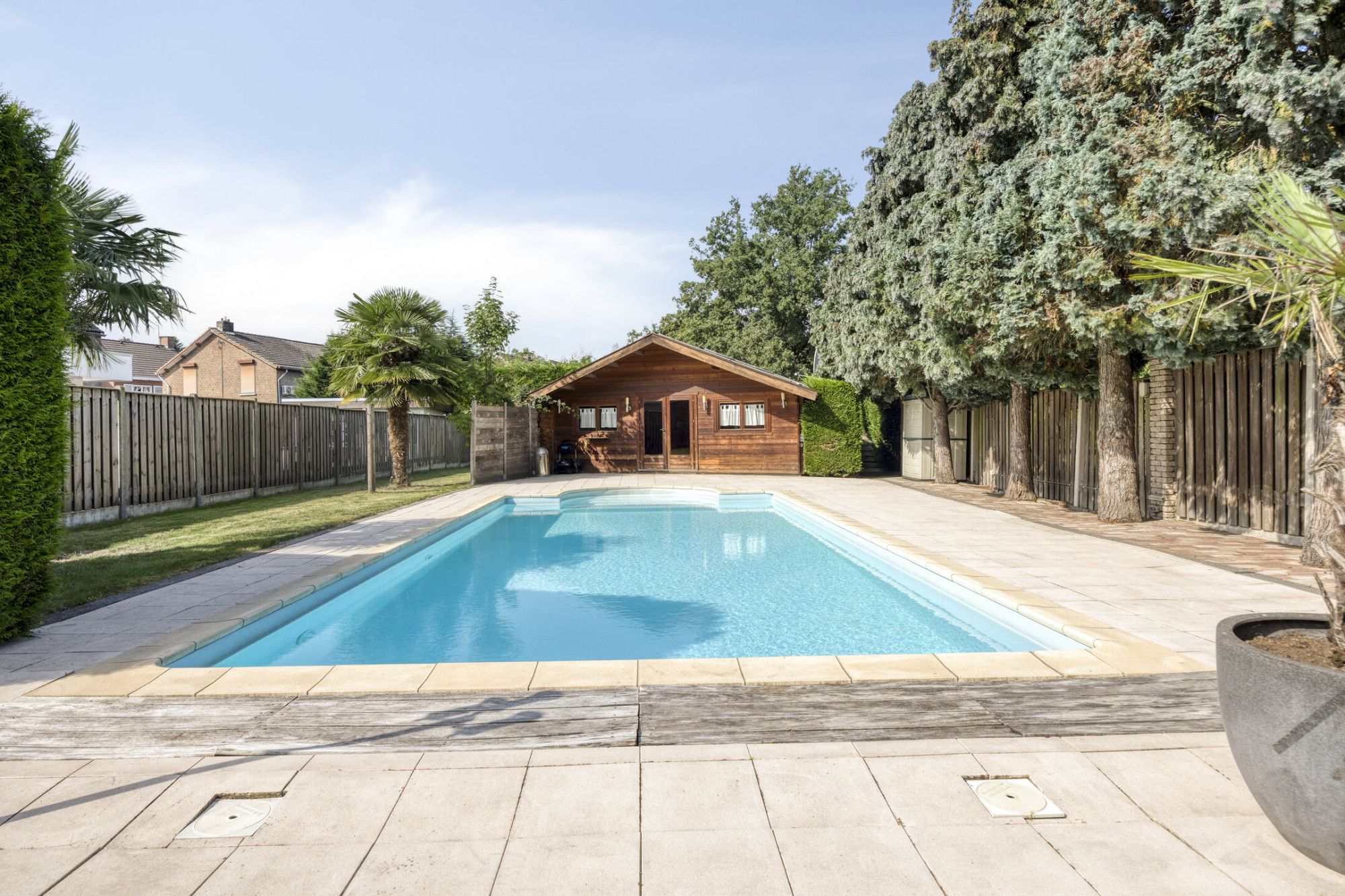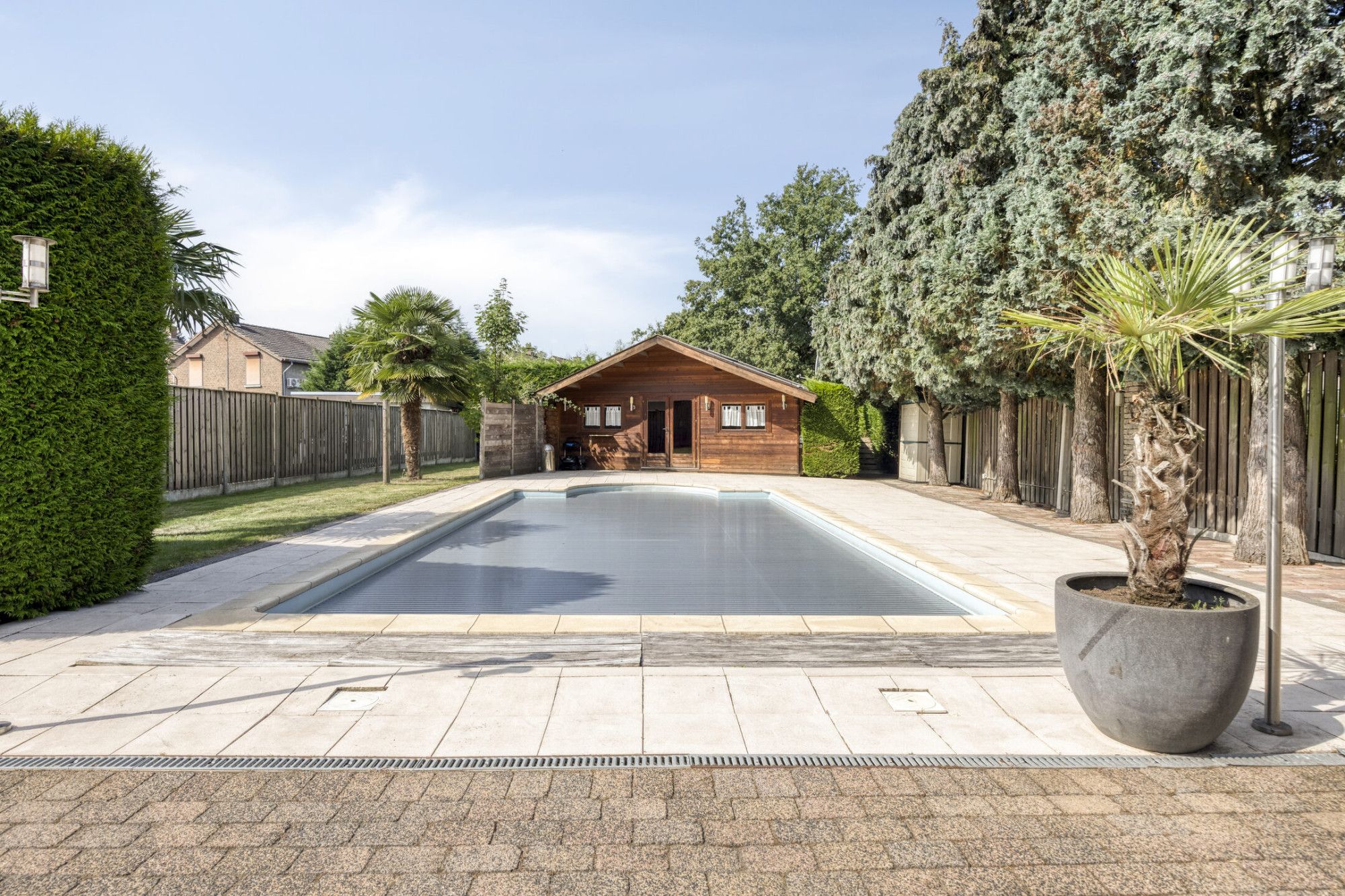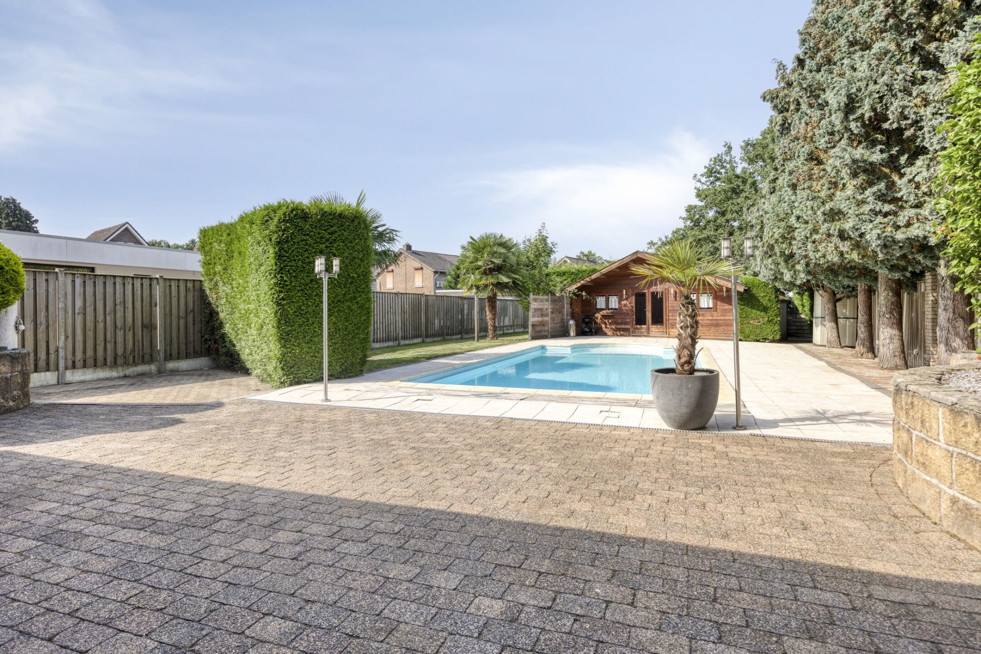 Keurig aangelegde achtertuin met terras, gazon, beplantingen en bomen. De achtertuin is bereikbaar via de woning en de oprit naast de woning. In de achtertuin is er een zwembad met toebehoren aanwezig en een riant tuinhuis met douchegelegenheid en een multifunctionele benedenruimte.