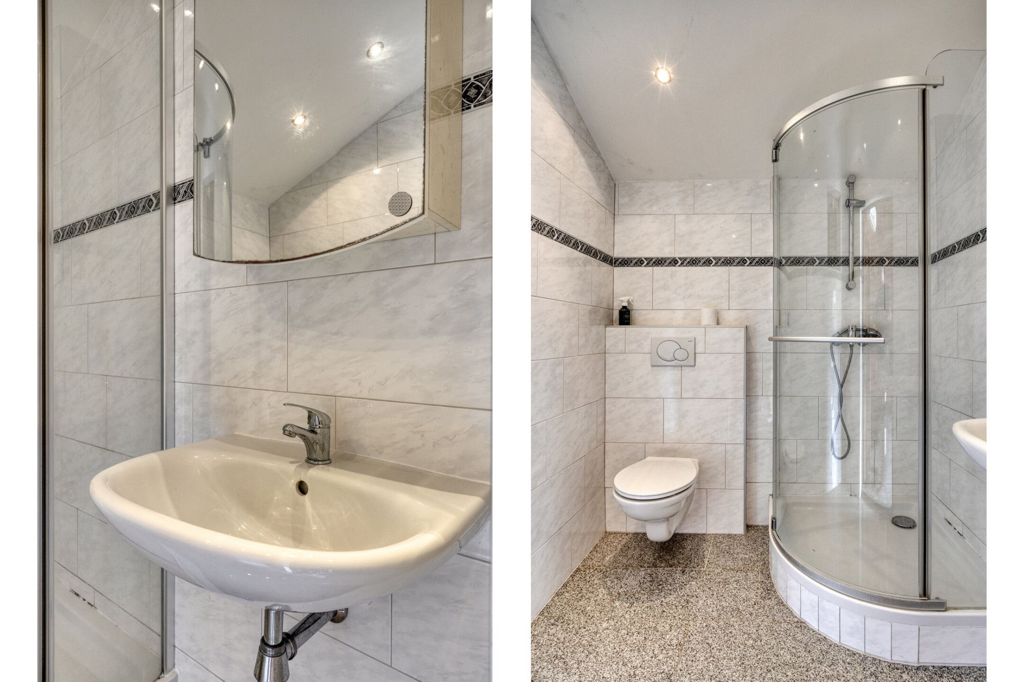 Overloop met toegang naar 3 slaapkamers. Badkamer met ligbad, douchecabine, wastafel en 2e toilet