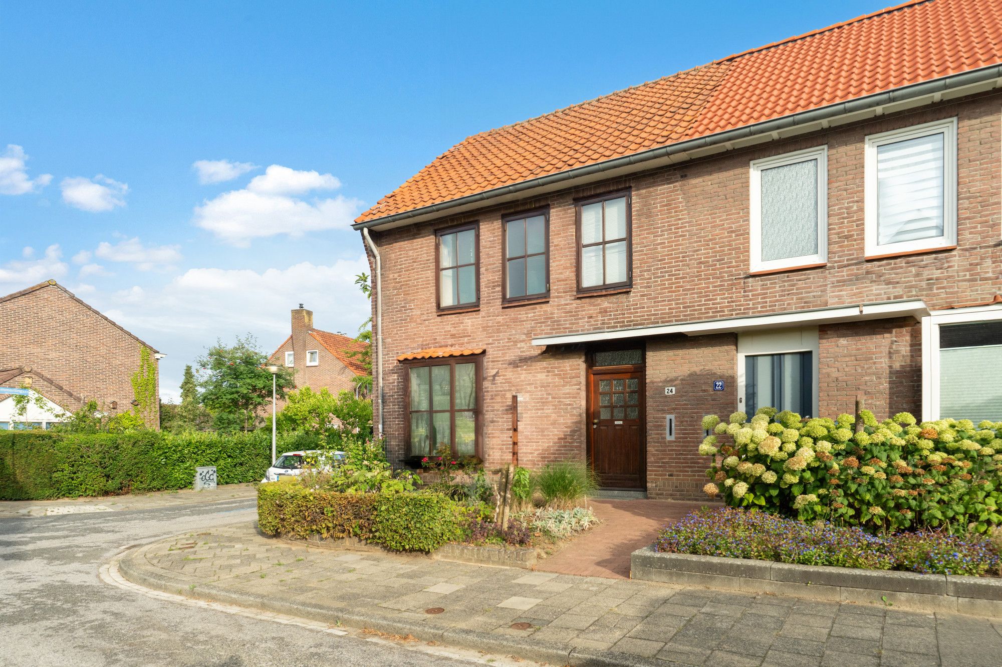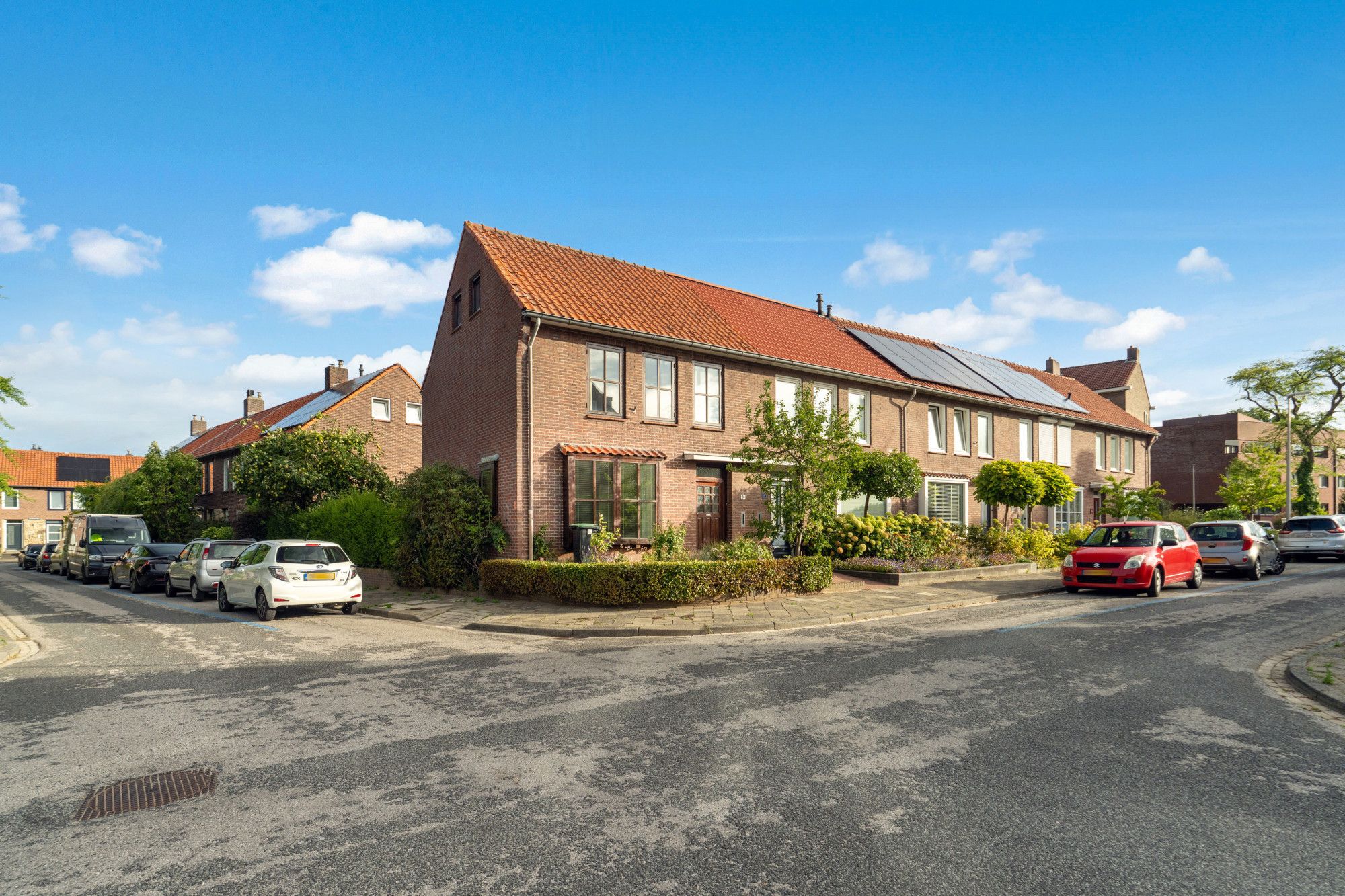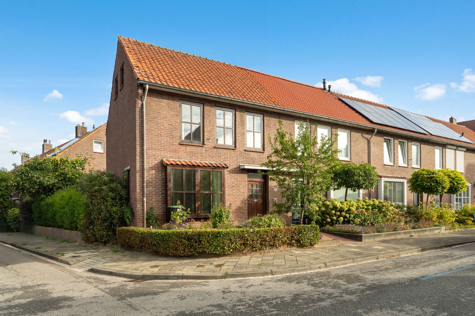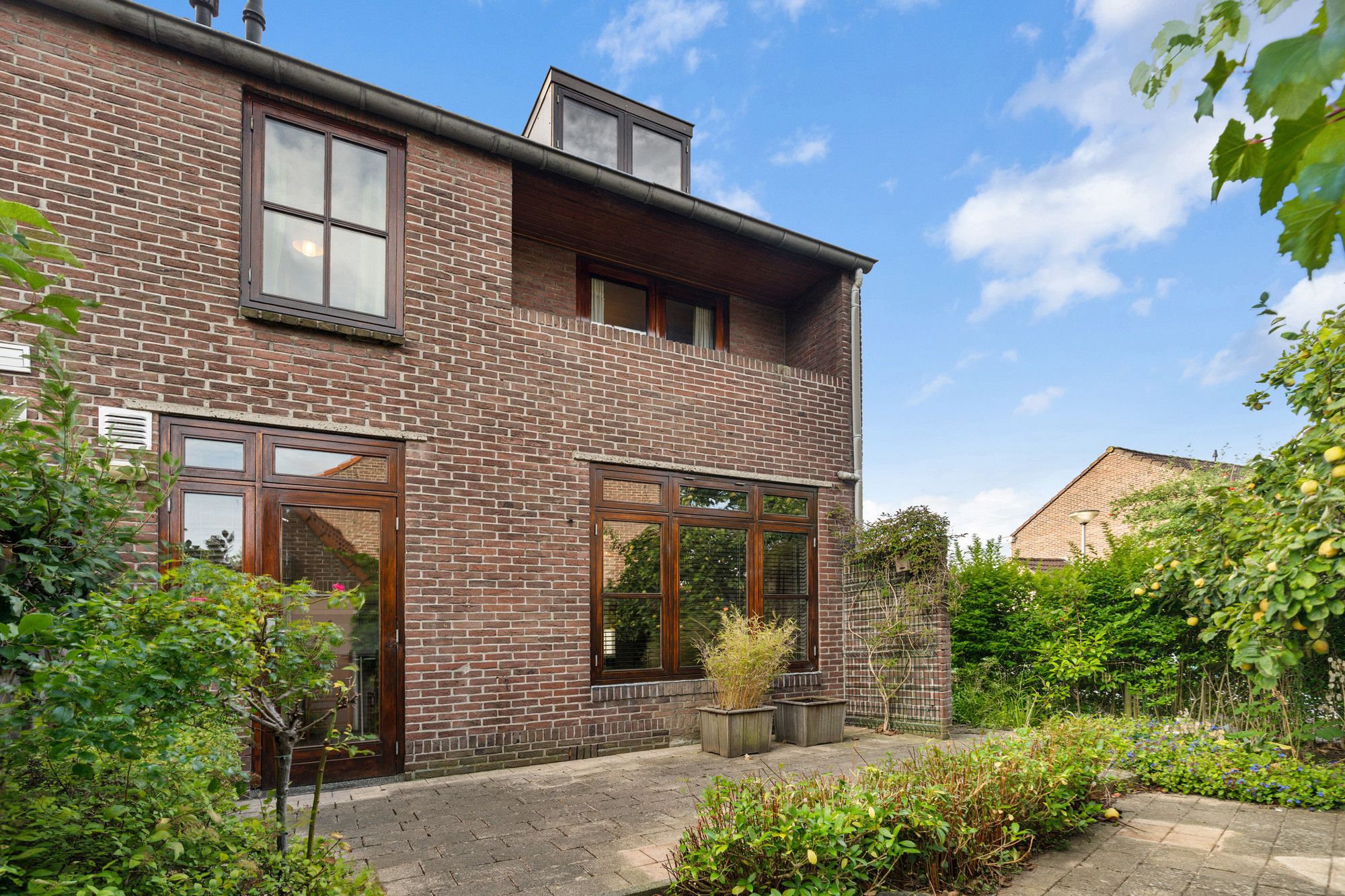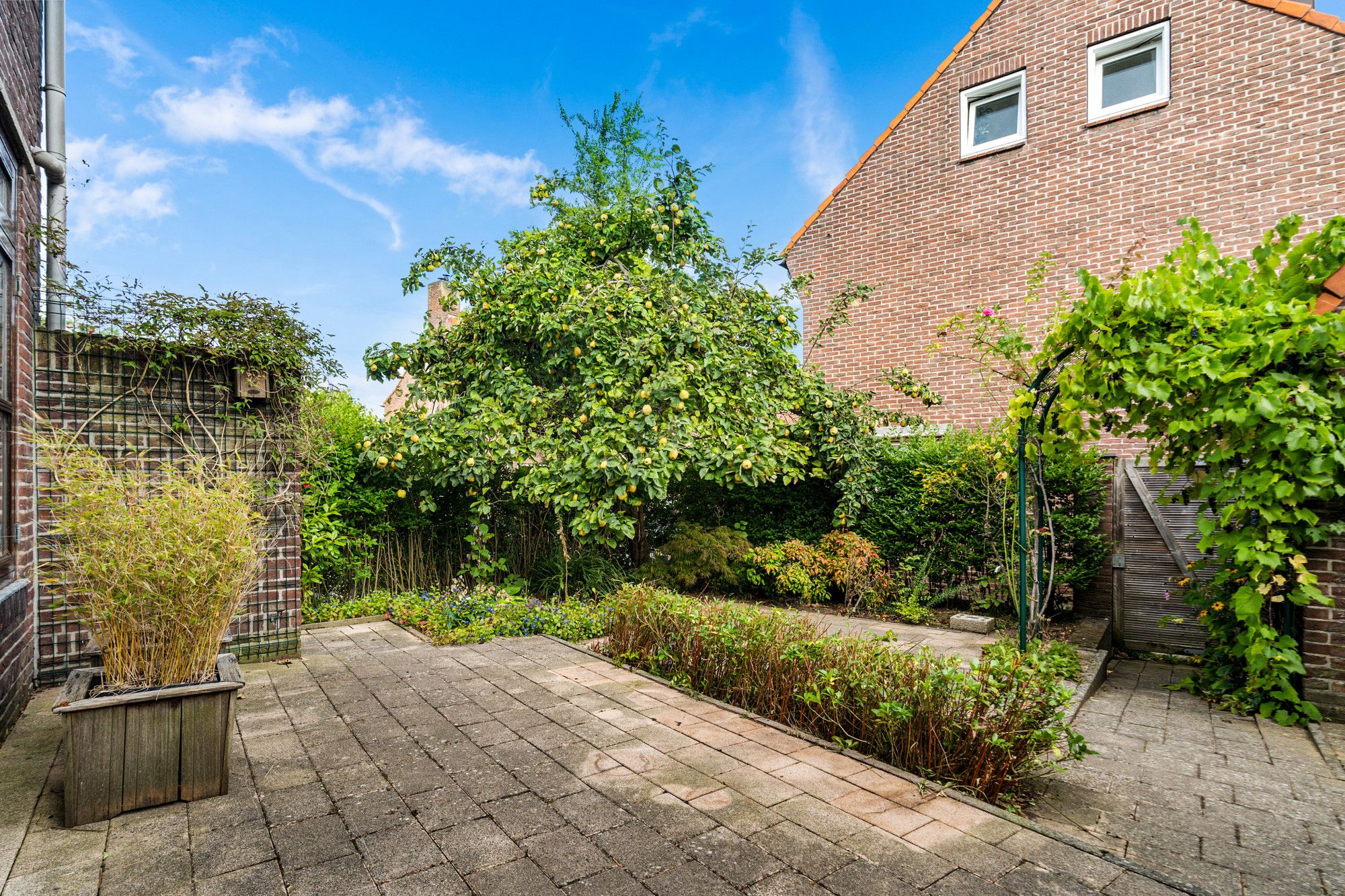 De achtertuin is grotendeels betegeld en voorzien van groene beplanting langs de zijkanten. Er is een houten omheining en een praktisch schuurtje aanwezig. Dankzij de achterom is de tuin ook via de achterzijde van het huis bereikbaar, ideaal voor fietsen of tuinmateriaal. Aan de voorzijde beschikt de woning over een kleine voortuin met groen.