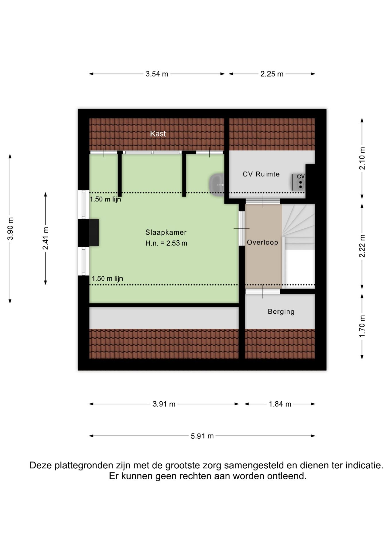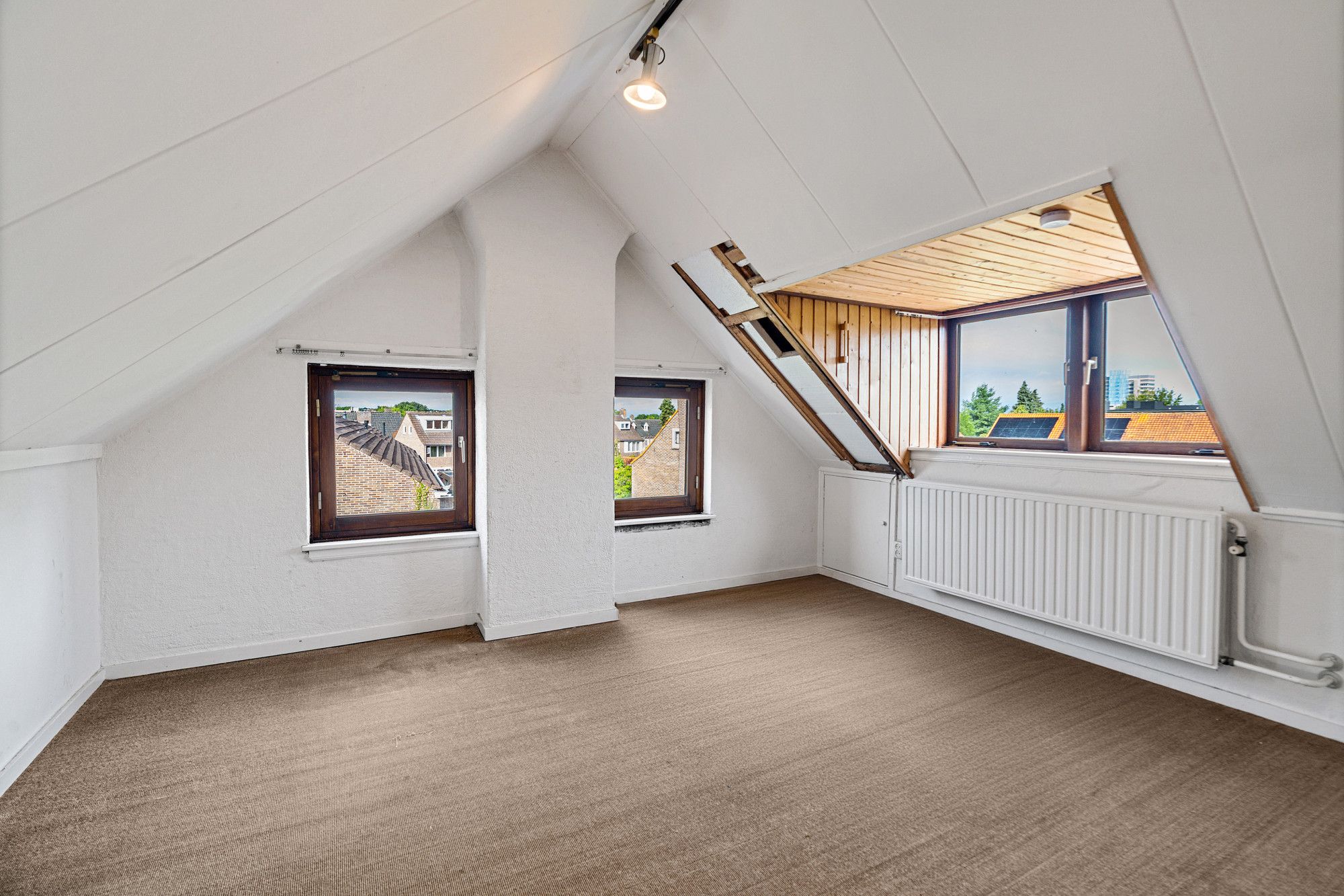De zolder is verdeeld in drie ruimtes. Hier vindt u onder andere de cv-installatie en een grote kamer met veel potentie. De grote ruimte beschikt over een wasbak en kastruimte en kan – na modernisering – uitstekend worden benut als extra slaapkamer of hobbykamer.