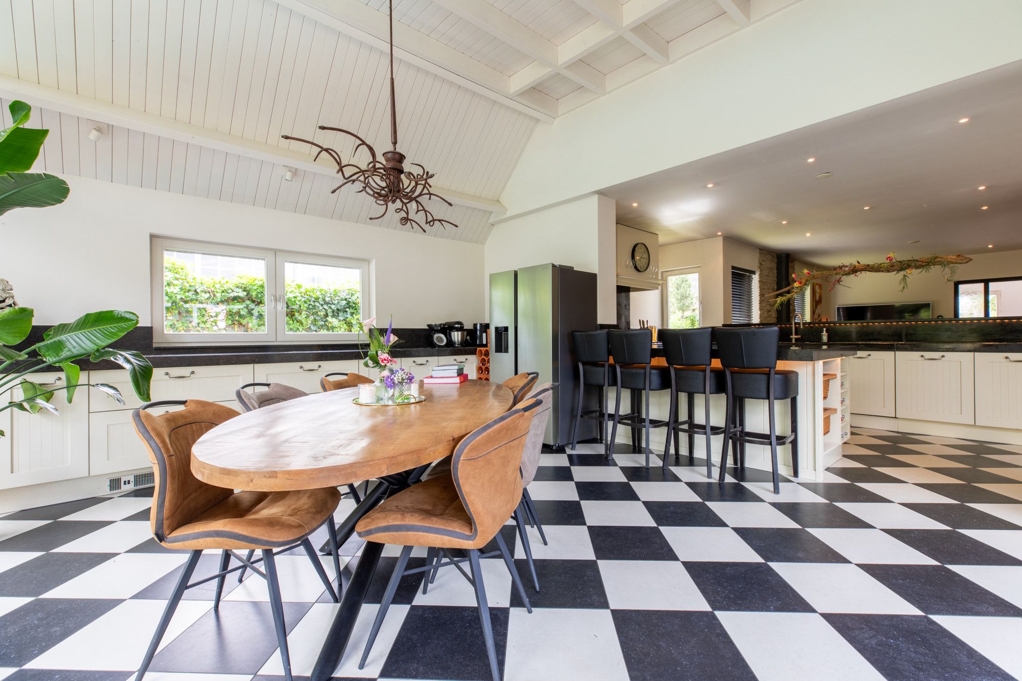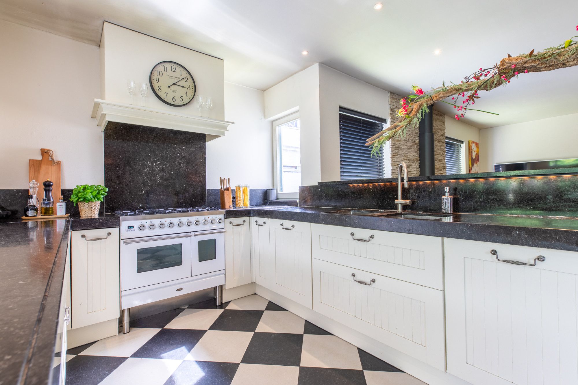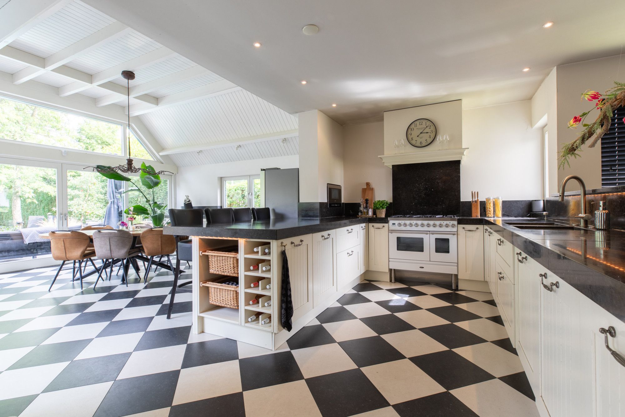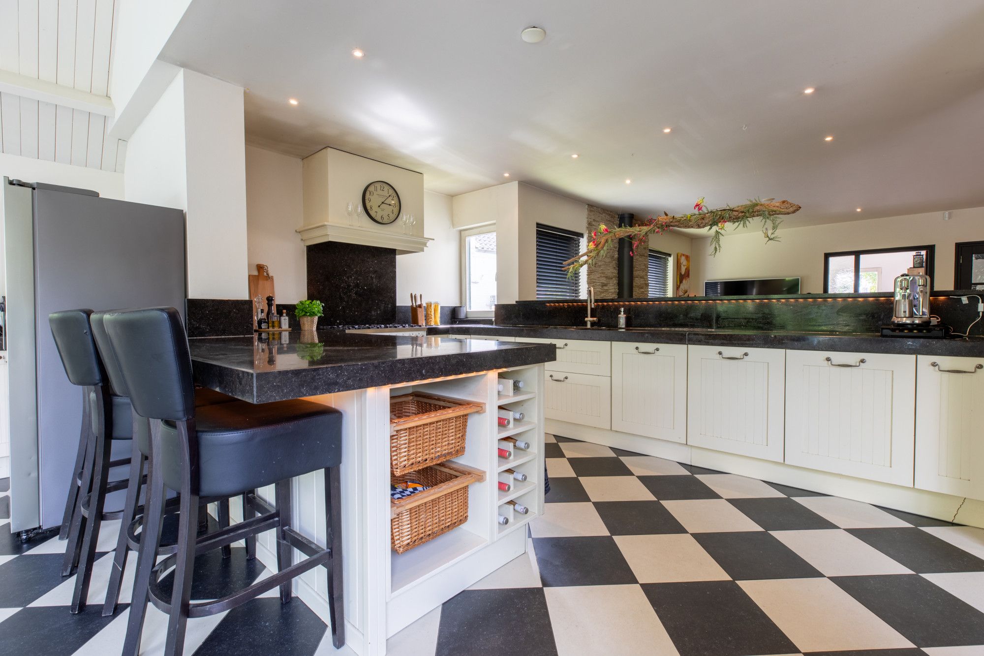Riante woon/leef keuken (5.35 x 5.23 en 4.69 x 2.91 m) eveneens voorzien van vloerverwarming met optimaal tuincontact voorzien houtkachel en luxe keuken installatie in U-opstelling (landhuisstijl) met natuurstenen werkblad en voldoende kastruimte, inbouw apparatuur te weten: vaatwasser, magnetron, vrieskast en koelkast vrijstaand 6-pits gasfornuis met afzuigkap en Amerikaanse koelkast; ruime onderkasten met koelkast in eetgedeelte met optimaal tuincontact en houtkachel, middels 2 schuifpuien toegang tot de ruime omsloten tuin met terras met zonwering, kunstgraszone, fraaie planten borders en middels warmtepomp verwarmd zwembad. Vanuit de linker oprit tevens toegang tot de omsloten tuin.