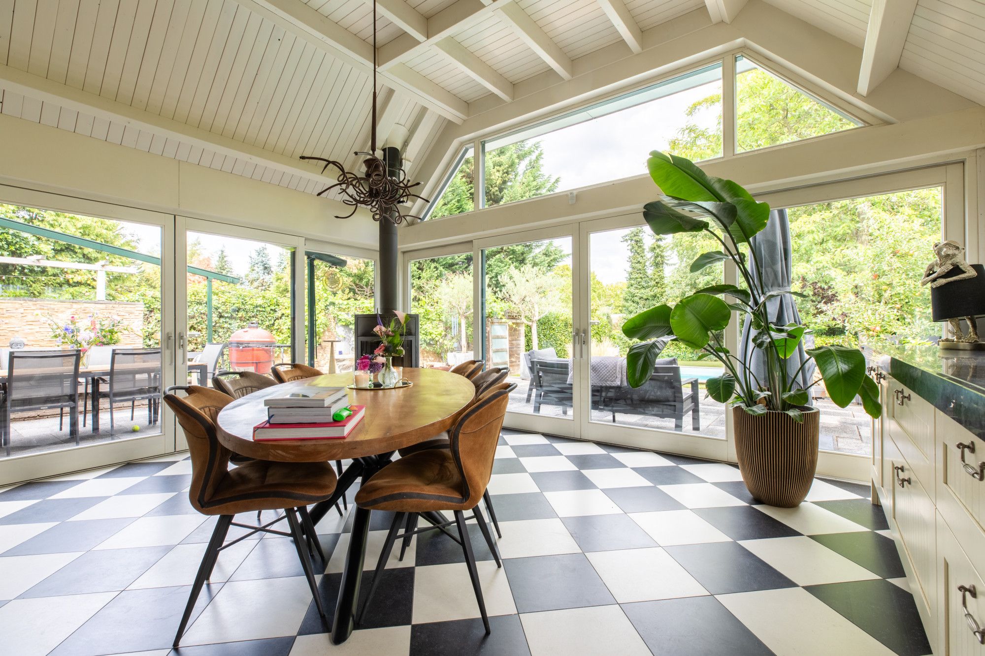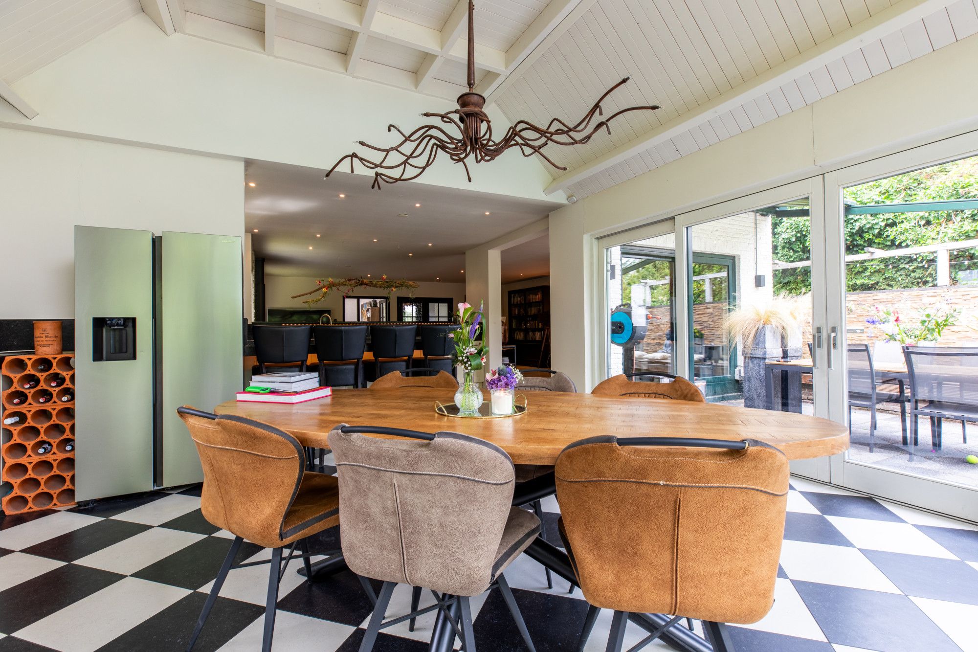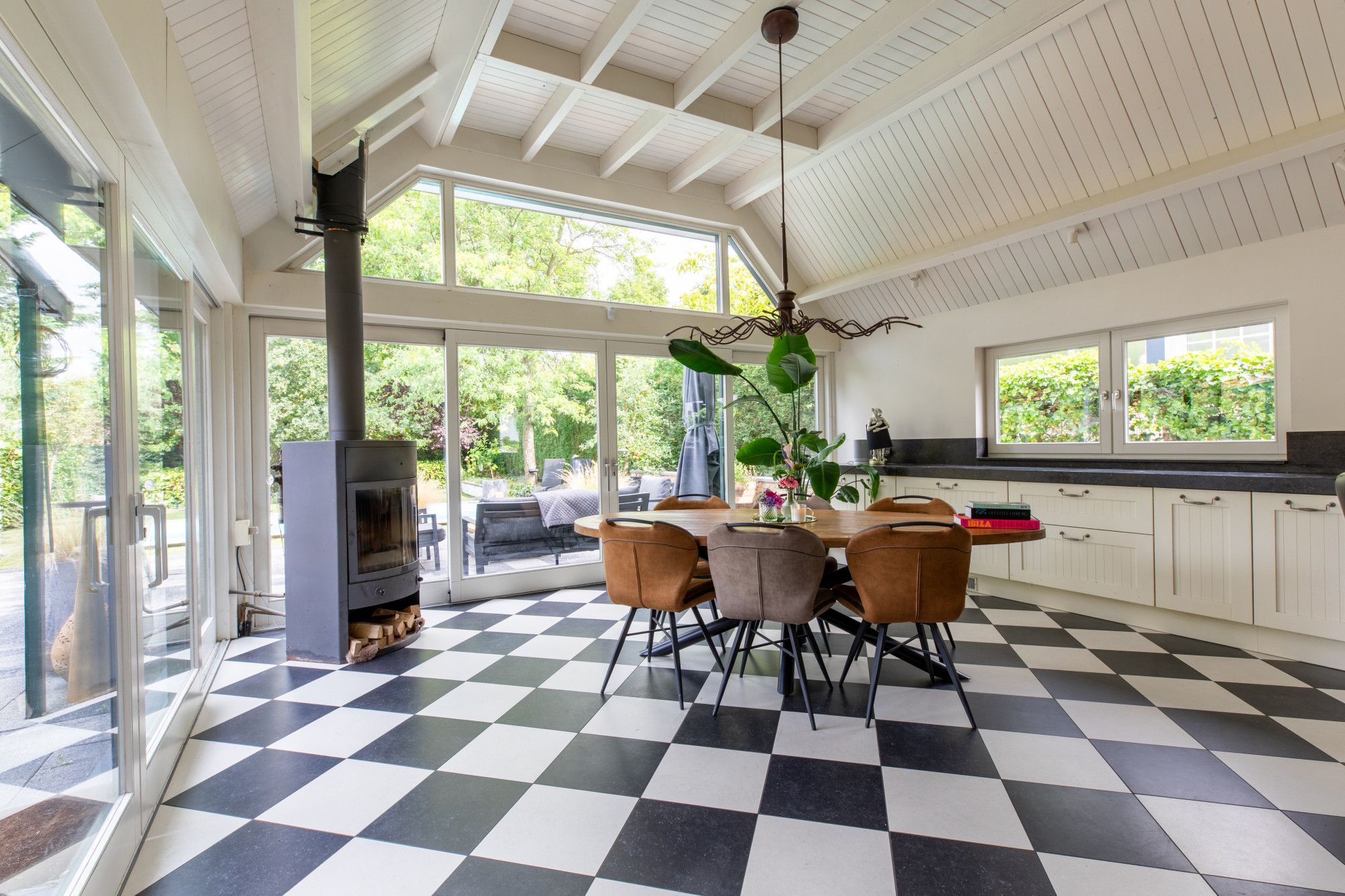 Riante woon/leef keuken (5.35 x 5.23 en 4.69 x 2.91 m) eveneens voorzien van vloerverwarming met optimaal tuincontact voorzien houtkachel en luxe keuken installatie in U-opstelling (landhuisstijl) met natuurstenen werkblad en voldoende kastruimte, inbouw apparatuur te weten: vaatwasser, magnetron, vrieskast en koelkast vrijstaand 6-pits gasfornuis met afzuigkap en Amerikaanse koelkast; ruime onderkasten met koelkast in eetgedeelte met optimaal tuincontact en houtkachel, middels 2 schuifpuien toegang tot de ruime omsloten tuin met terras met zonwering, kunstgraszone, fraaie planten borders en middels warmtepomp verwarmd zwembad. Vanuit de linker oprit tevens toegang tot de omsloten tuin.