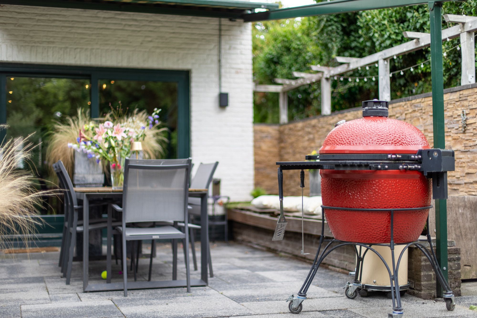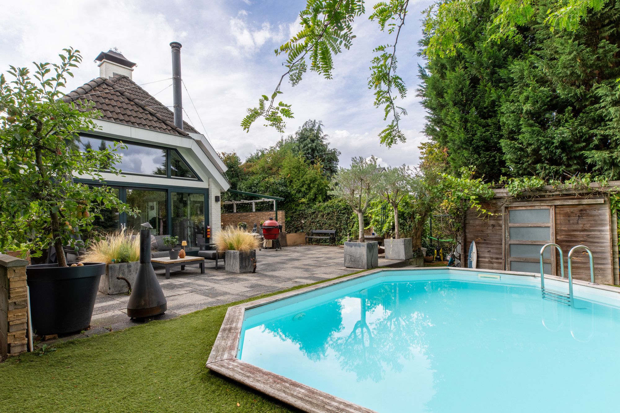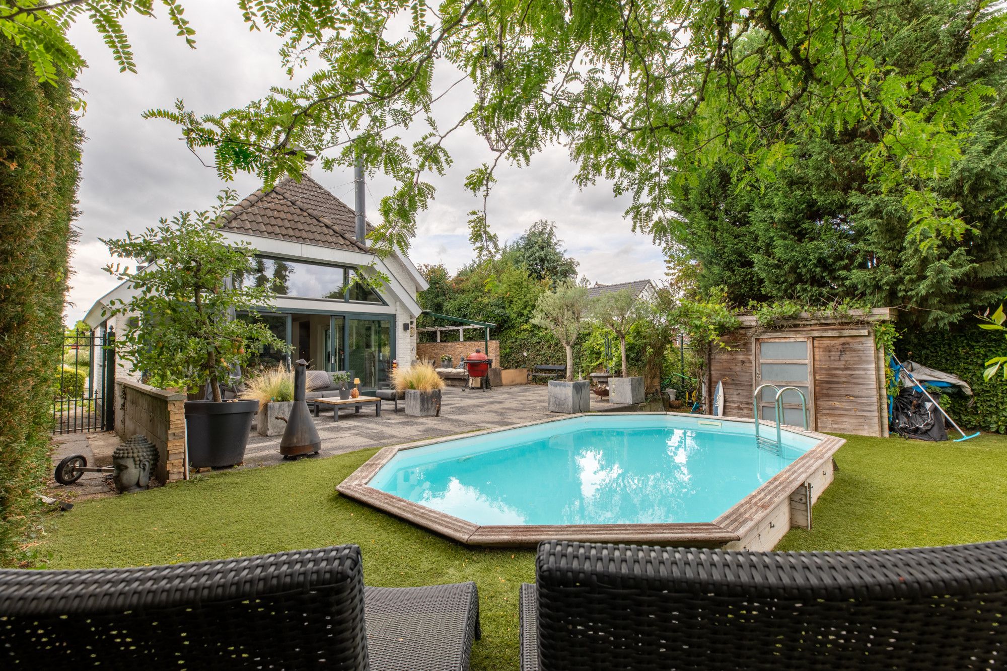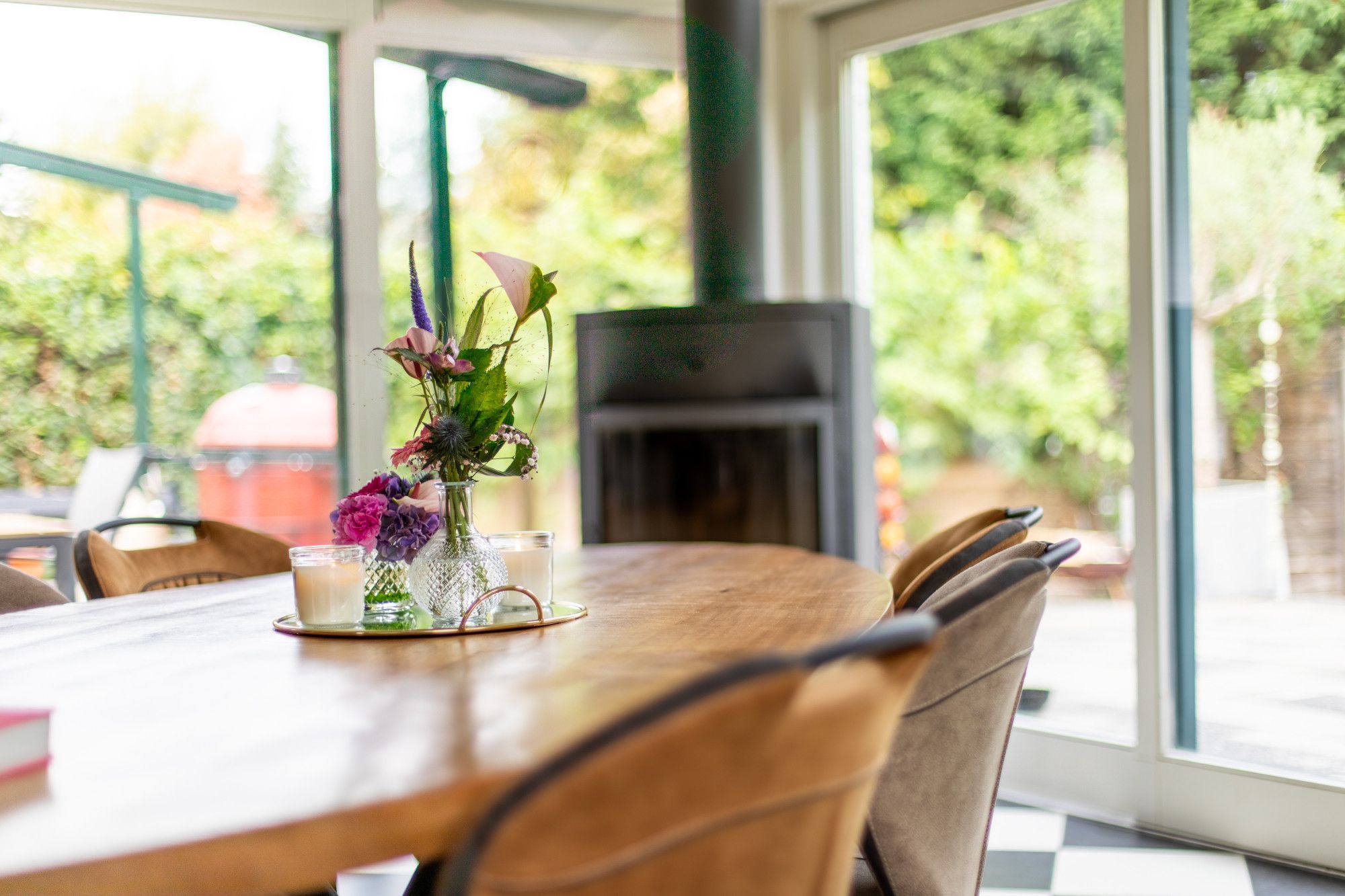 Riante woon/leef keuken (5.35 x 5.23 en 4.69 x 2.91 m) eveneens voorzien van vloerverwarming met optimaal tuincontact voorzien houtkachel en luxe keuken installatie in U-opstelling (landhuisstijl) met natuurstenen werkblad en voldoende kastruimte, inbouw apparatuur te weten: vaatwasser, magnetron, vrieskast en koelkast vrijstaand 6-pits gasfornuis met afzuigkap en Amerikaanse koelkast; ruime onderkasten met koelkast in eetgedeelte met optimaal tuincontact en houtkachel, middels 2 schuifpuien toegang tot de ruime omsloten tuin met terras met zonwering, kunstgraszone, fraaie planten borders en middels warmtepomp verwarmd zwembad. Vanuit de linker oprit tevens toegang tot de omsloten tuin.