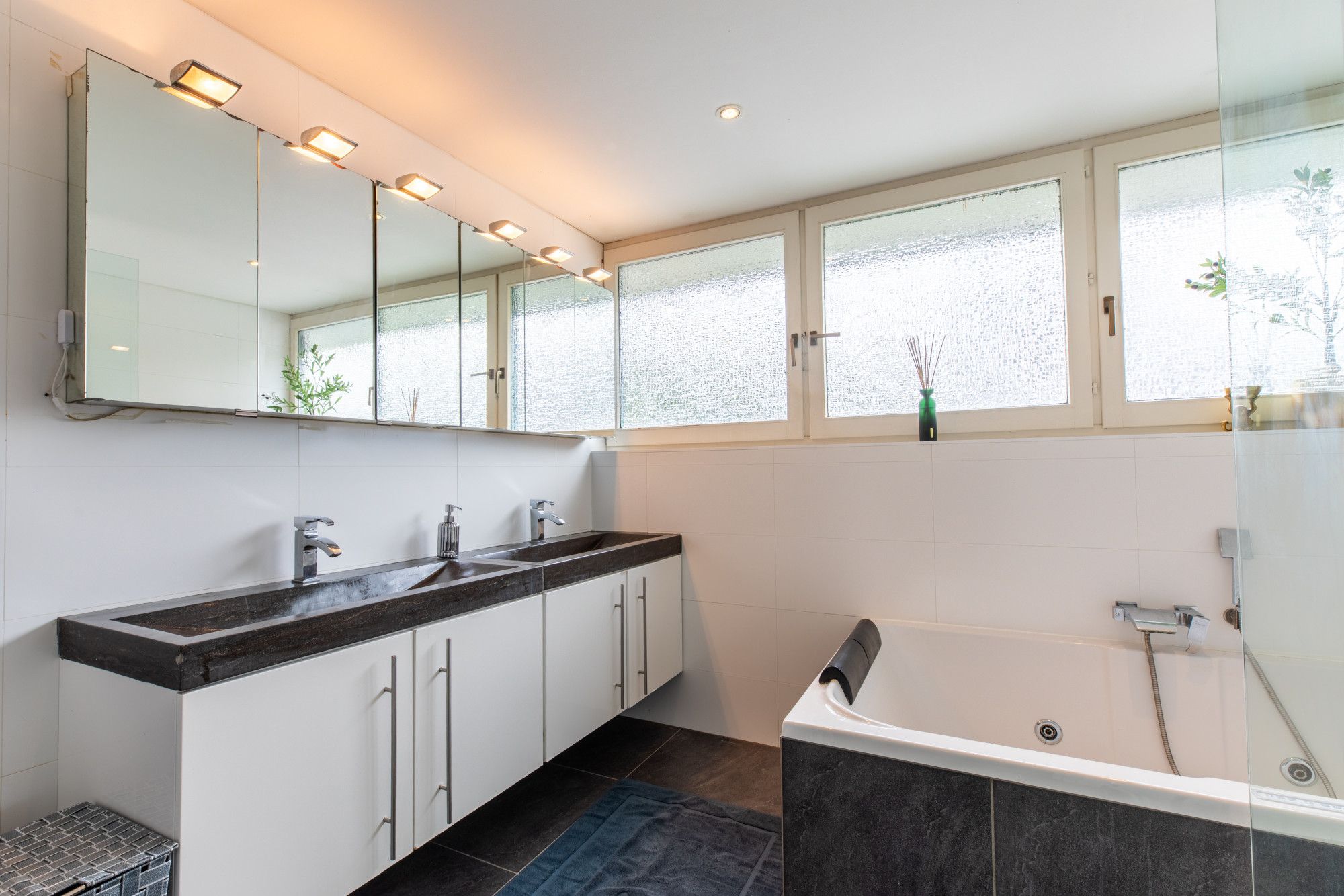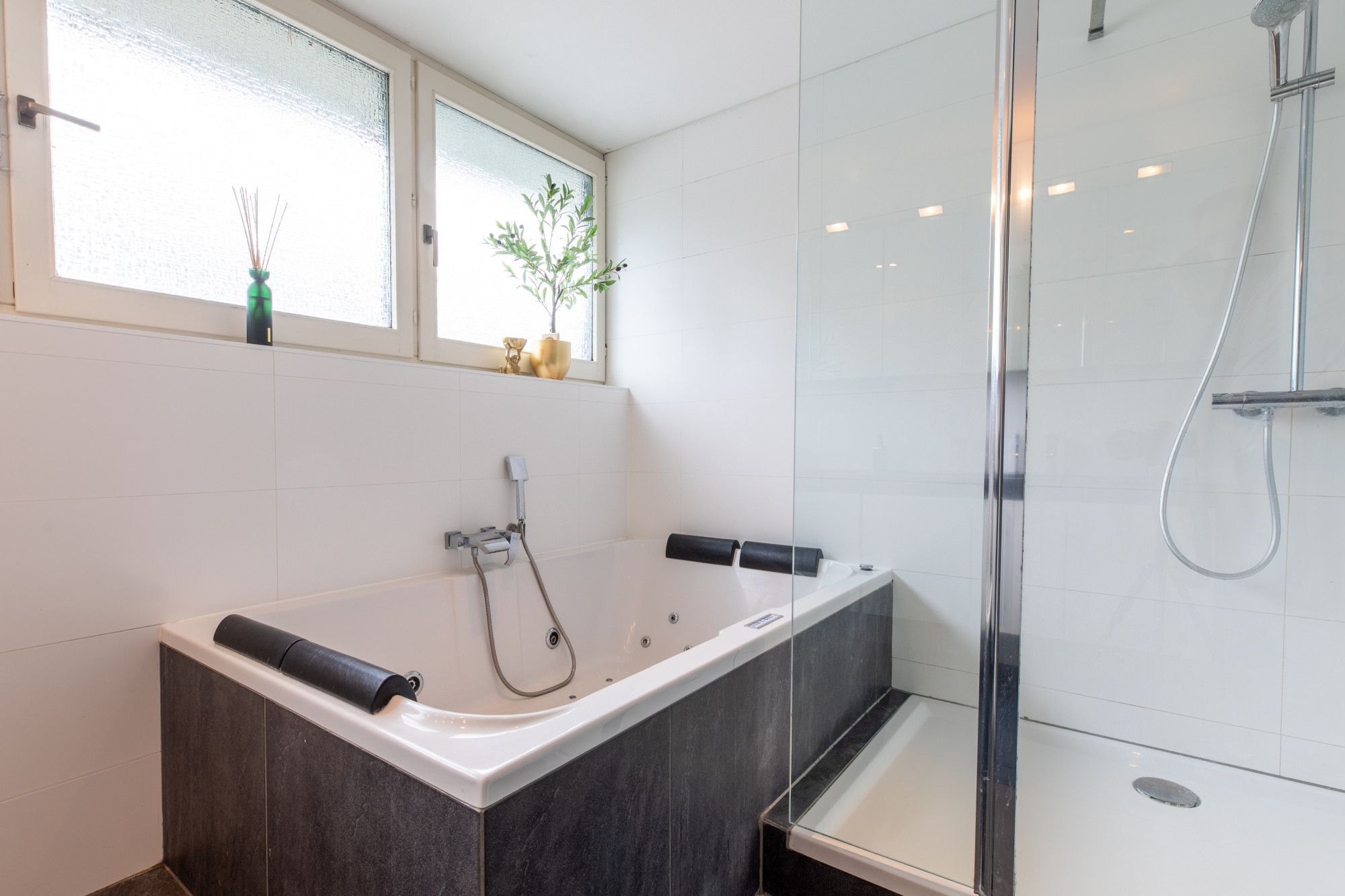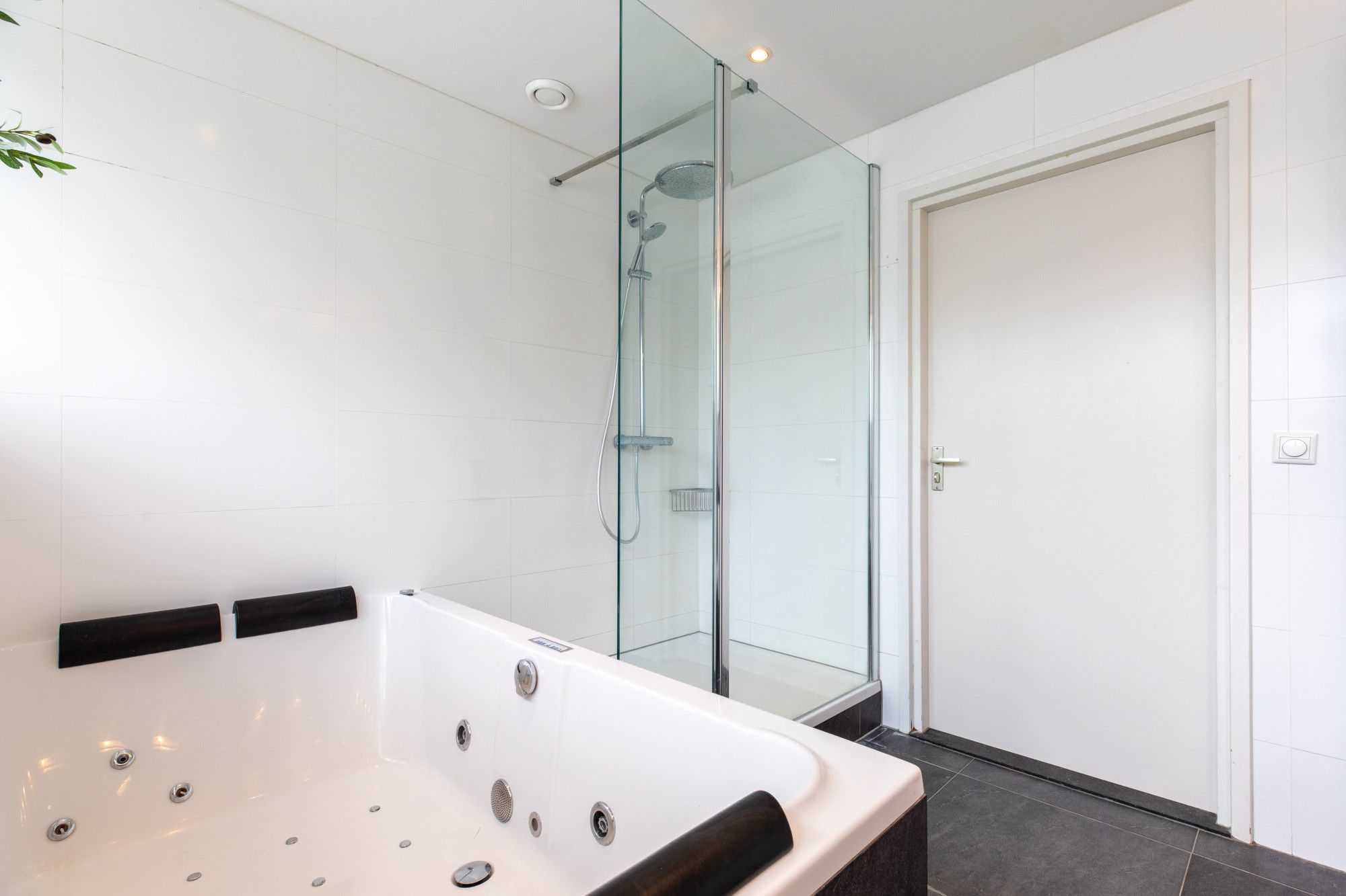Badkamer (3.12 x 2.70 m) met 2 persoons whirlpool, inloopdouche en badmeubel met dubbele wastafel.