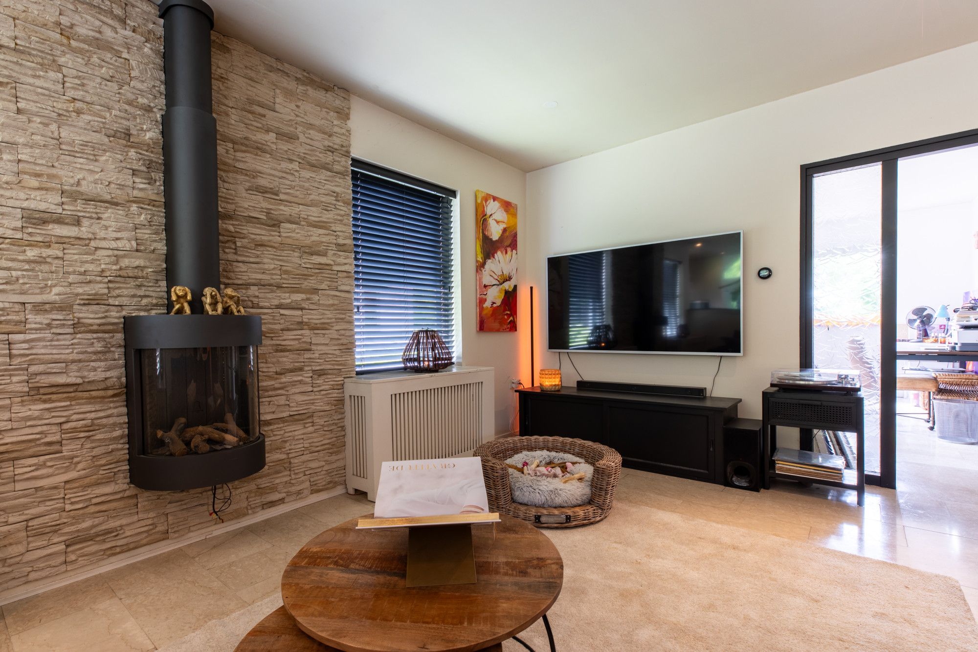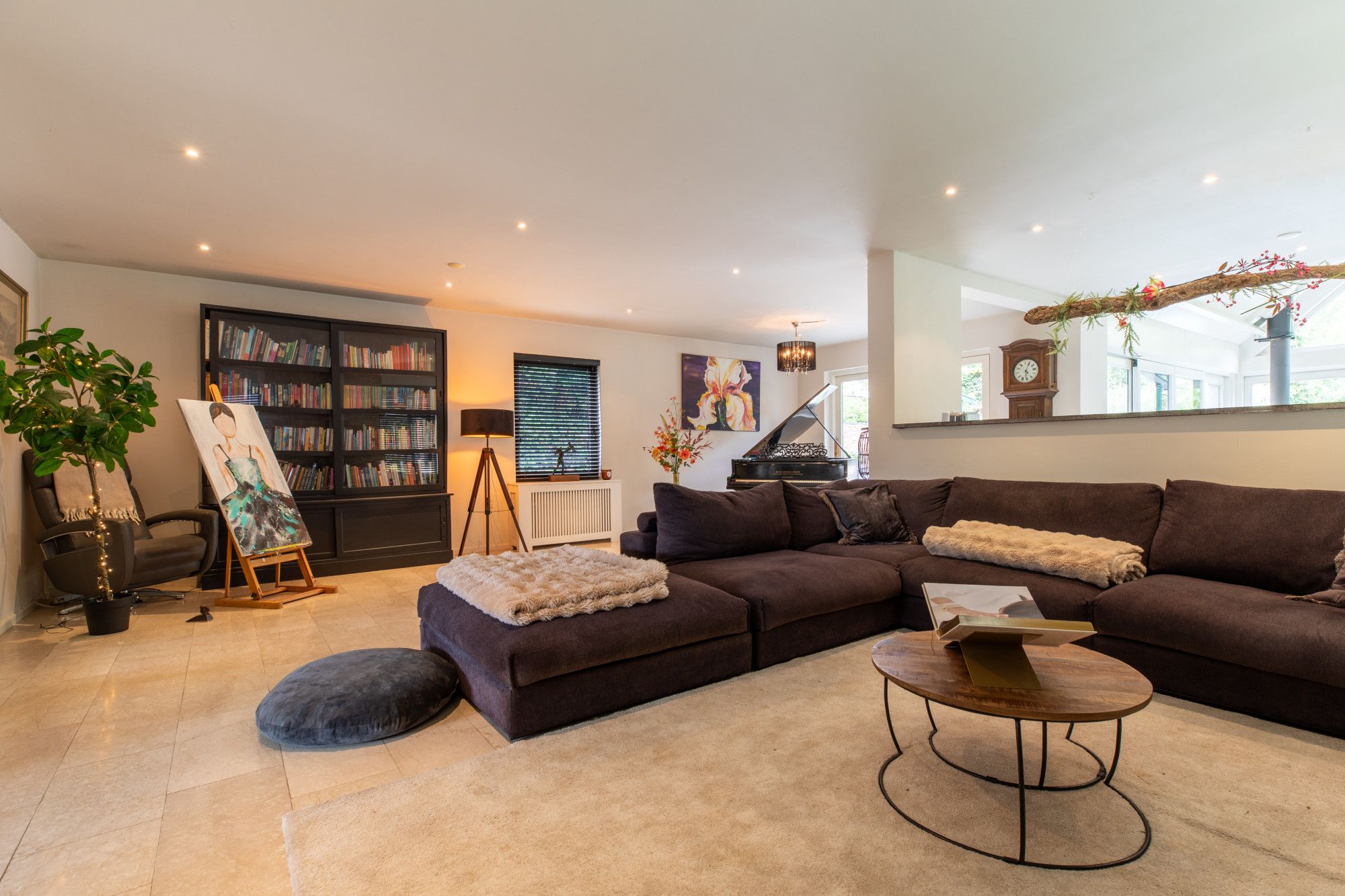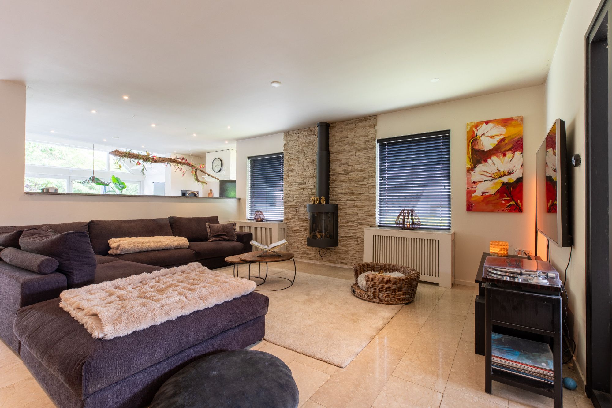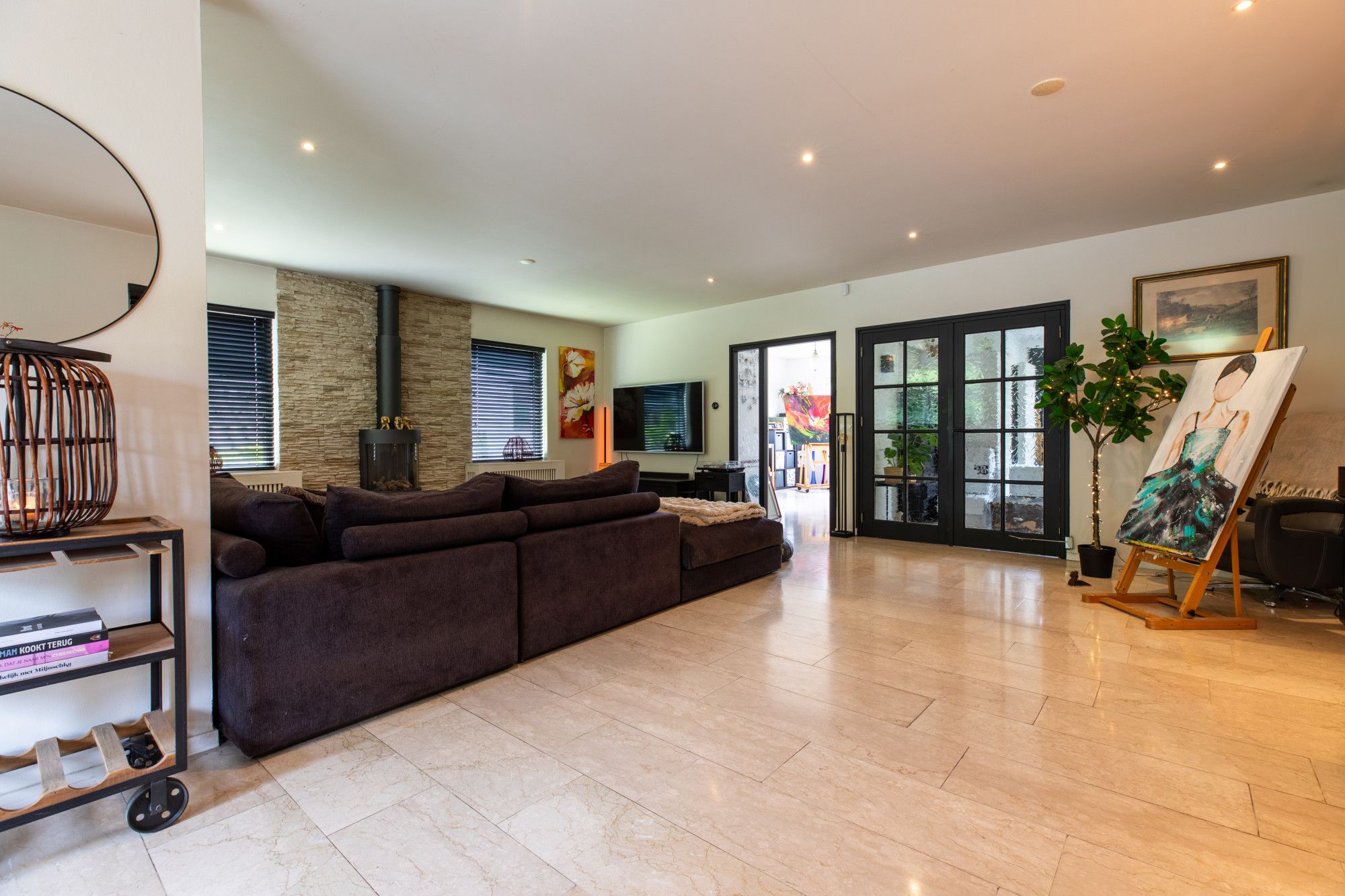 Dubbele oprit (voor garage en links van de woning, ideaal voor het stallen van camper/caravan). Middels dubbele deur toegang tot de hal (5.18 x 3.59 m) met doorlopende natuurstenen vloer, garderobe en toiletruimte. Middels dubbele deur toegang tot de riante lichte woonkamer (8.24 x 7.36/3.68 m) eveneens voorzien van van natuurstenen vloer met vloerverwarming met fraaie gashaard, middels schuifpui toegang tot het terras en achtertuin; vanuit de woonkamer toegang tot de kantoorruimte/slaapkamer (4.11 x 3.57 m) met muurkast.