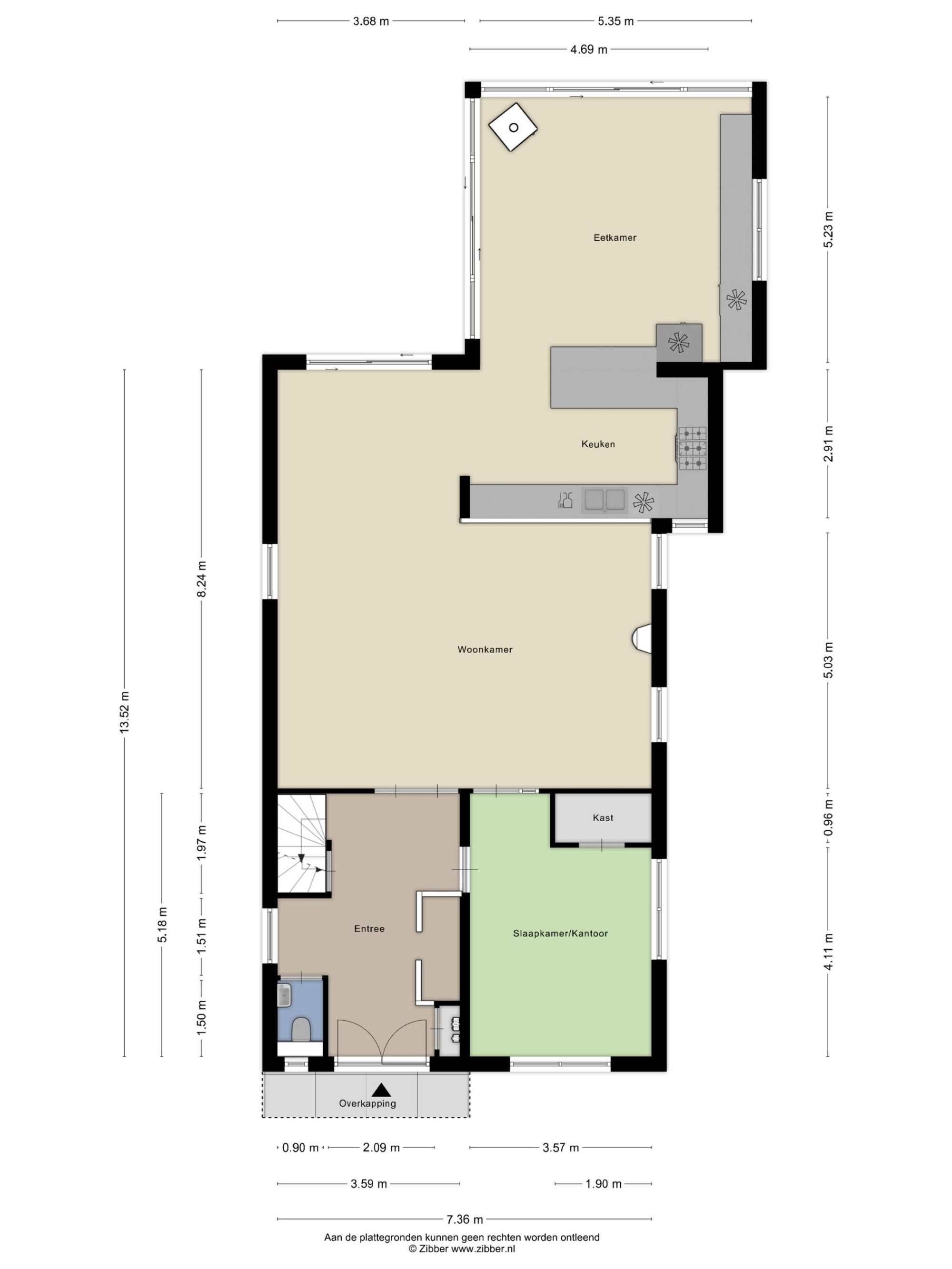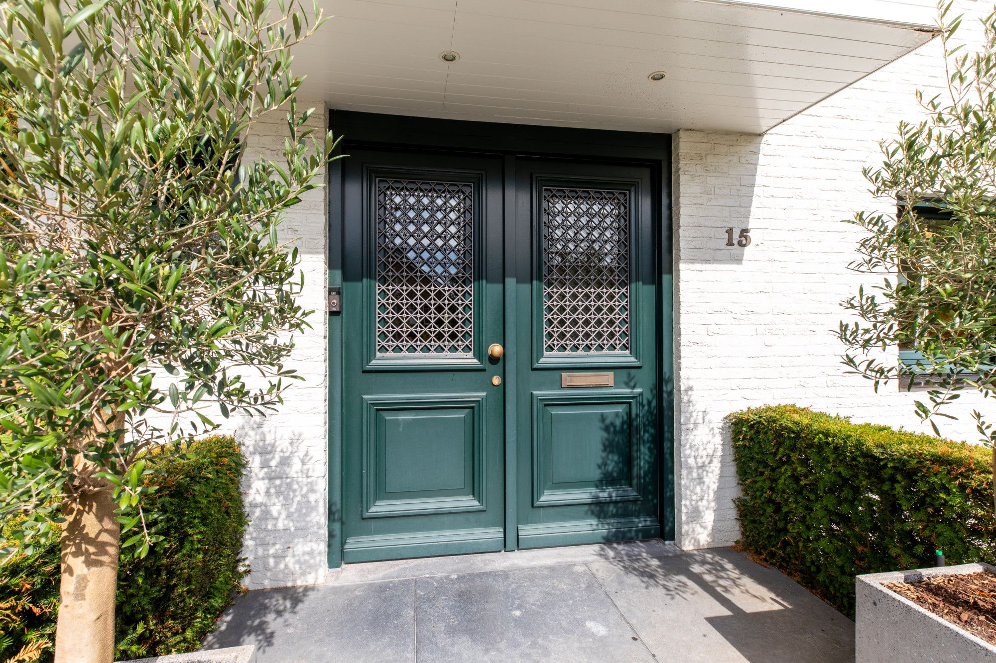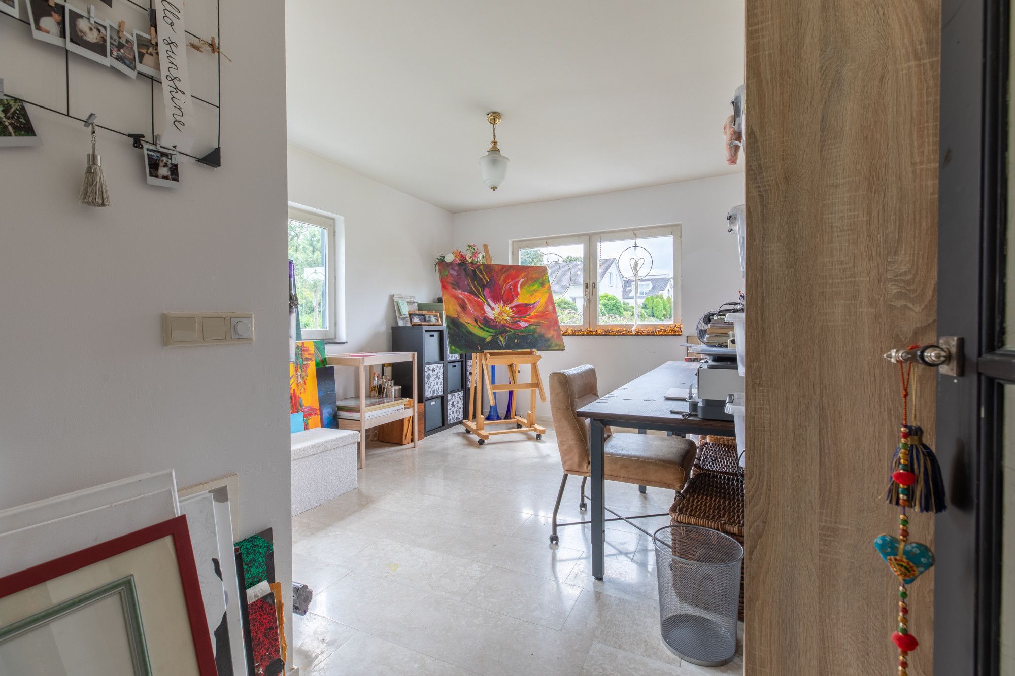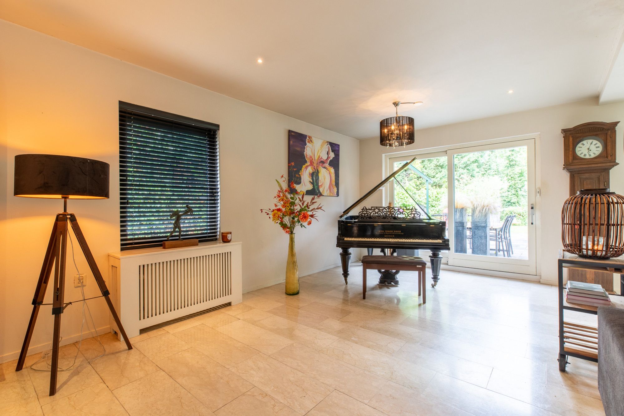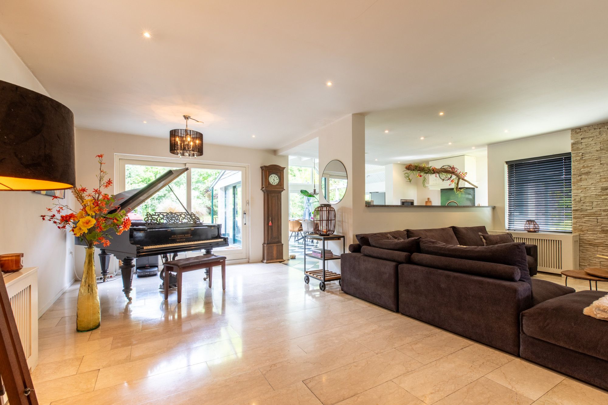 Dubbele oprit (voor garage en links van de woning, ideaal voor het stallen van camper/caravan). Middels dubbele deur toegang tot de hal (5.18 x 3.59 m) met doorlopende natuurstenen vloer, garderobe en toiletruimte. Middels dubbele deur toegang tot de riante lichte woonkamer (8.24 x 7.36/3.68 m) eveneens voorzien van van natuurstenen vloer met vloerverwarming met fraaie gashaard, middels schuifpui toegang tot het terras en achtertuin; vanuit de woonkamer toegang tot de kantoorruimte/slaapkamer (4.11 x 3.57 m) met muurkast.