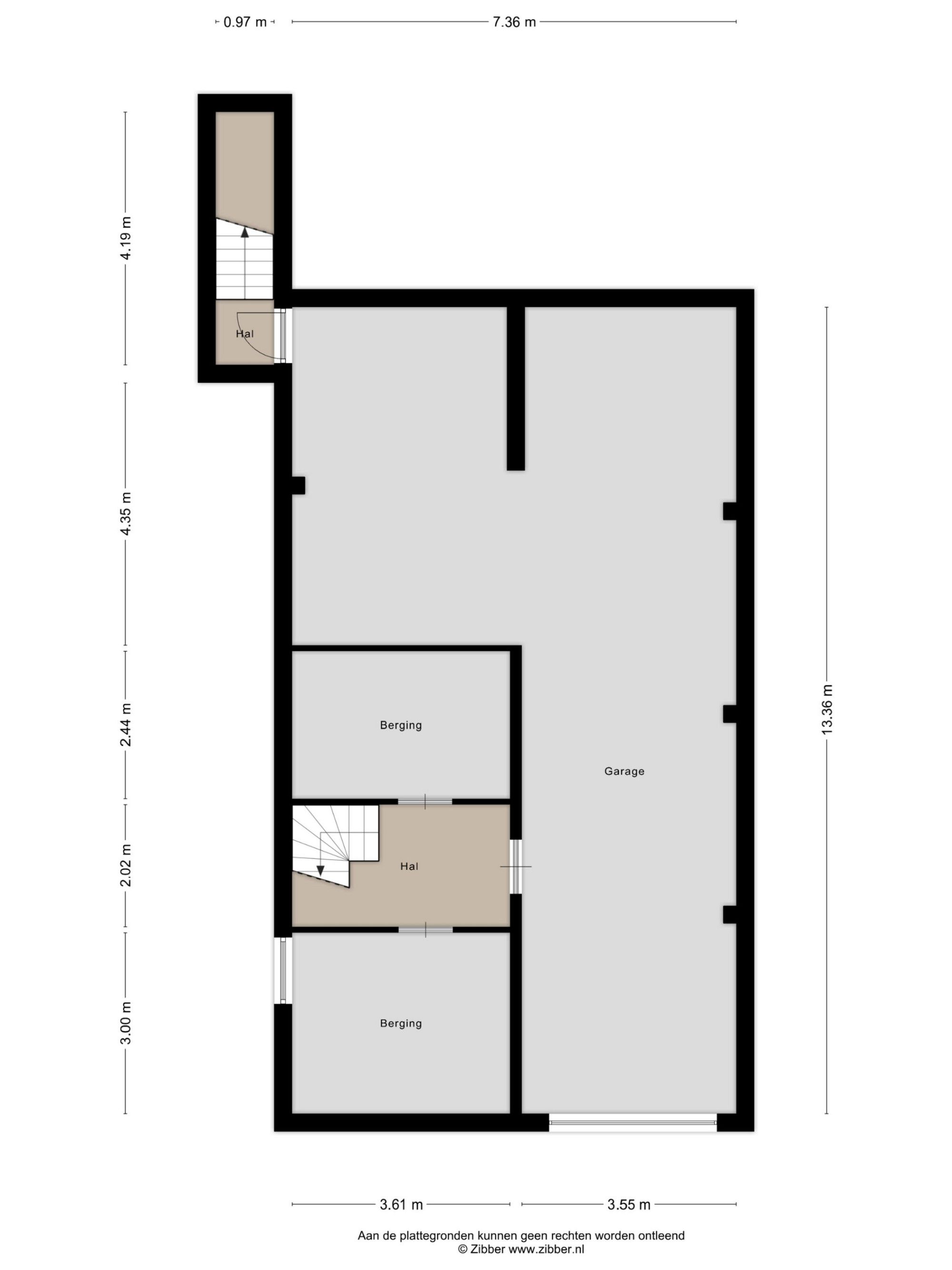 Riante inpandige garage (13.36 x 3.55 m en 5.35 x 3.61 m) geschikt voor meerdere voertuigen.