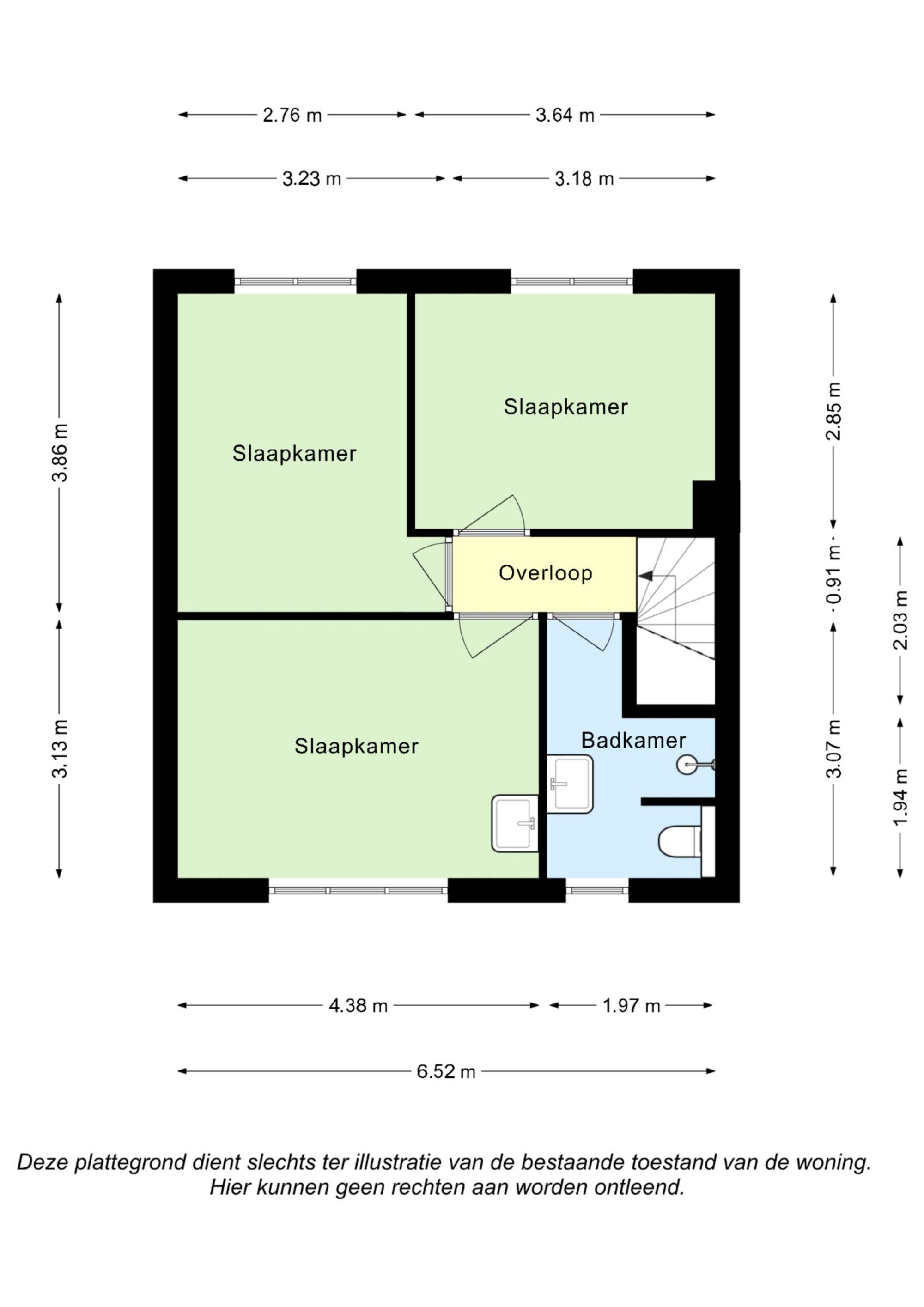 De overloop biedt toegang tot 3 slaapkamers en badkamer. Slaapkamer I (4,38 m x 3,13 m) v.v. airconditioning en vaste wastafel is aan de voorzijde gelegen. Slaapkamer II (3,86 m x 2,76 m) & slaapkamer III (3,64 m x 2,85 m) zijn beide aan de achterzijde gelegen. De badkamer (3,07 m /1,94 m x 1,97 m) is v.v. een vaste wastafel, 2e toilet en douche.