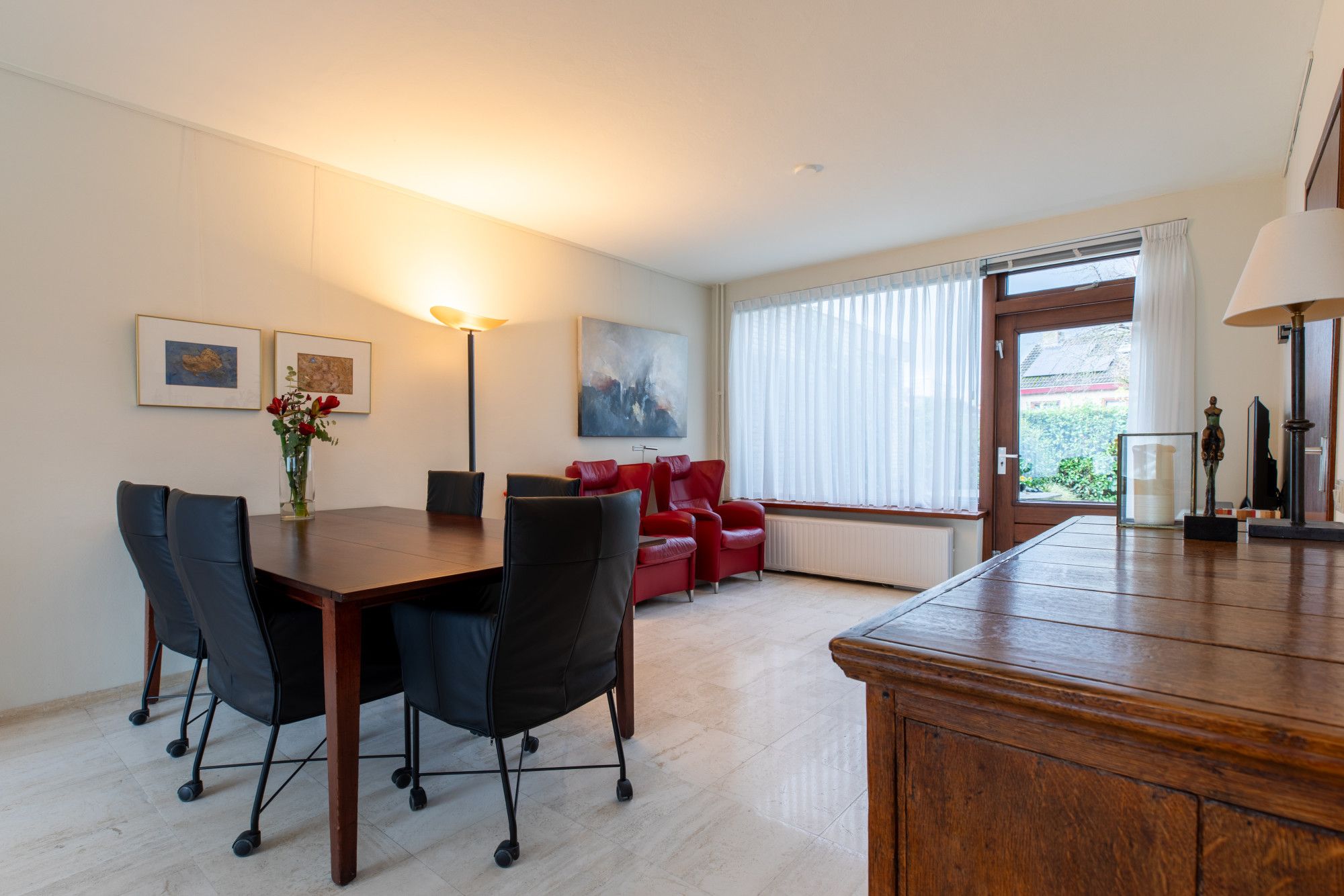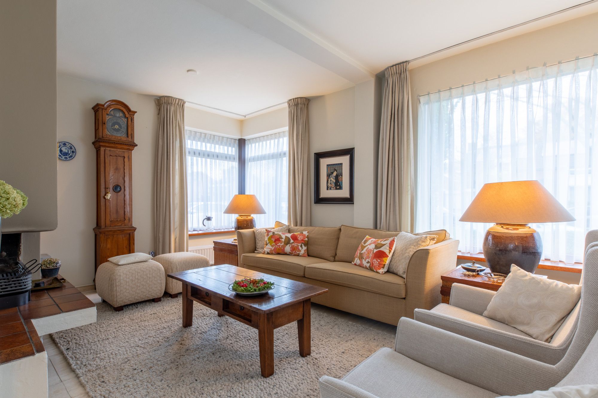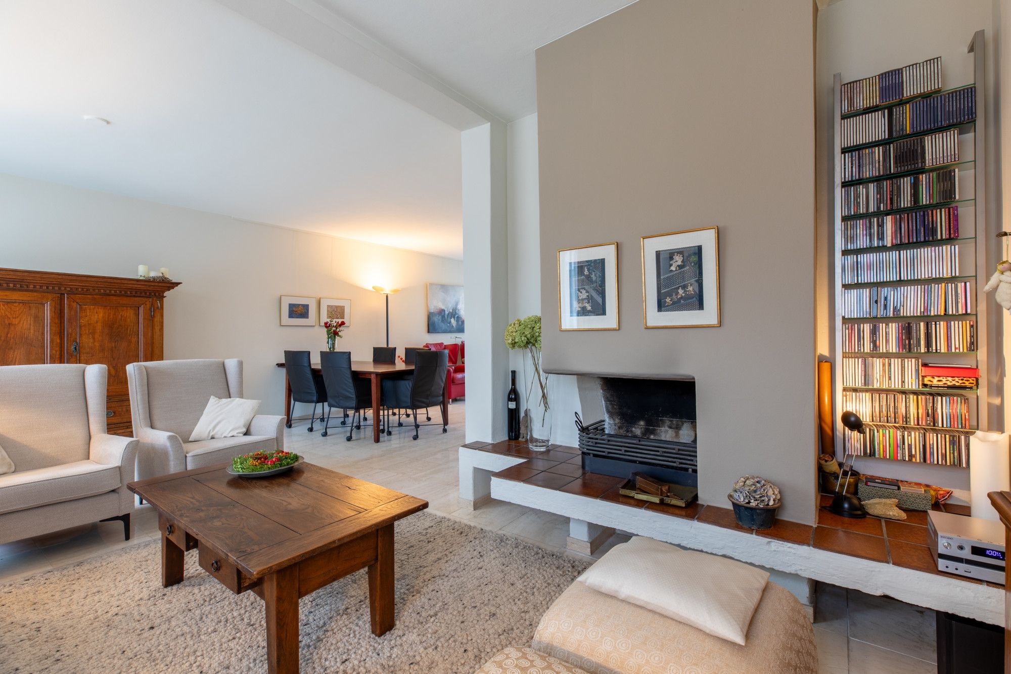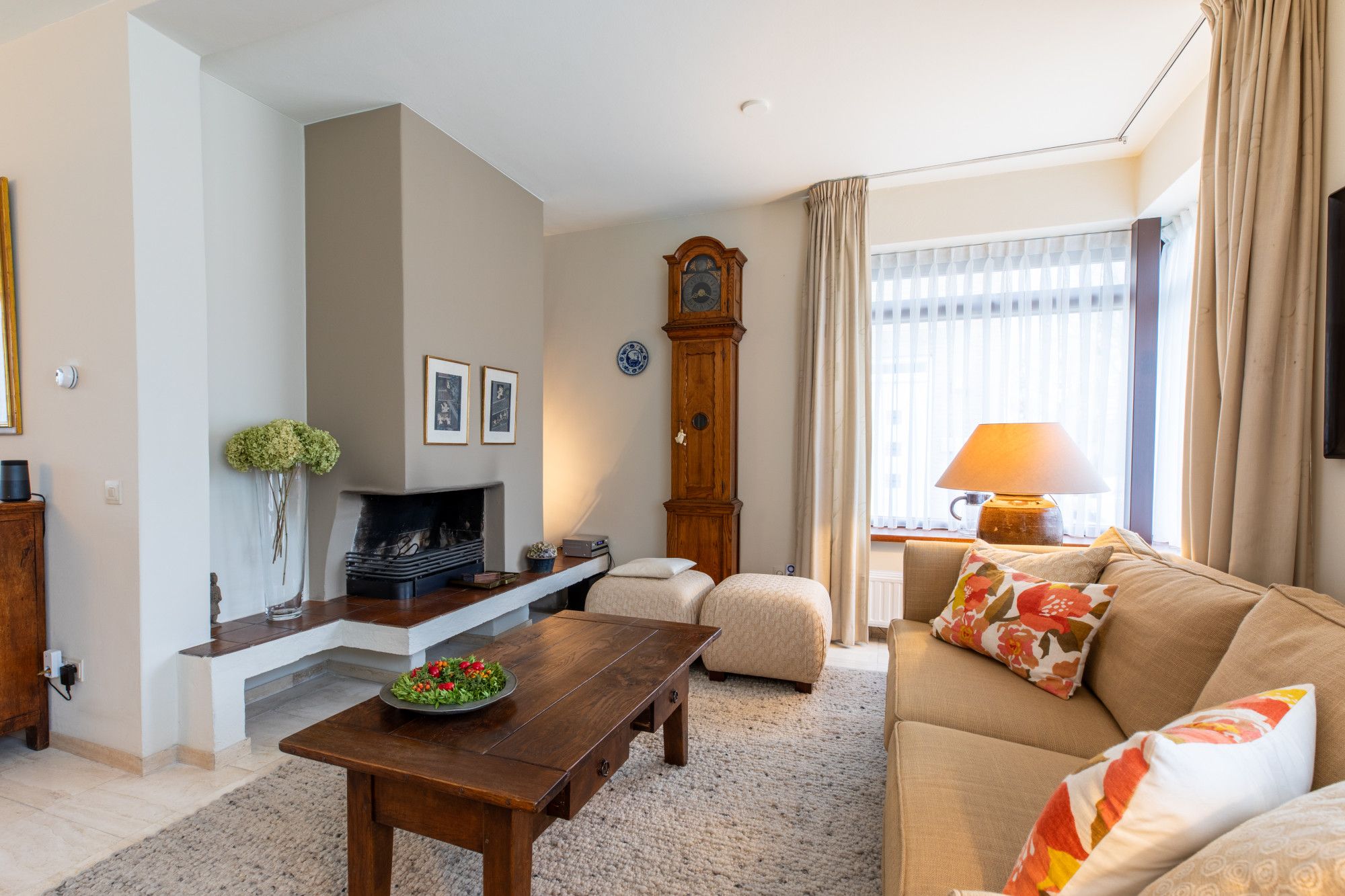 Middels oprit toegang tot de overdekte entree. Ruime hal met doorlopende lichte travertin vloer, ruime bergkast, garderobe nis en geheel betegelde toiletruimte met wand closet en fonteintje. L vormige woonkamer (8.69 x 6.53/3.88 m) met schouwpartij met open haard eveneens voorzien van lichte travertin vloer. Vanuit de hal te bereiken gesloten keuken (3.77 x 2.40 m) met witte keukeninstallatie in hoekopstelling, inbouwapparatuur te weten: 5-pits inductie kookplaat, afzuigkap, vaatwasser, koelkast met freshzone, separate kastenwand met combi-magentron en combi-stoom oven.