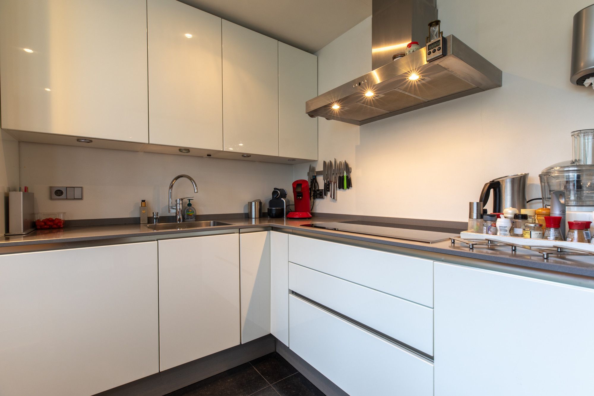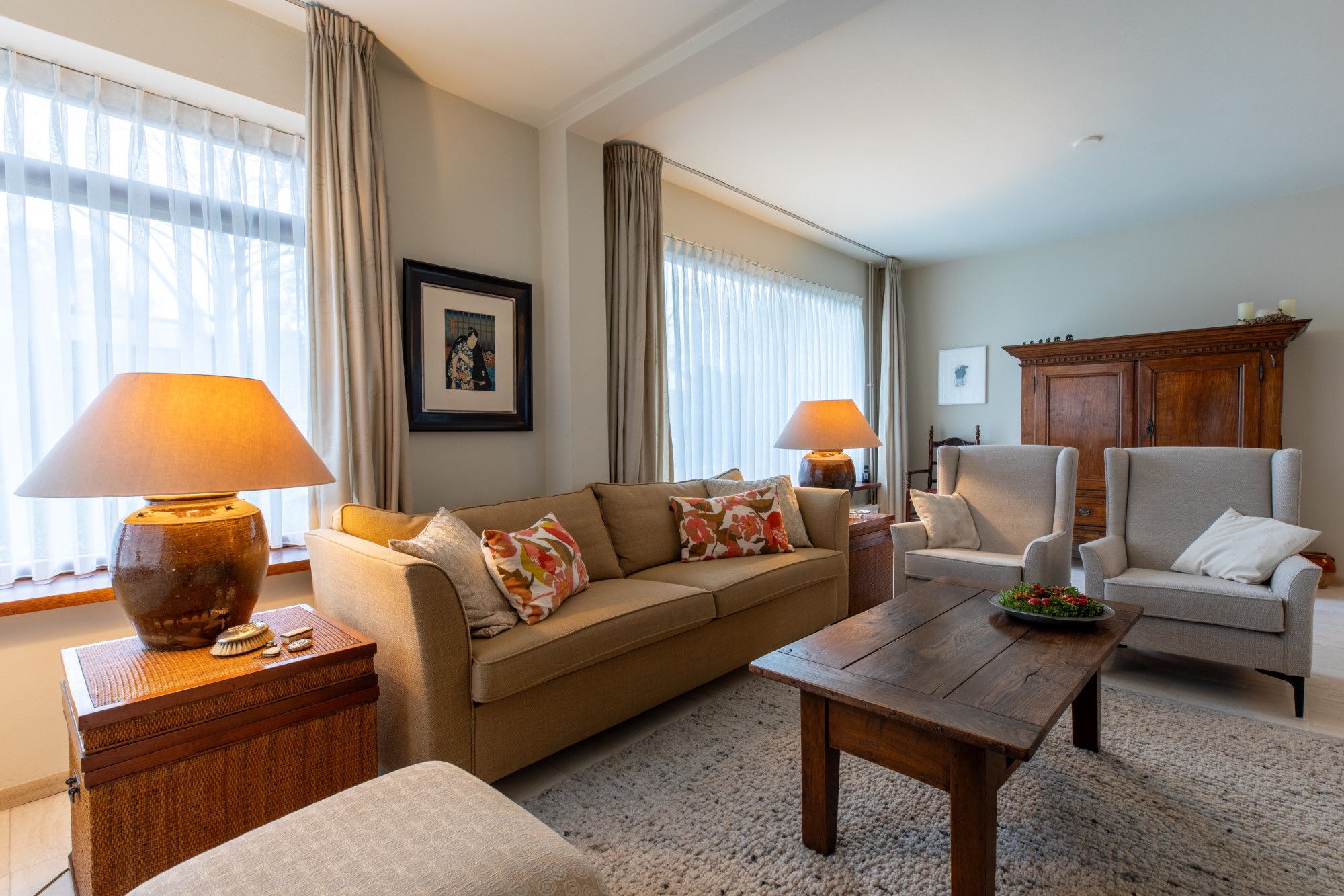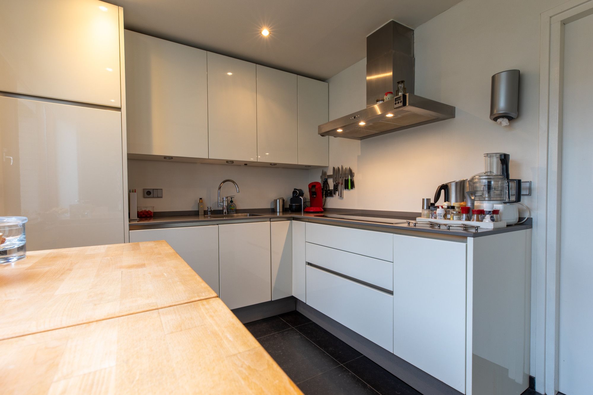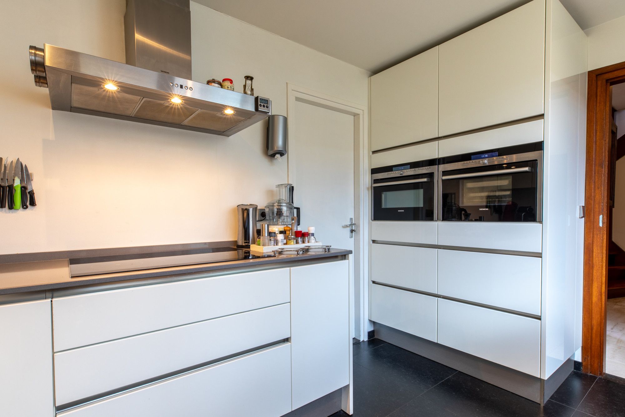 Middels oprit toegang tot de overdekte entree. Ruime hal met doorlopende lichte travertin vloer, ruime bergkast, garderobe nis en geheel betegelde toiletruimte met wand closet en fonteintje. L vormige woonkamer (8.69 x 6.53/3.88 m) met schouwpartij met open haard eveneens voorzien van lichte travertin vloer. Vanuit de hal te bereiken gesloten keuken (3.77 x 2.40 m) met witte keukeninstallatie in hoekopstelling, inbouwapparatuur te weten: 5-pits inductie kookplaat, afzuigkap, vaatwasser, koelkast met freshzone, separate kastenwand met combi-magentron en combi-stoom oven.