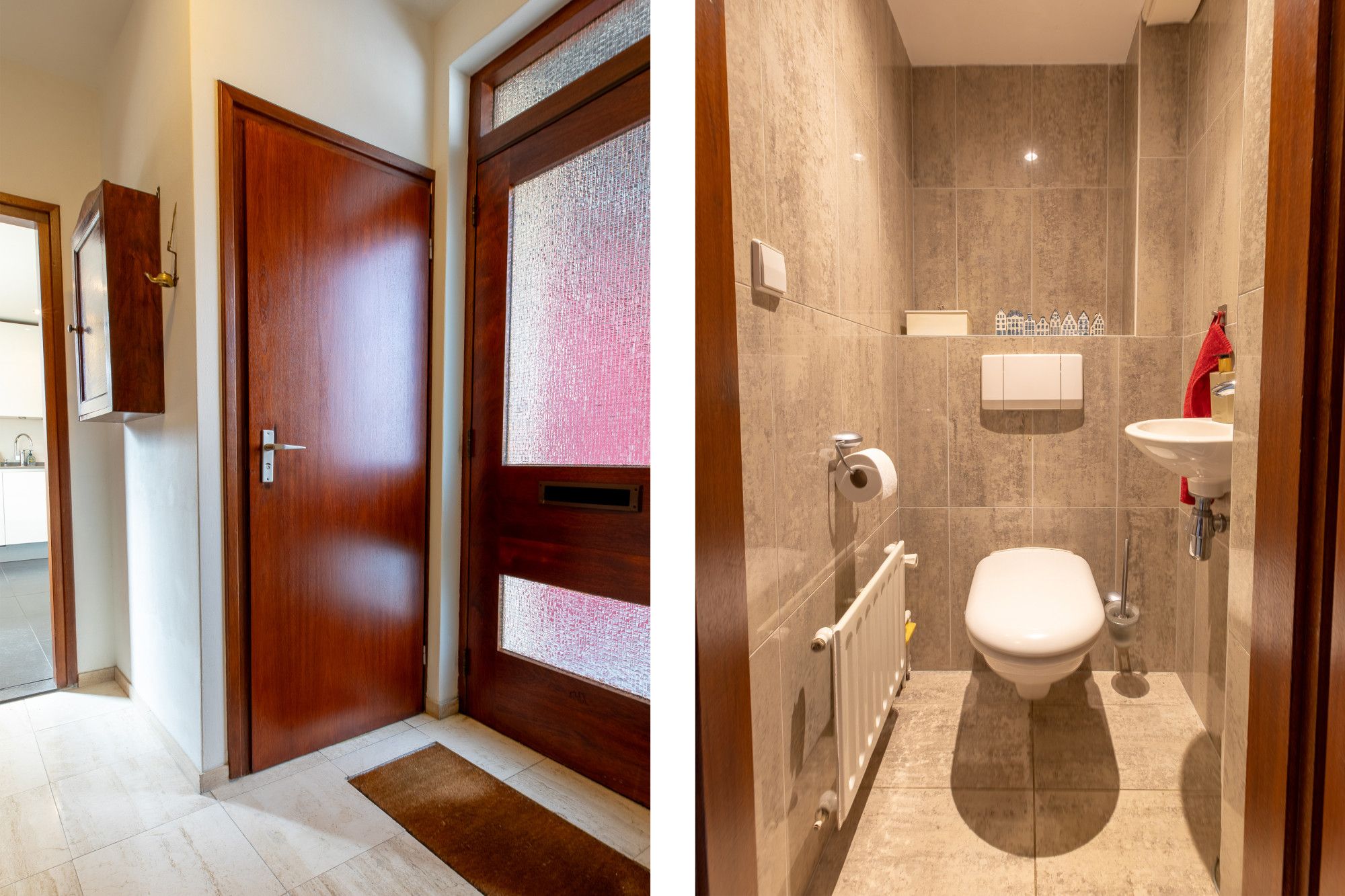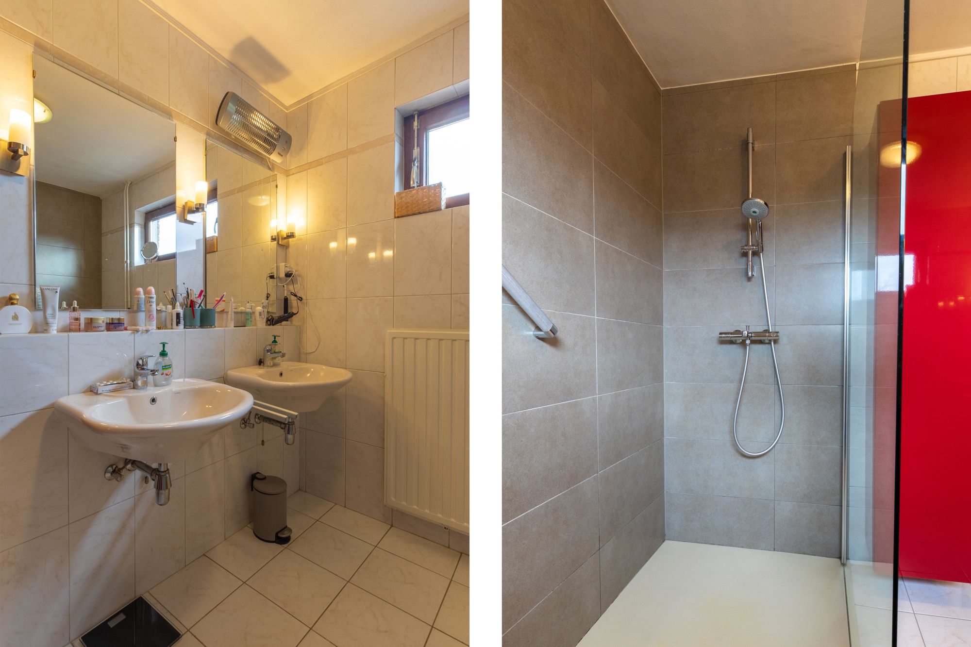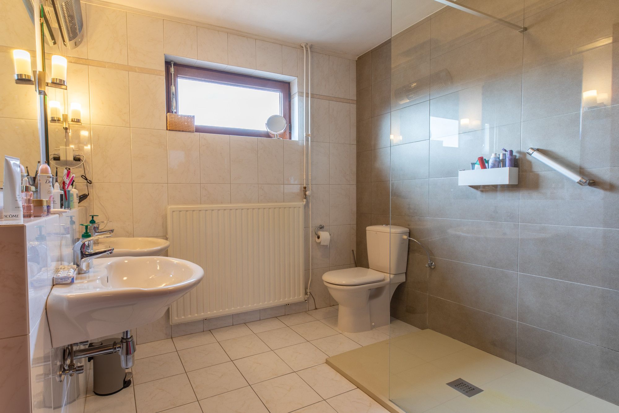 Geheel betegelde badkamer (2.63 x 2.49 m) met inloopdouche, 2e toilet en dubbele wastafel.