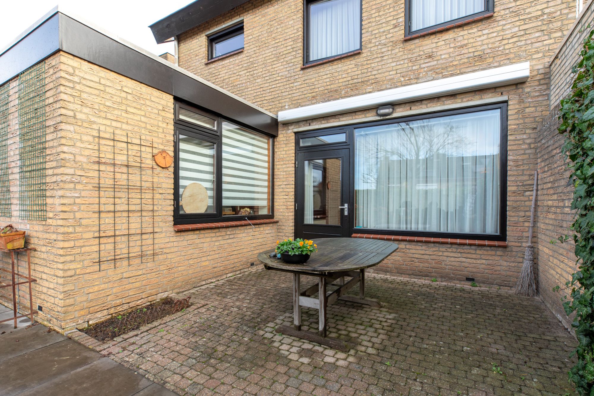 Inpandig te bereiken garage (6.49 x 2.88 m) met kantelpoort voorzien van loopdeur. Vanuit de woonkamer en garage te bereiken zonnig gelegen fraai aangelegde tuin met terras voorzien van uitval scherm en diverse planten borders.