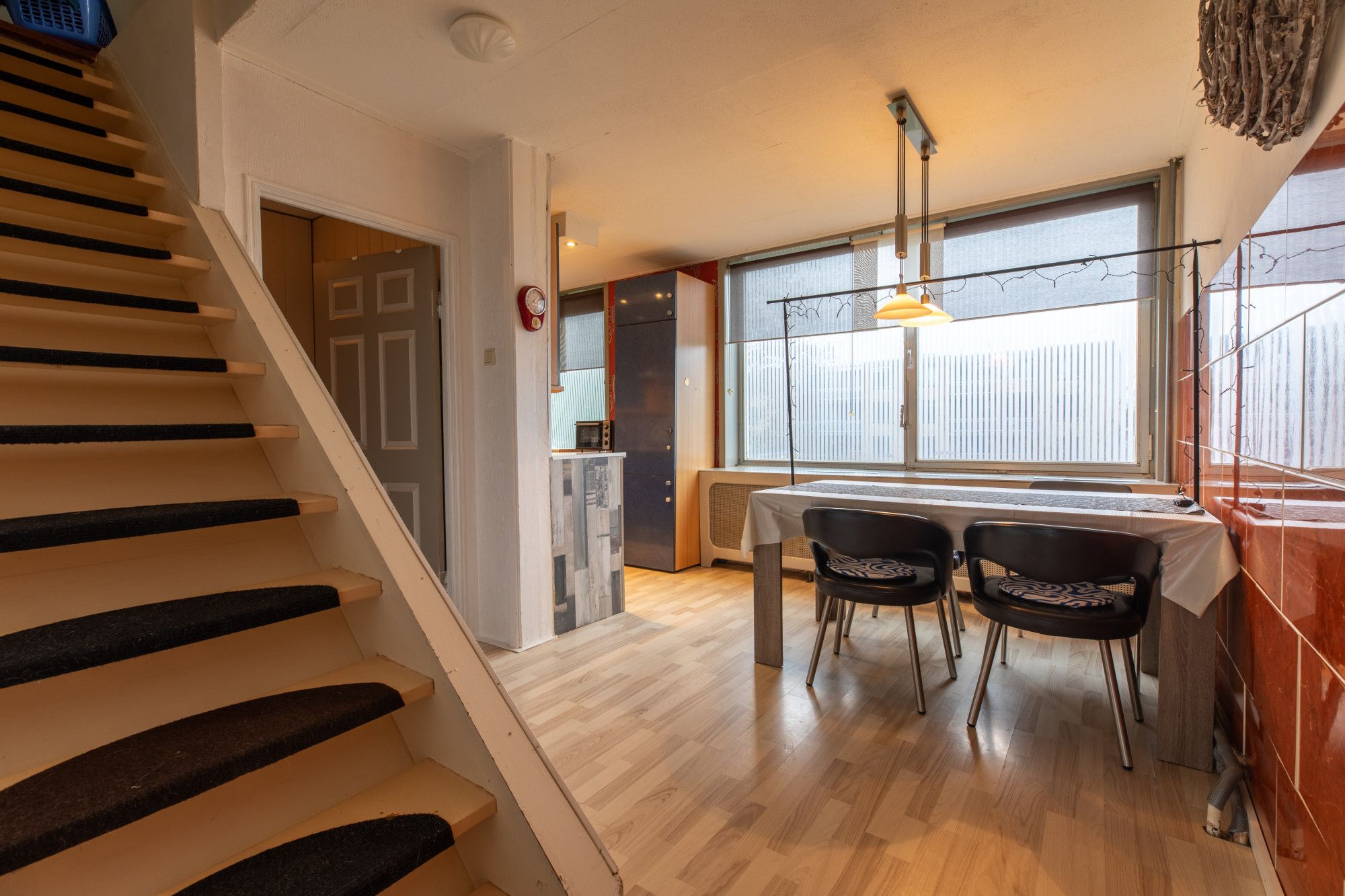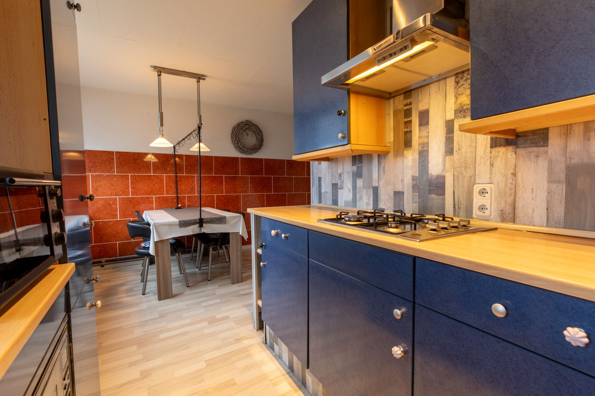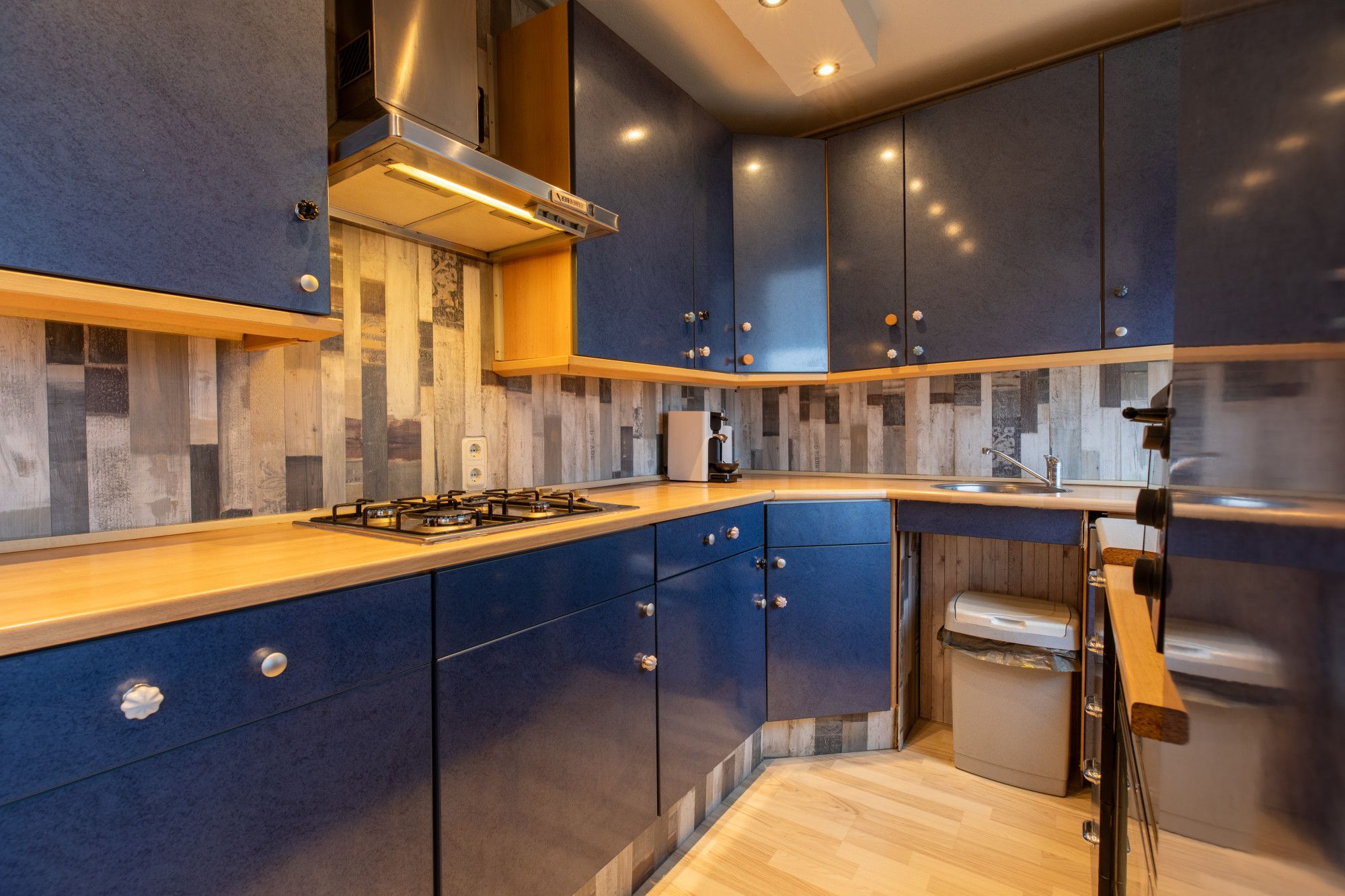 Ruime leef/eetkeuken (5.60 x 4.13 m) voorzien van keukeninstallatie in hoekopstelling met diverse inbouwapparatuur te weten: koelkast, vriezer, 4 pits gaskooktoestel en RVS afzuigkap.