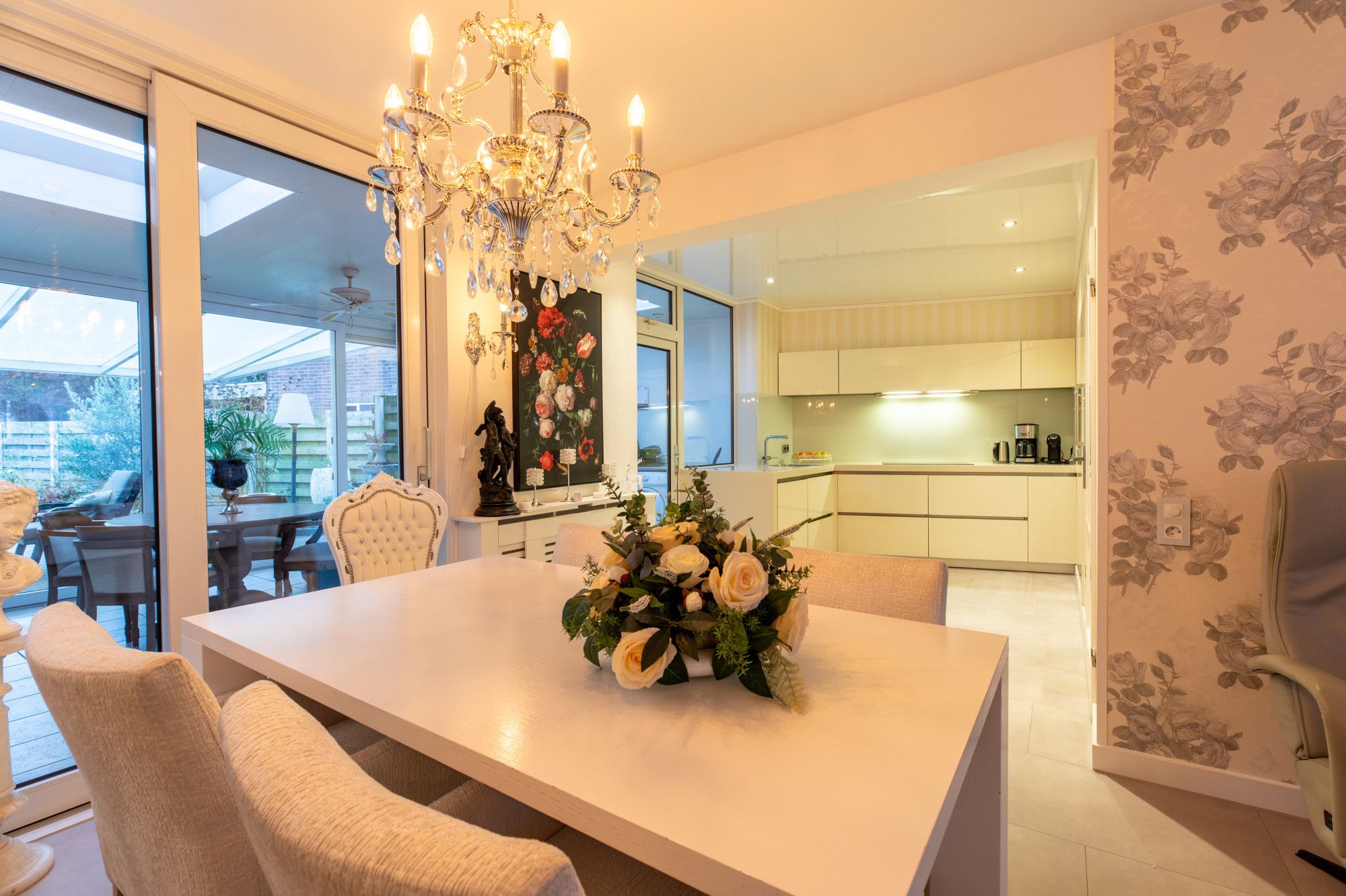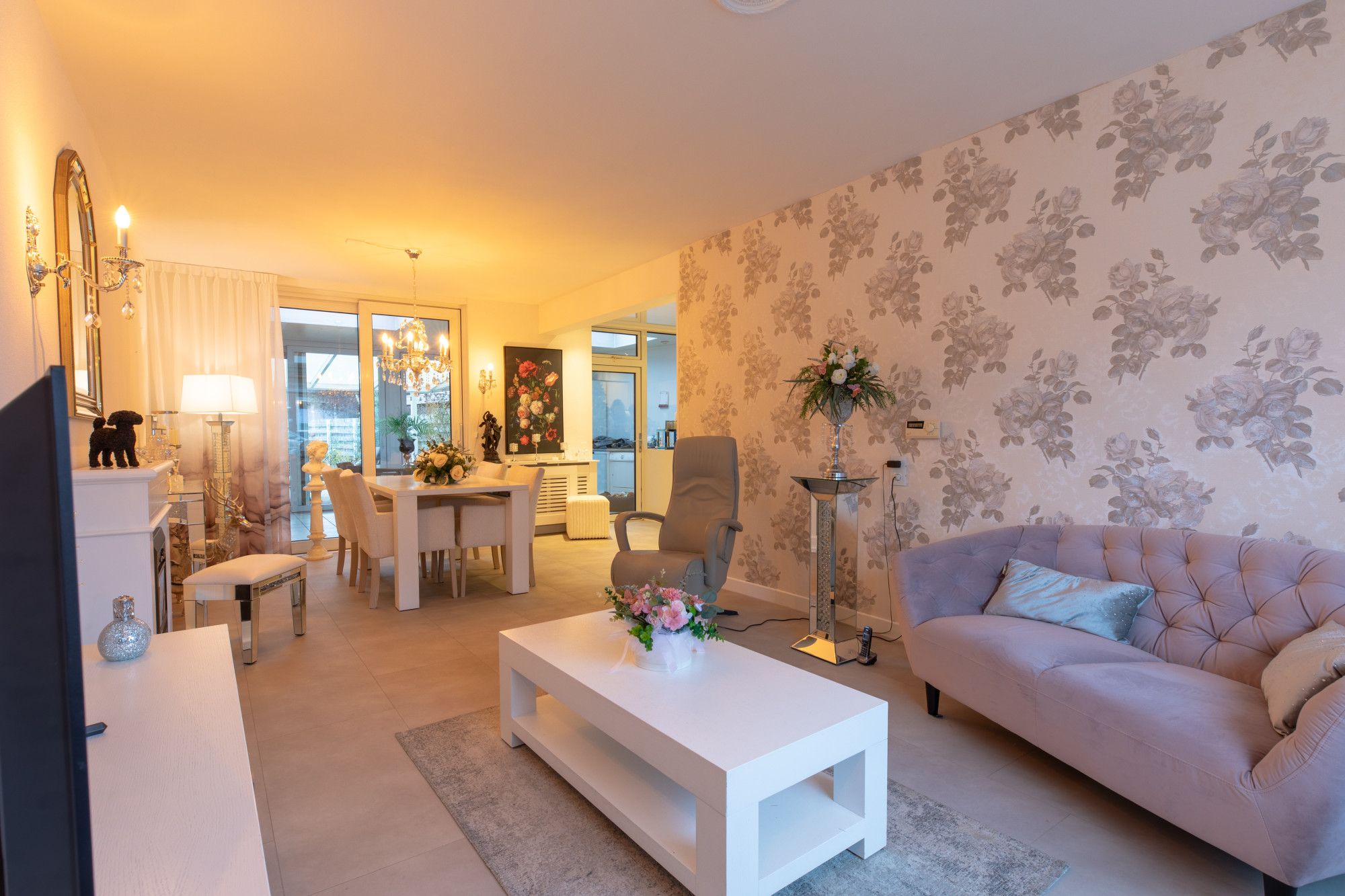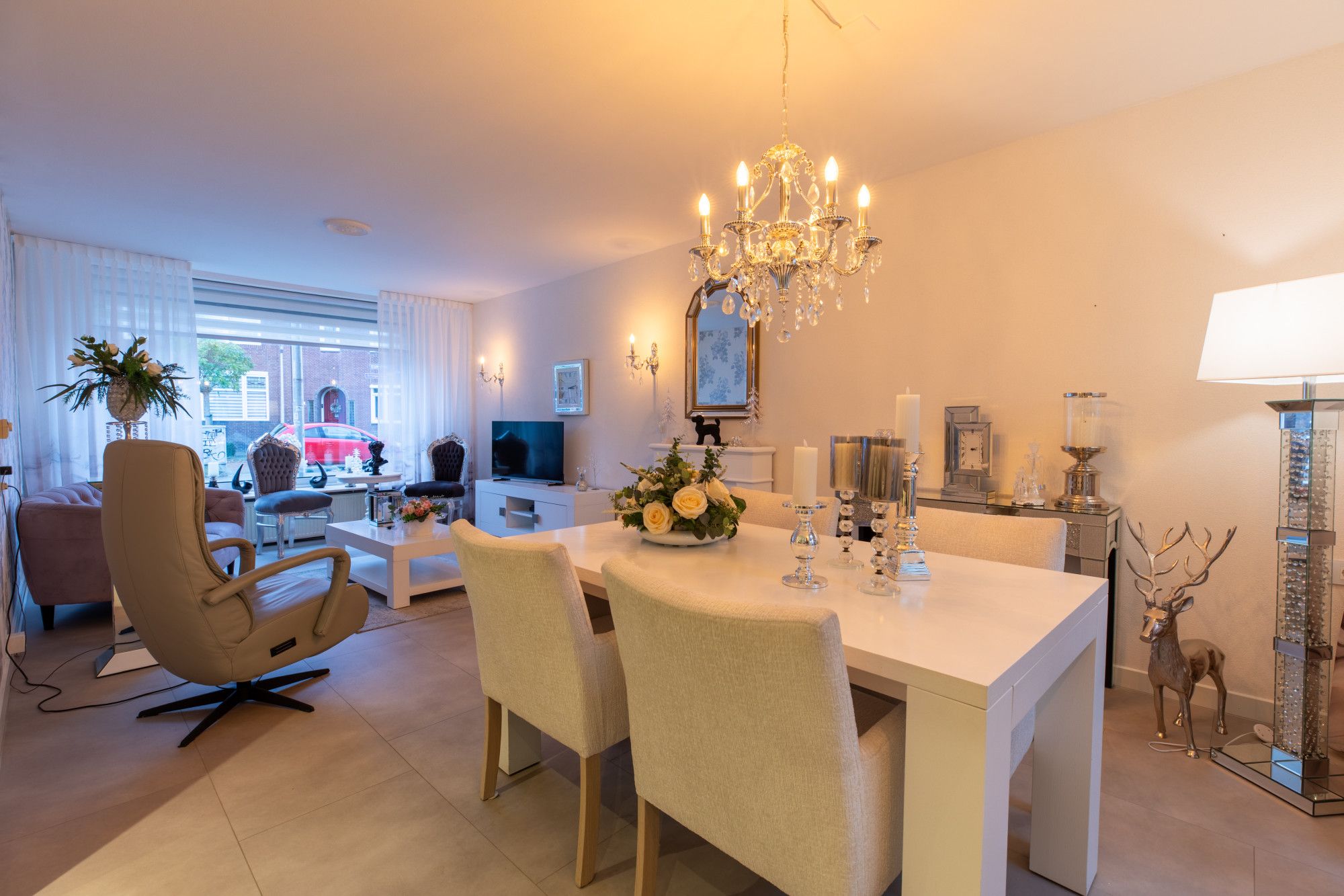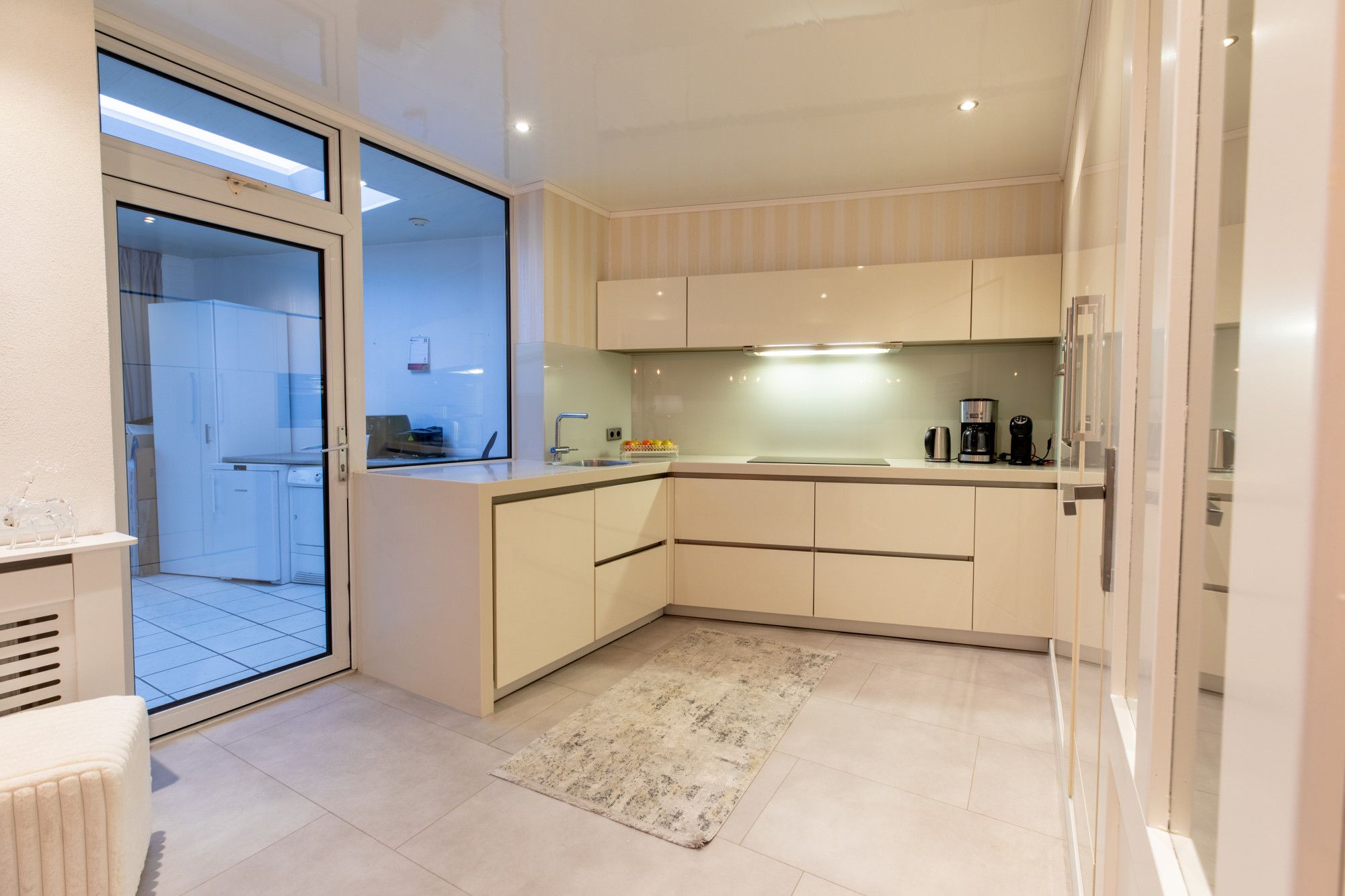 Doorzon woonkamer (7.44 x 3.50 m) met open keuken (3.35 x 2.70 m) eveneens voorzien van PVC vloer, keukeninstallatie in u-opstelling met diverse onder- en bovenkasten, inbouwapparatuur te weten: 4-pits inductie kookcomfort, afzuigkap, combi-magnetron, vaatwasser en koelkast. Vanuit de woonkamer en keuken toegang tot de tuinkamer (5.55 x 3.59 m) met 2 lichtkoepels en dubbele schuifdeur naar de geheel omsloten ruime bestrate achtertuin met ruime overkapping (5.55 x 4.40 m) en tuinberging (voormalig duivenhok). Vanuit de straat middels elektrisch rolluik te bereiken berging (4.45 x 3.05/1.80 m).
