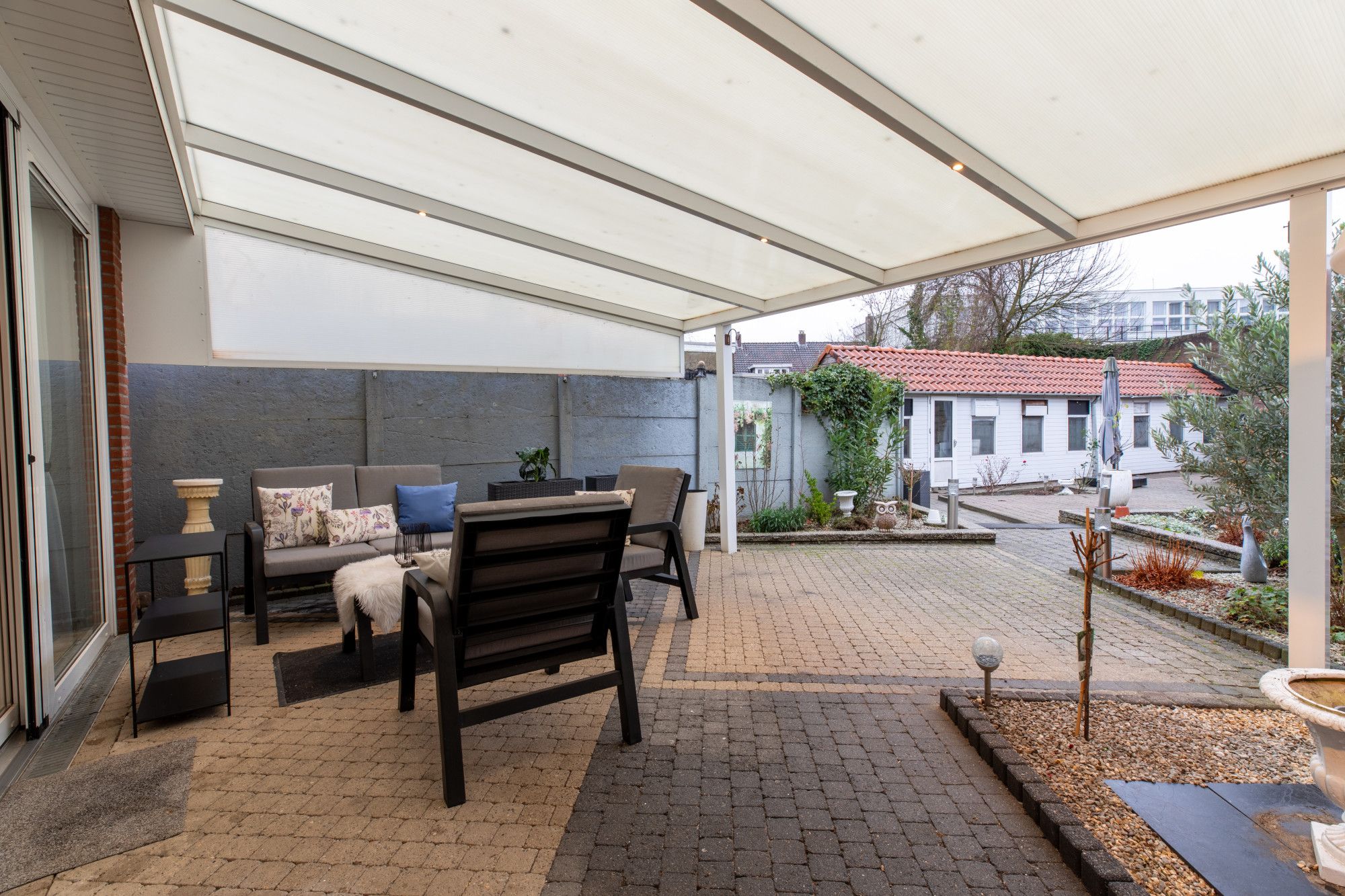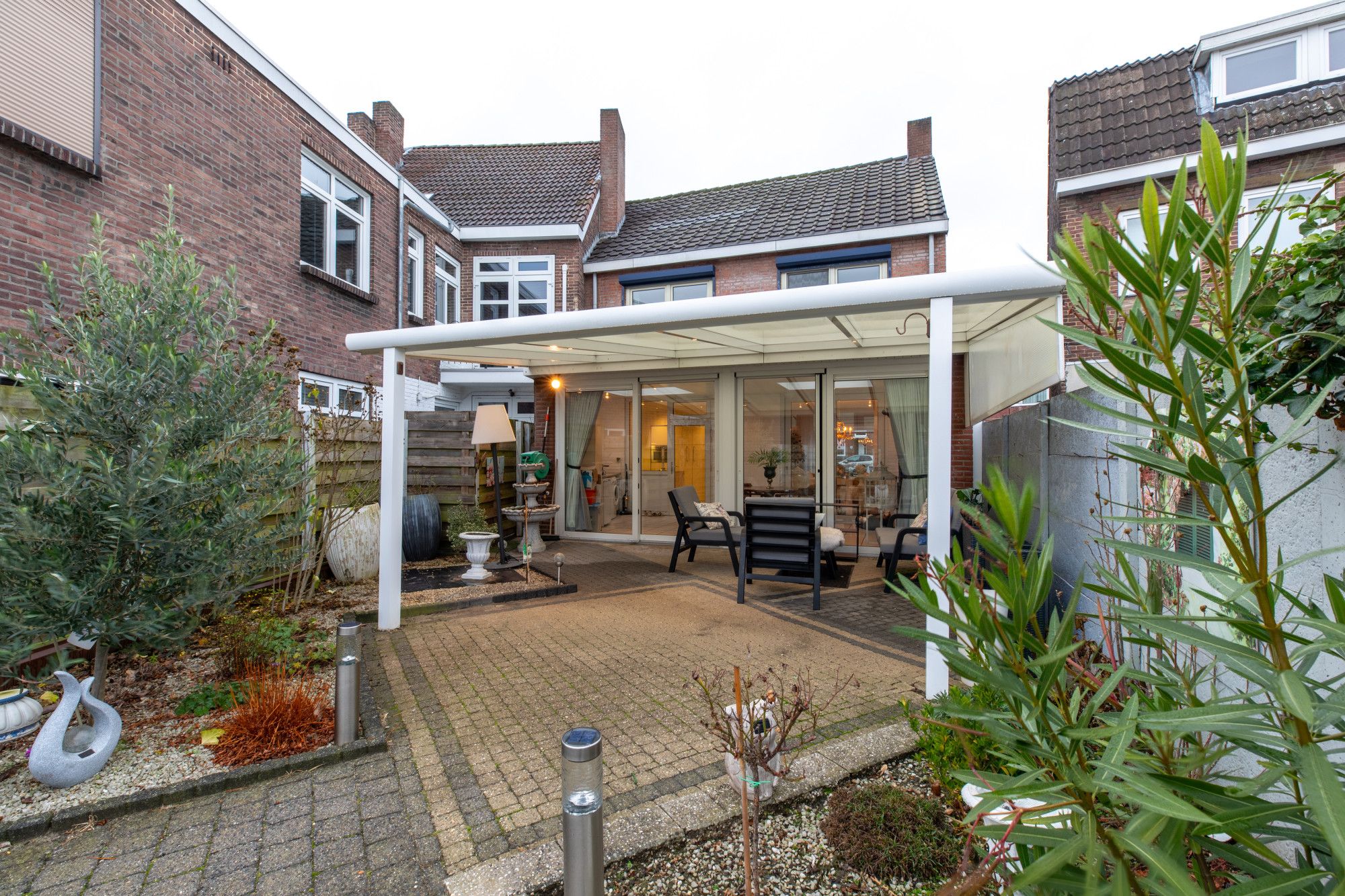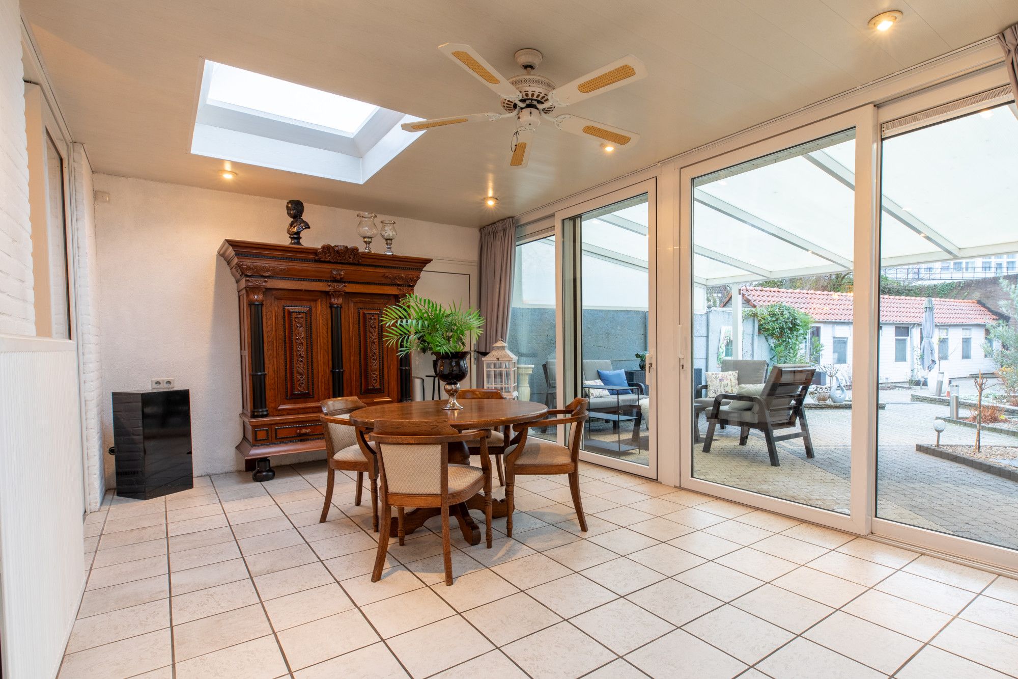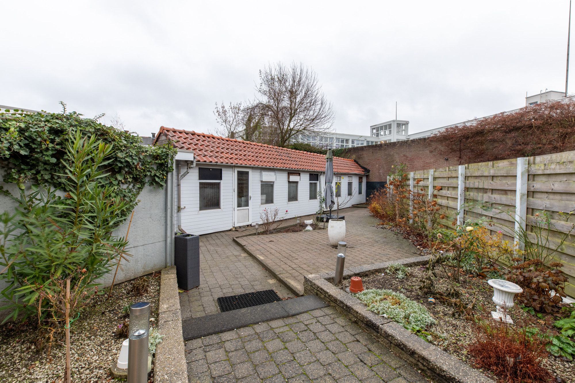 Doorzon woonkamer (7.44 x 3.50 m) met open keuken (3.35 x 2.70 m) eveneens voorzien van PVC vloer, keukeninstallatie in u-opstelling met diverse onder- en bovenkasten, inbouwapparatuur te weten: 4-pits inductie kookcomfort, afzuigkap, combi-magnetron, vaatwasser en koelkast. Vanuit de woonkamer en keuken toegang tot de tuinkamer (5.55 x 3.59 m) met 2 lichtkoepels en dubbele schuifdeur naar de geheel omsloten ruime bestrate achtertuin met ruime overkapping (5.55 x 4.40 m) en tuinberging (voormalig duivenhok). Vanuit de straat middels elektrisch rolluik te bereiken berging (4.45 x 3.05/1.80 m).