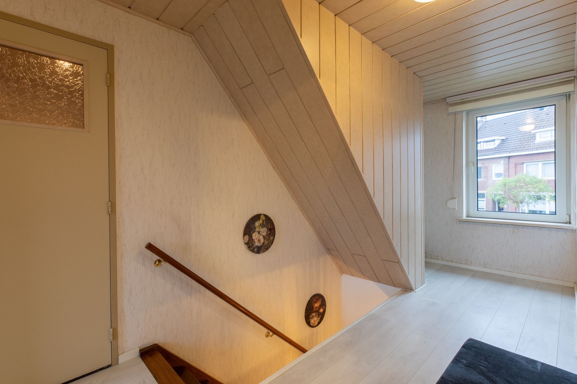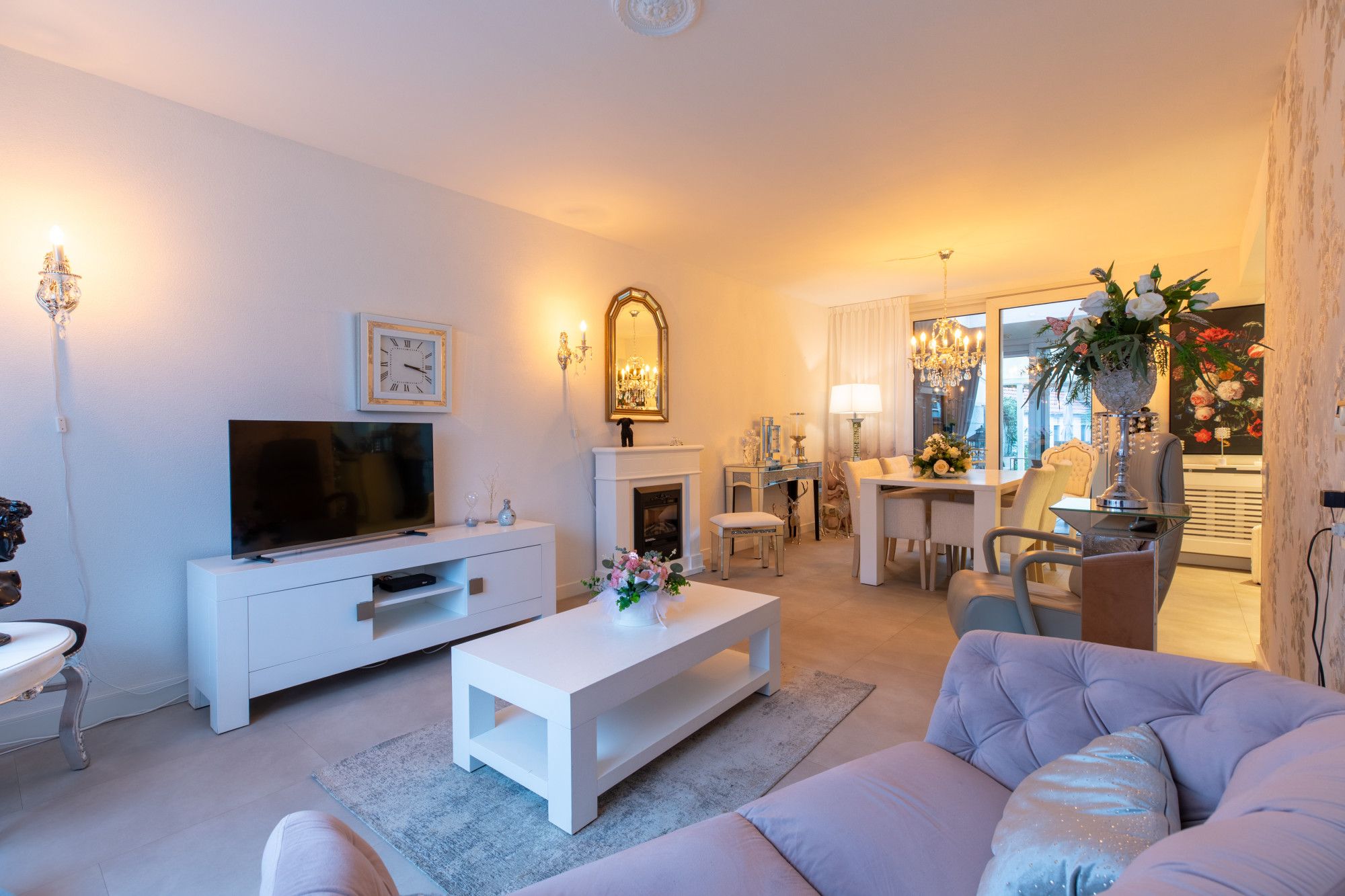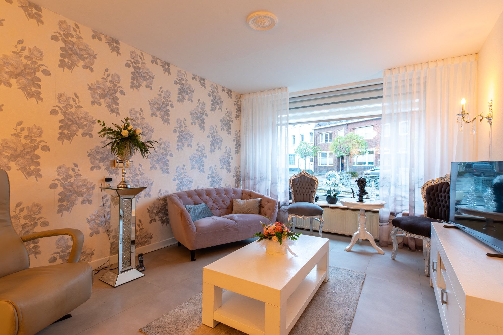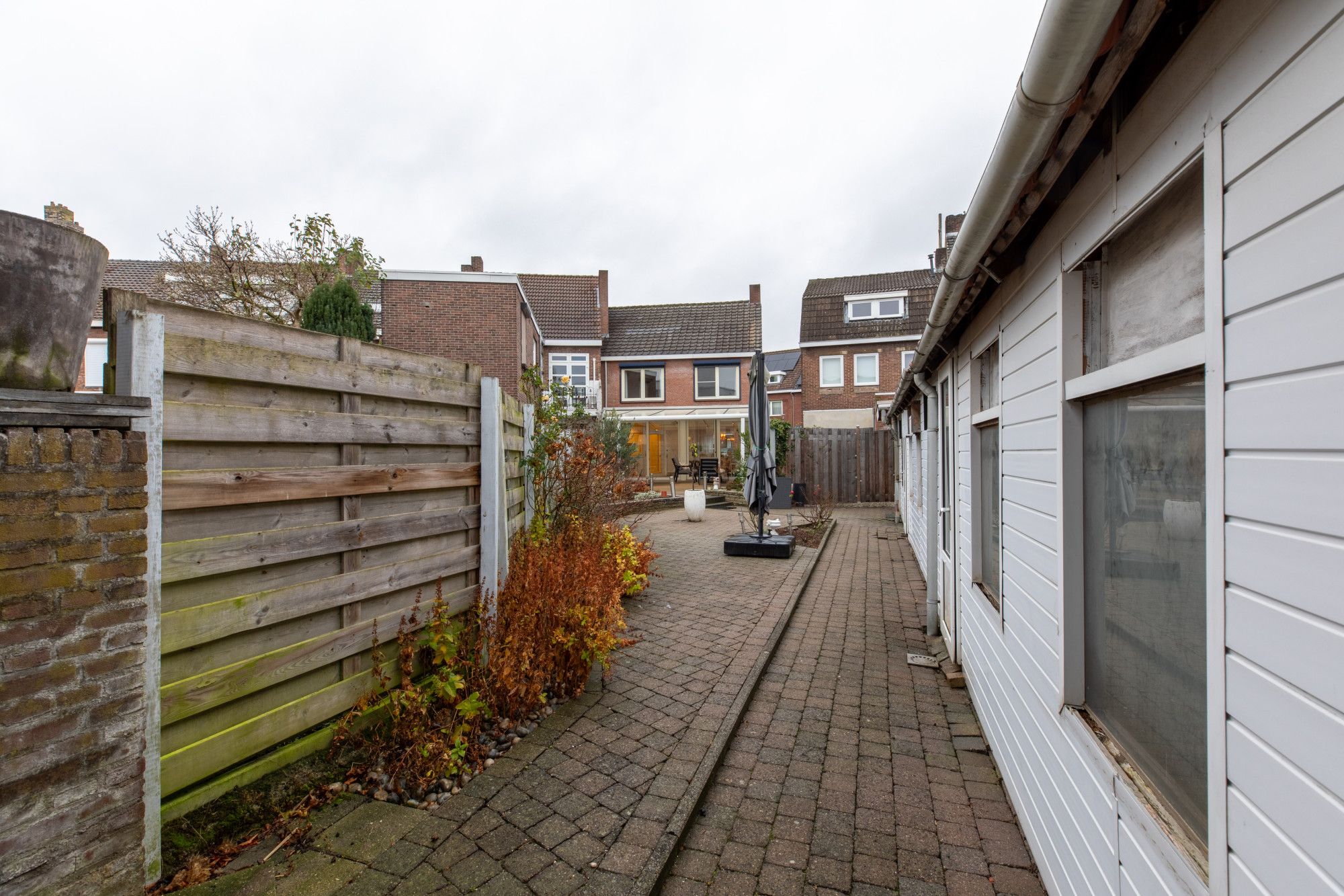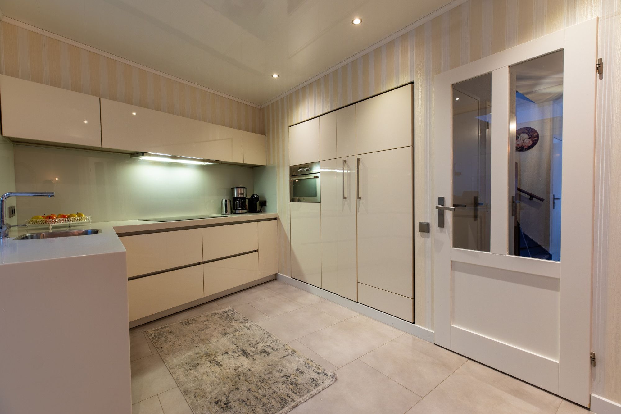 Doorzon woonkamer (7.44 x 3.50 m) met open keuken (3.35 x 2.70 m) eveneens voorzien van PVC vloer, keukeninstallatie in u-opstelling met diverse onder- en bovenkasten, inbouwapparatuur te weten: 4-pits inductie kookcomfort, afzuigkap, combi-magnetron, vaatwasser en koelkast. Vanuit de woonkamer en keuken toegang tot de tuinkamer (5.55 x 3.59 m) met 2 lichtkoepels en dubbele schuifdeur naar de geheel omsloten ruime bestrate achtertuin met ruime overkapping (5.55 x 4.40 m) en tuinberging (voormalig duivenhok). Vanuit de straat middels elektrisch rolluik te bereiken berging (4.45 x 3.05/1.80 m).