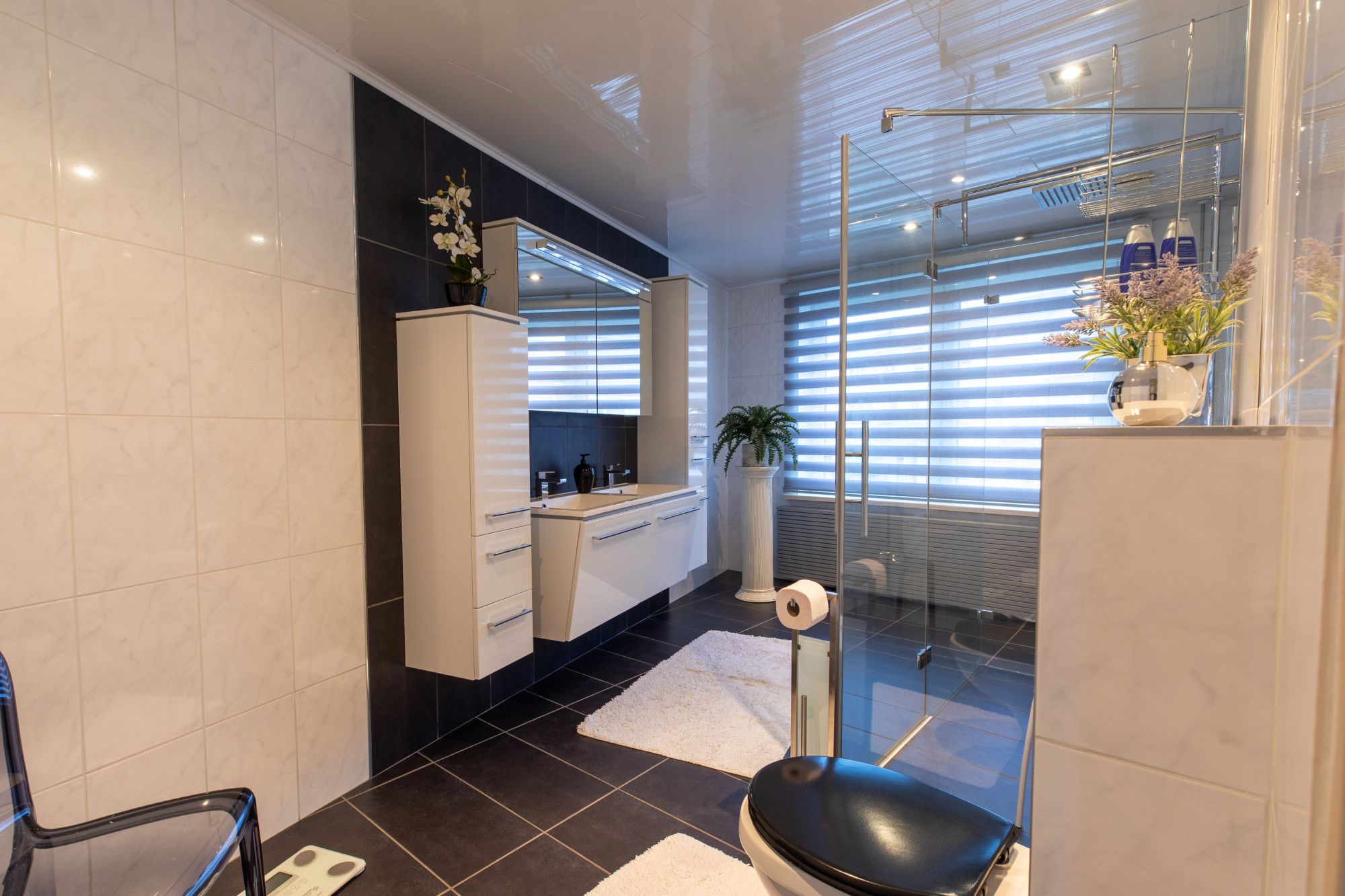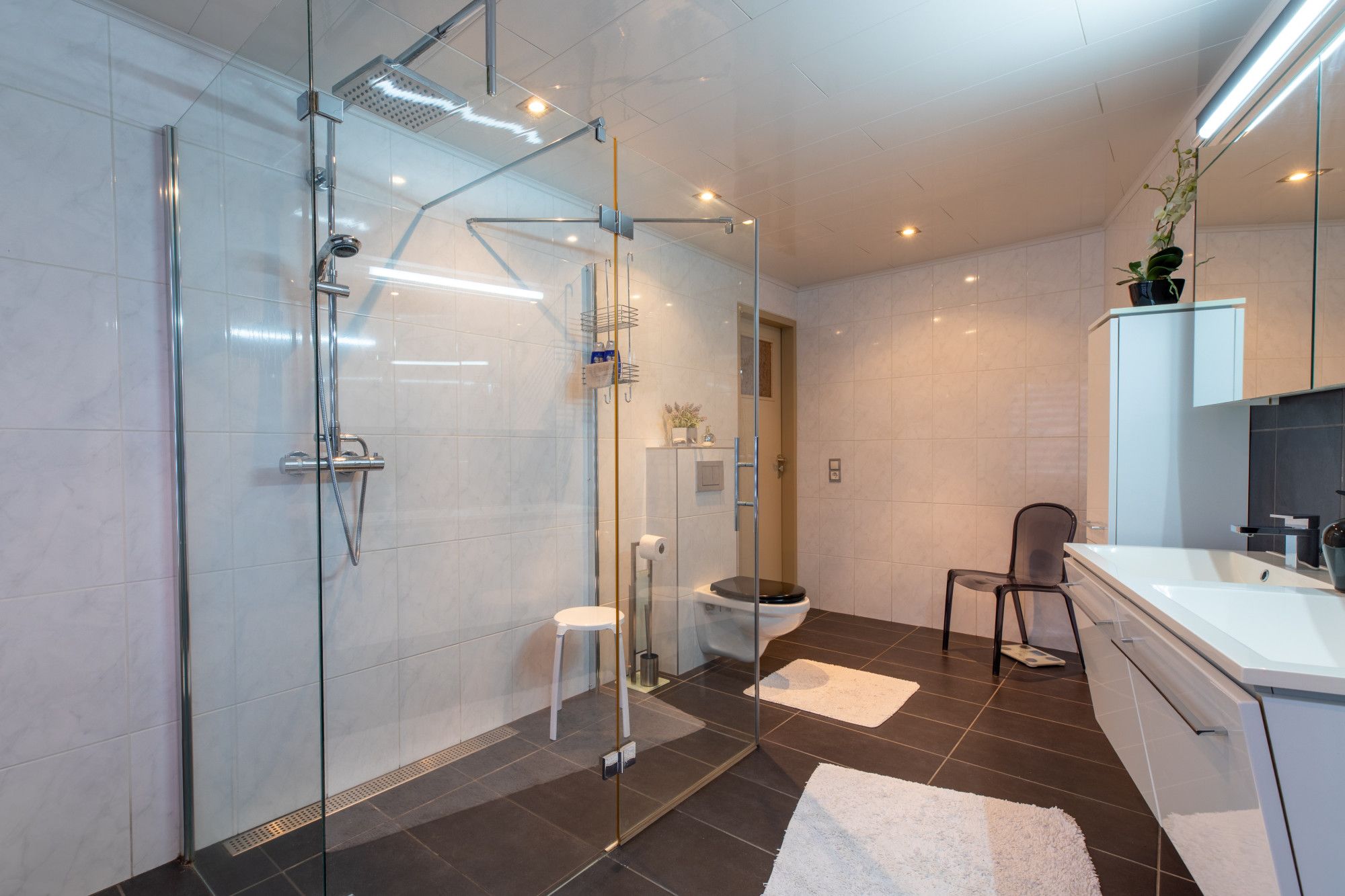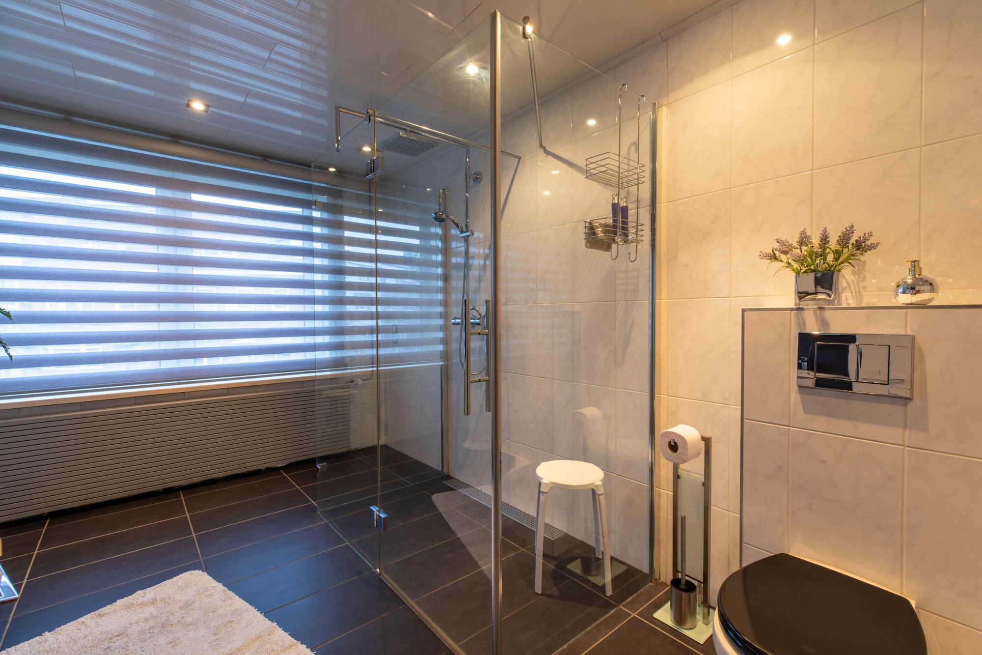 Riante badkamer (4.45 x 3.12 m) met inloopdouche, 2e wandcloset, badmeubel met dubbele wastafel.