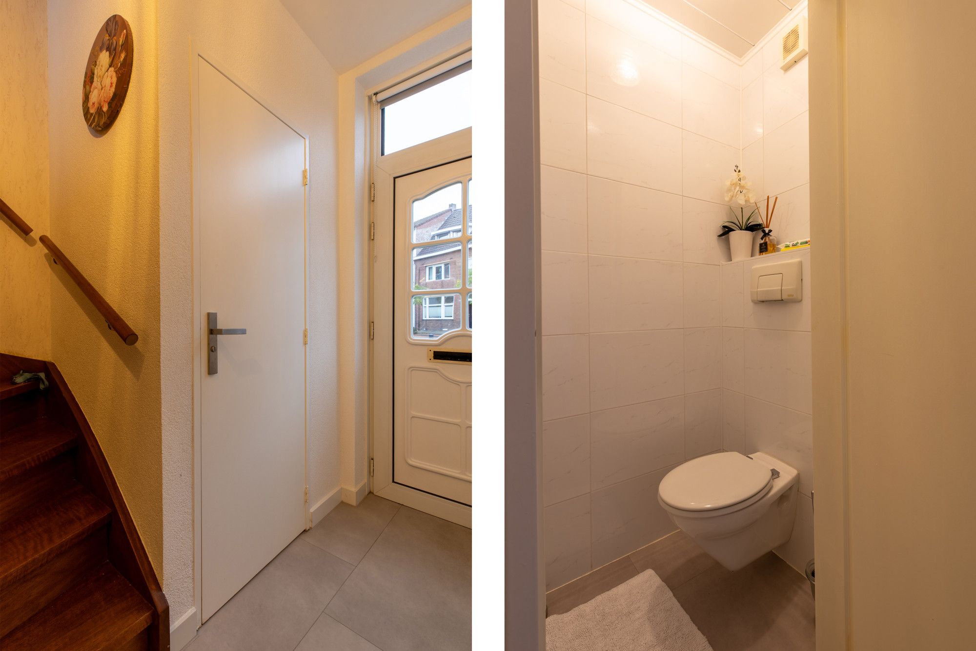 Middels de entree toegang tot de hal met nieuwe (2024) doorlopende PVC vloer, muurkast en geheel betegelde toiletruimte met wandcloset en 2 muurkasten.