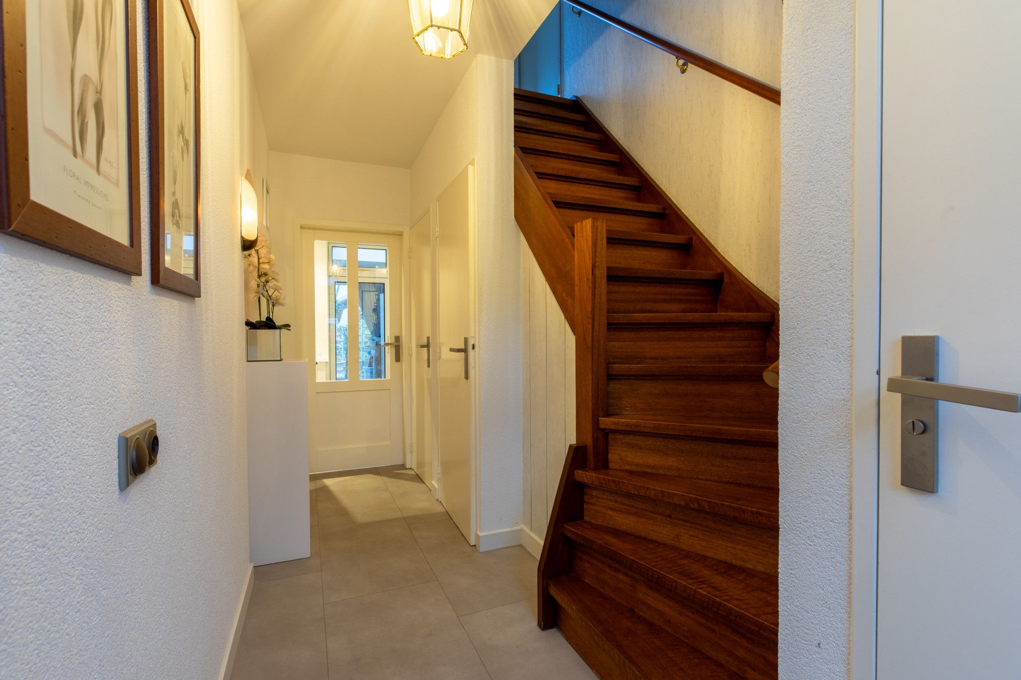 Middels hardhouten trap toegang tot de overloop met doorlopende laminaatvloer.