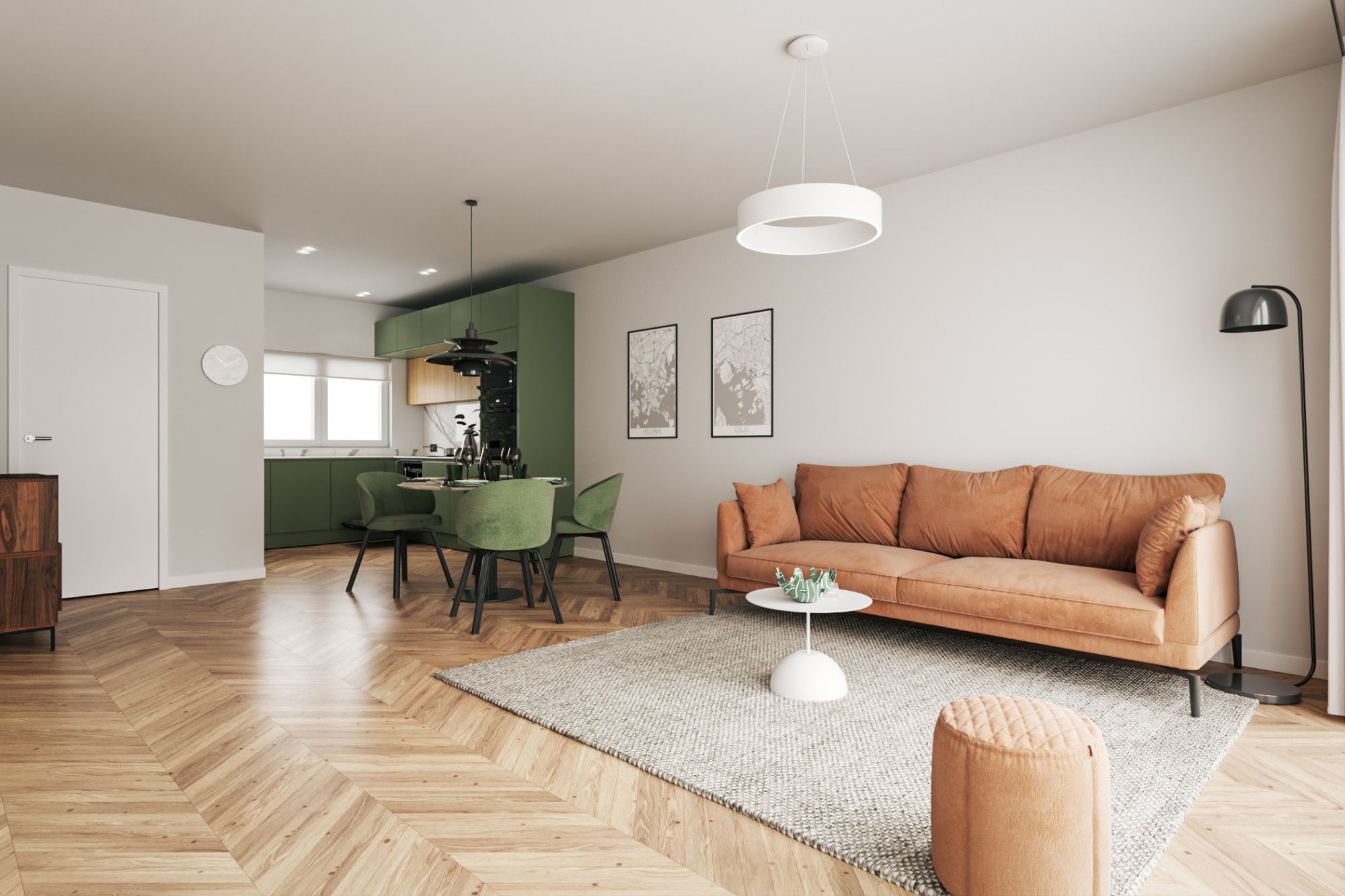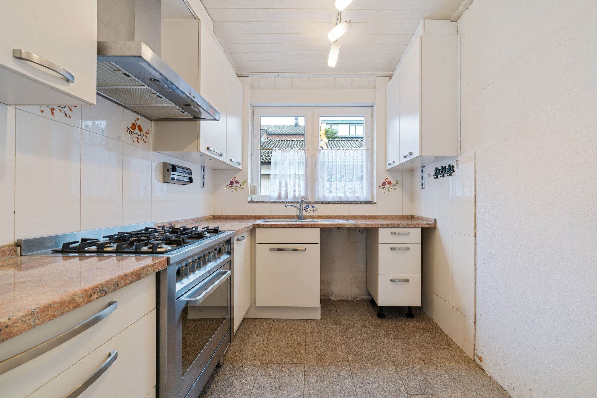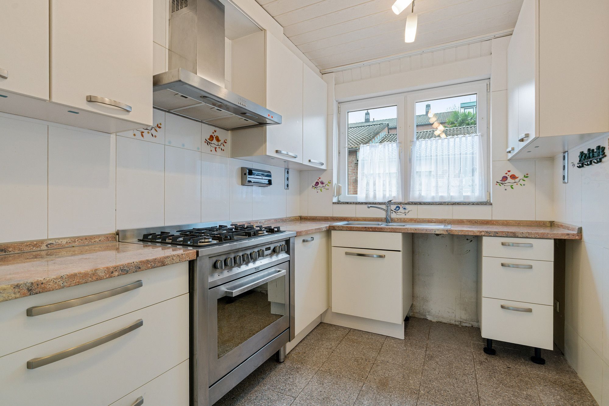 De ruime en lichte woonkamer is afgewerkt met een tegelvloer en beschikt over een praktische trapkast. De semi-open L-vormige keuken is uitgerust met apparatuur, waaronder een gasfornuis met oven en een afzuigkap.