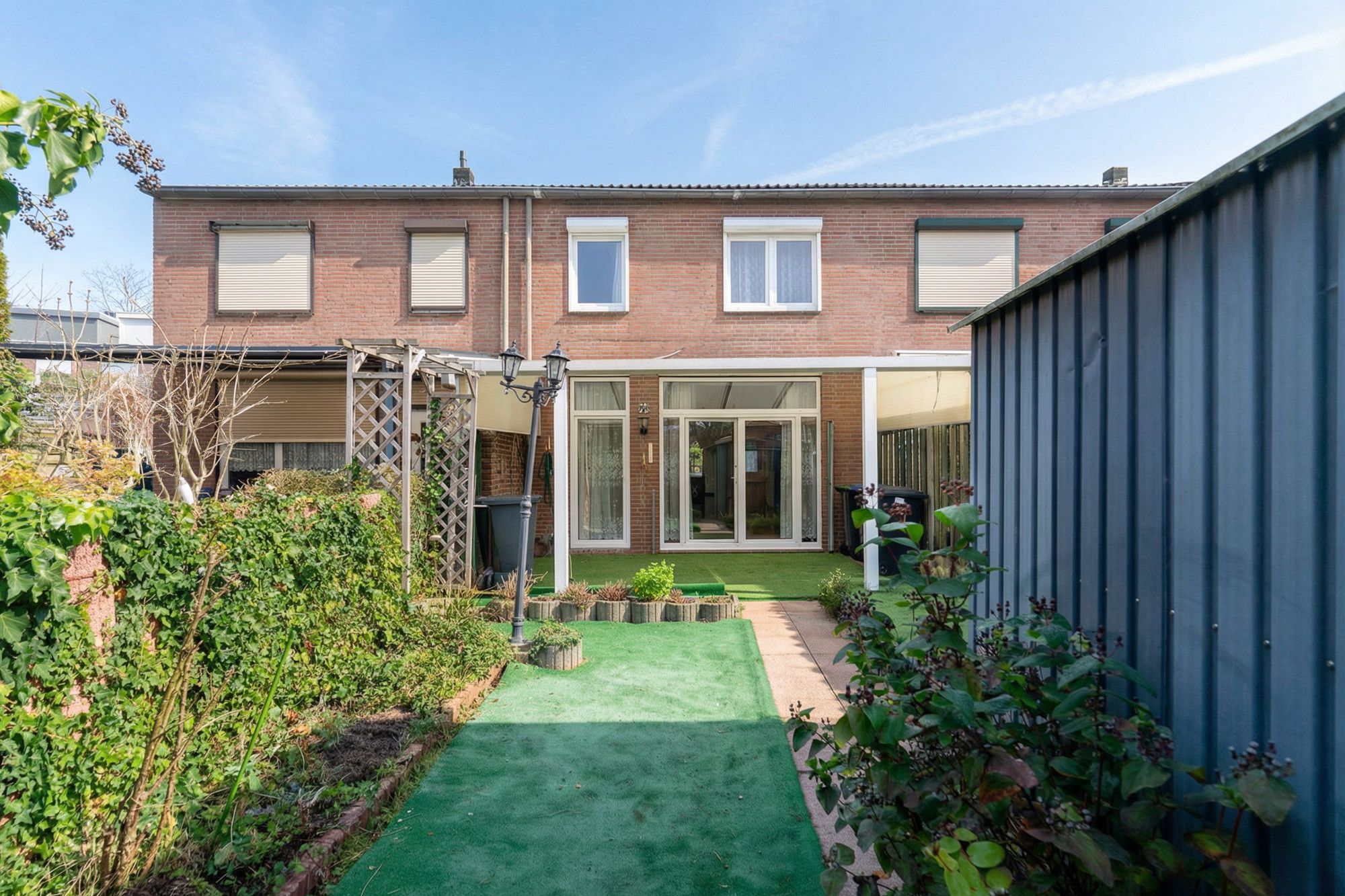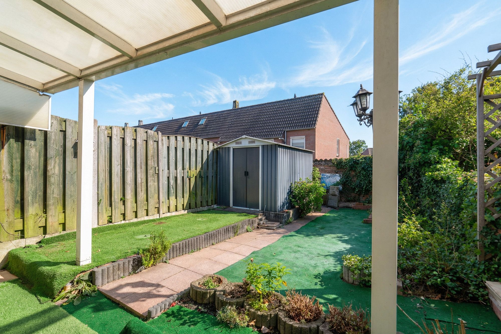 Via openslaande deuren in de woonkamer heeft u direct toegang tot de achtertuin, welke is voorzien van een overkapping, terras, tuinhuis en een achteringang.