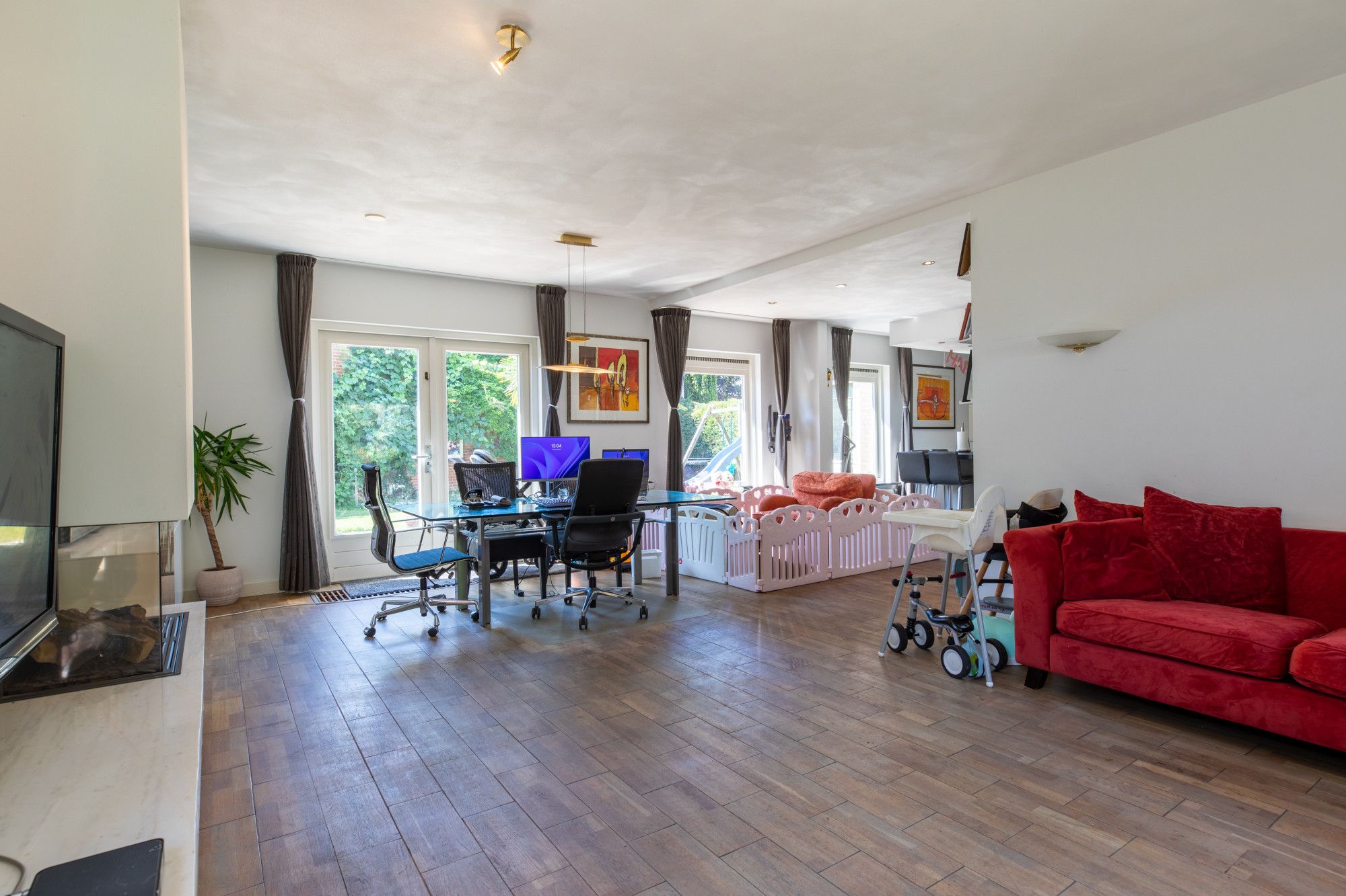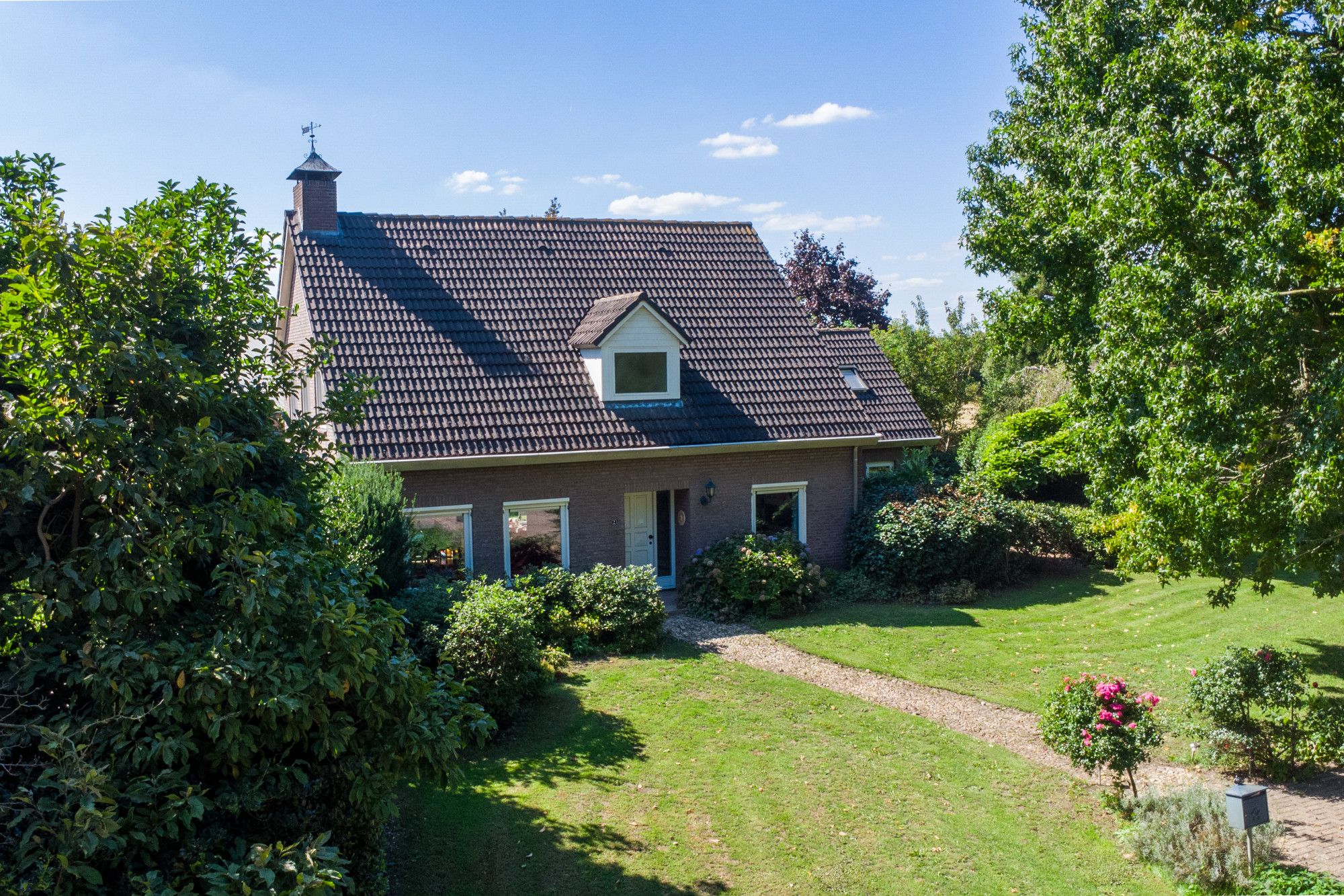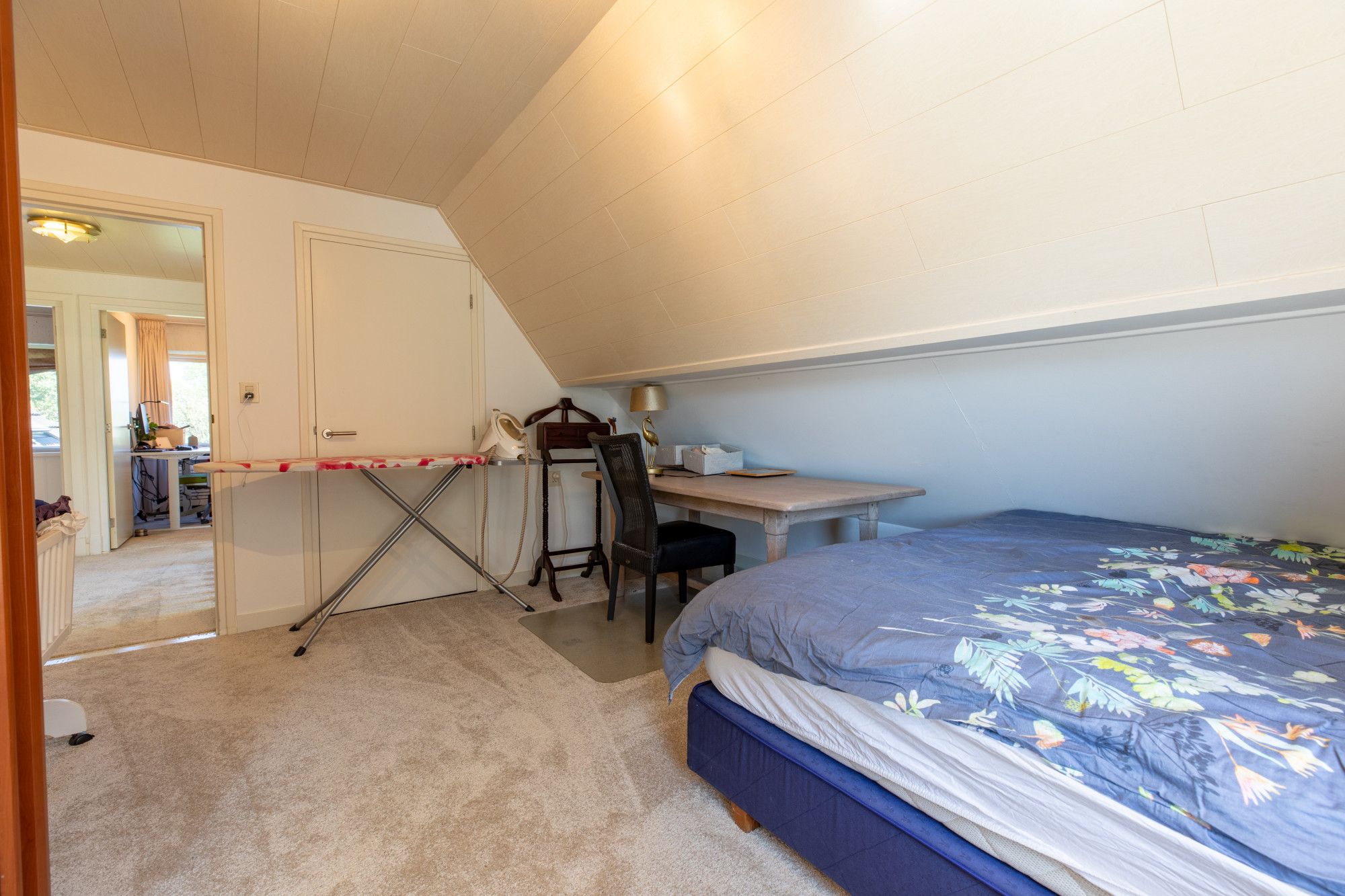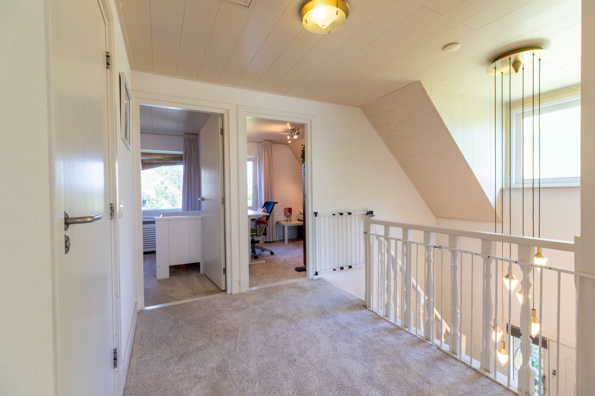 Je komt binnen in de hal met vide. De L-vormige woonkamer van circa 46 m² heeft een gashaard en sluit aan op de moderne keuken met hoogwaardige inbouwapparatuur. Daarnaast zijn er een kantoor/werkkamer, een bijkeuken met aanrecht en witgoedaansluitingen en een toiletruimte. De inpandige garage beschikt over een elektrische poort, via een vaste trap is de zolder bereikbaar met opslag en de opstelling van de cv-ketel voor de woning. Boven liggen vier slaapkamers van circa 15,7 m², 13 m², 10 m² en 8,2 m². De grootste slaapkamer is voorzien van een airco. De badkamer is modern en luxe uitgevoerd met een wastafel, inloopdouche, urinoir en toilet. Via een vlizotrap bereik je de tweede zolderverdieping, een open ruimte voor extra berging.