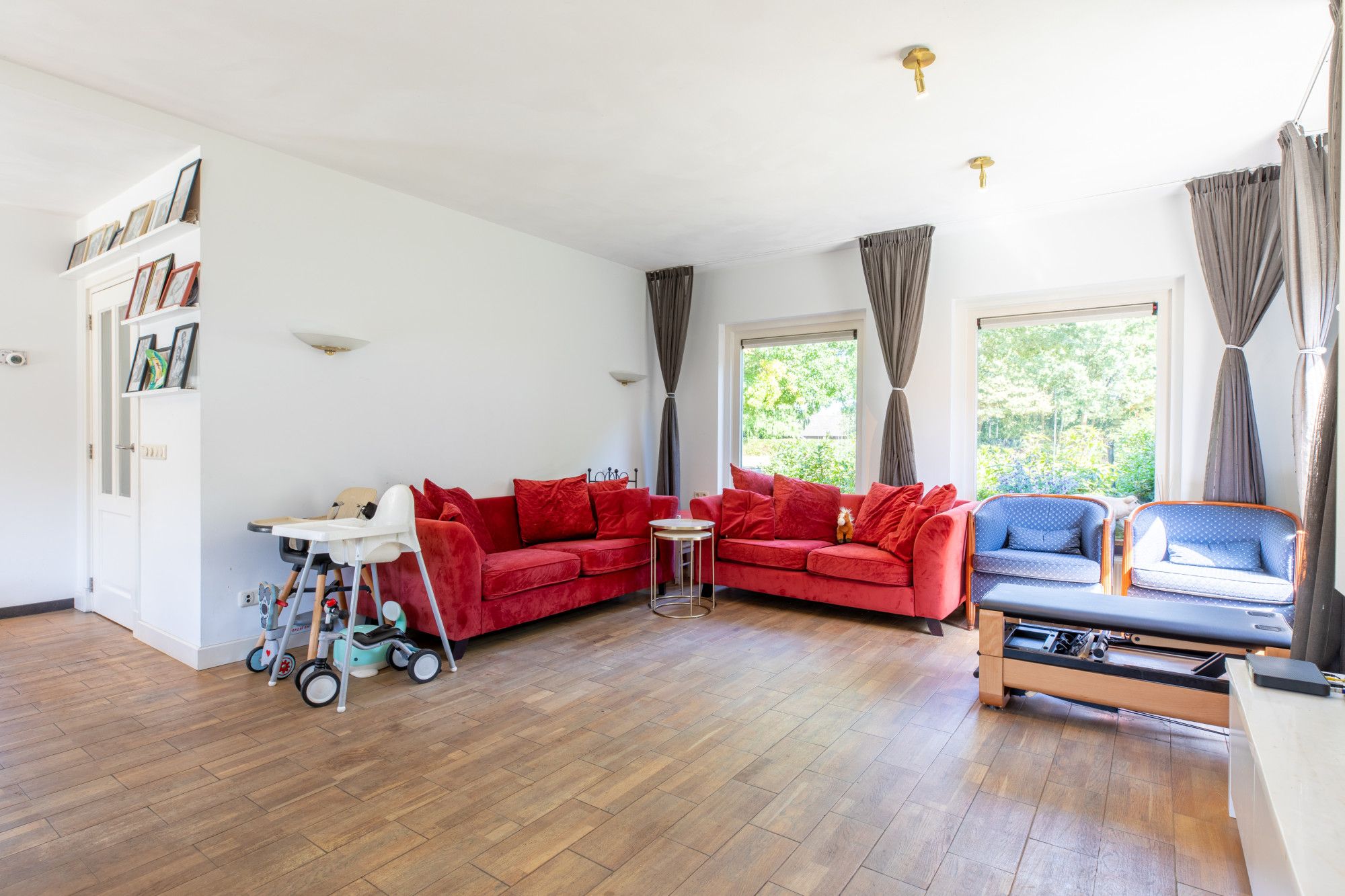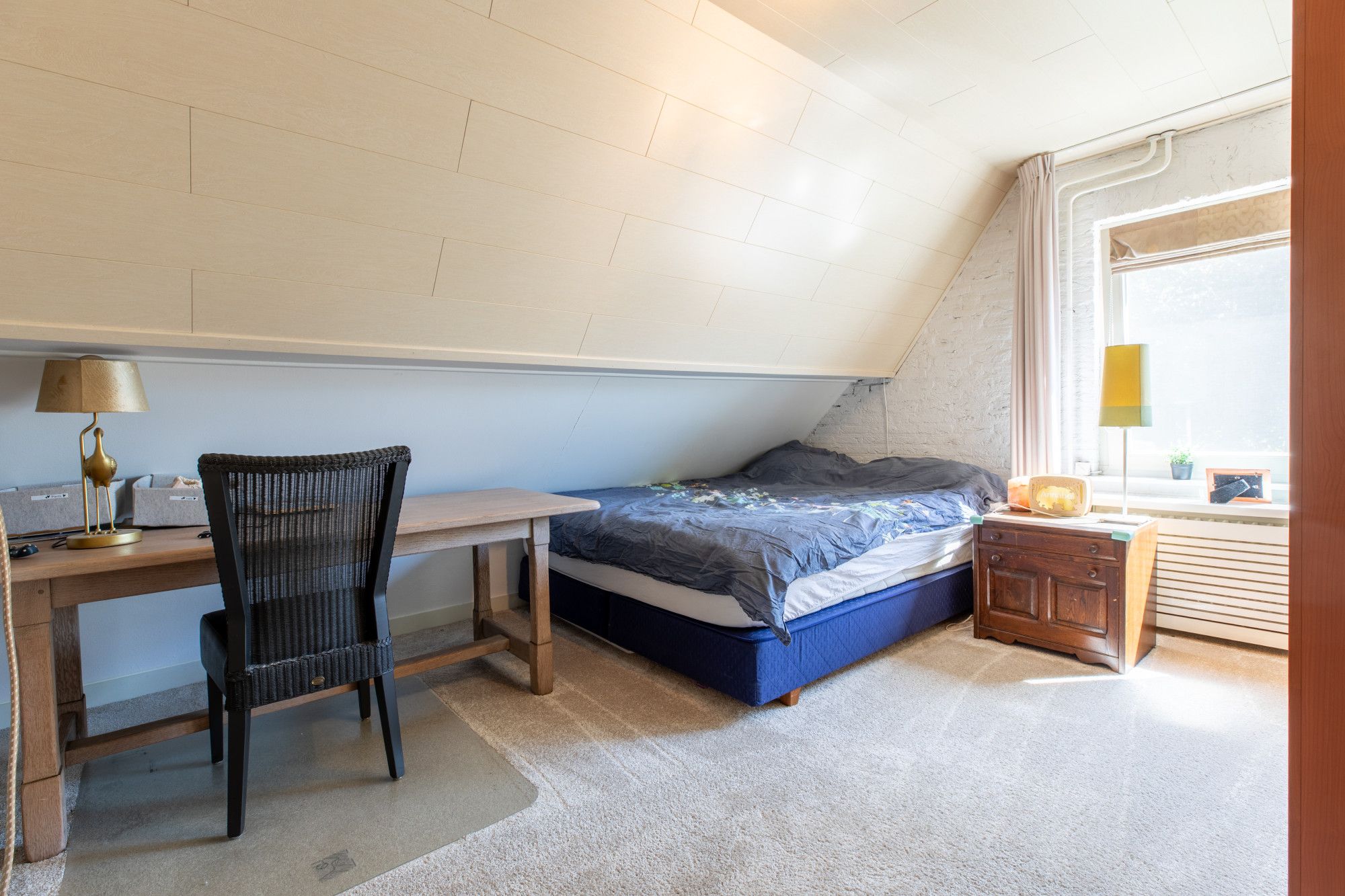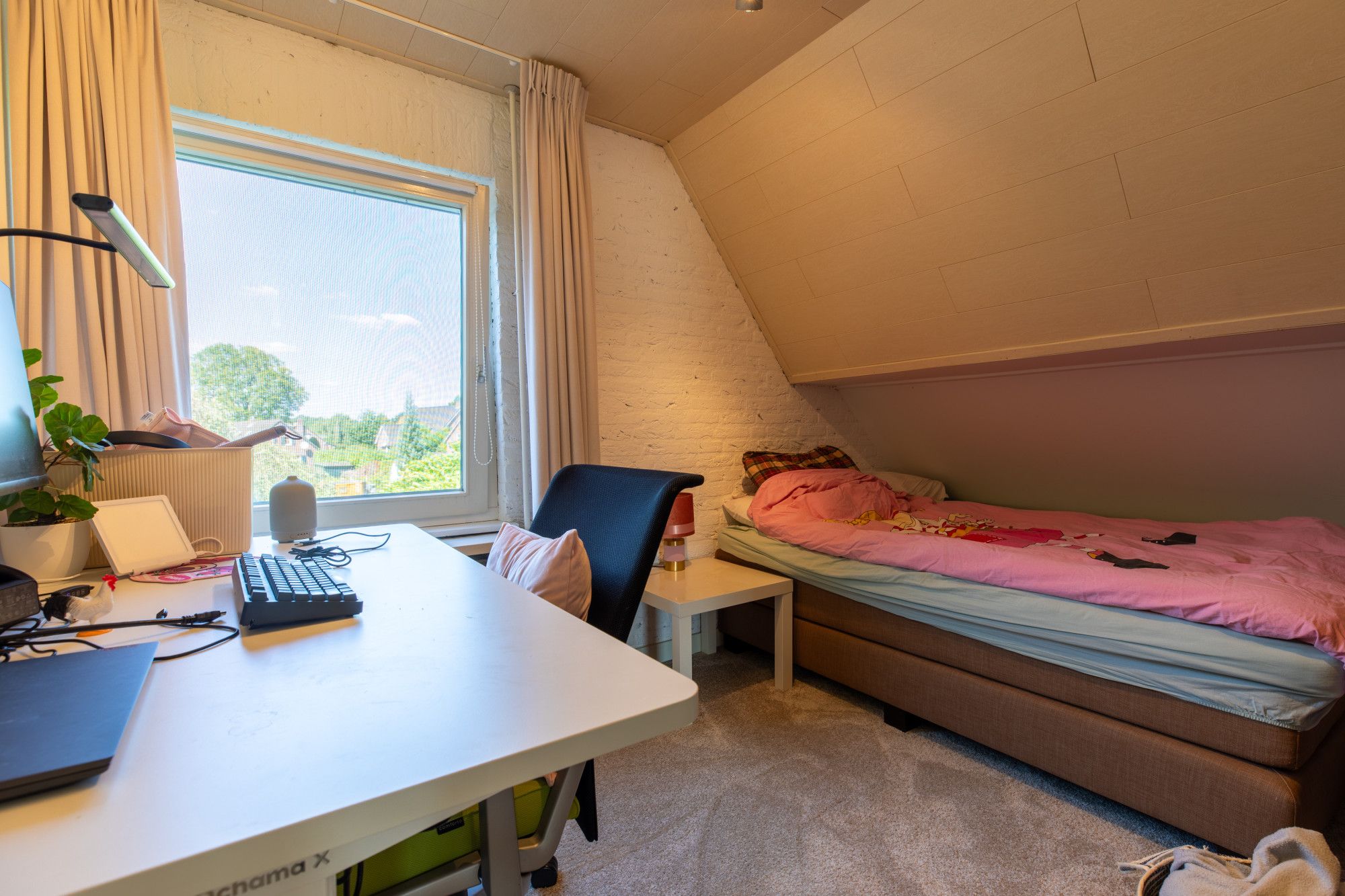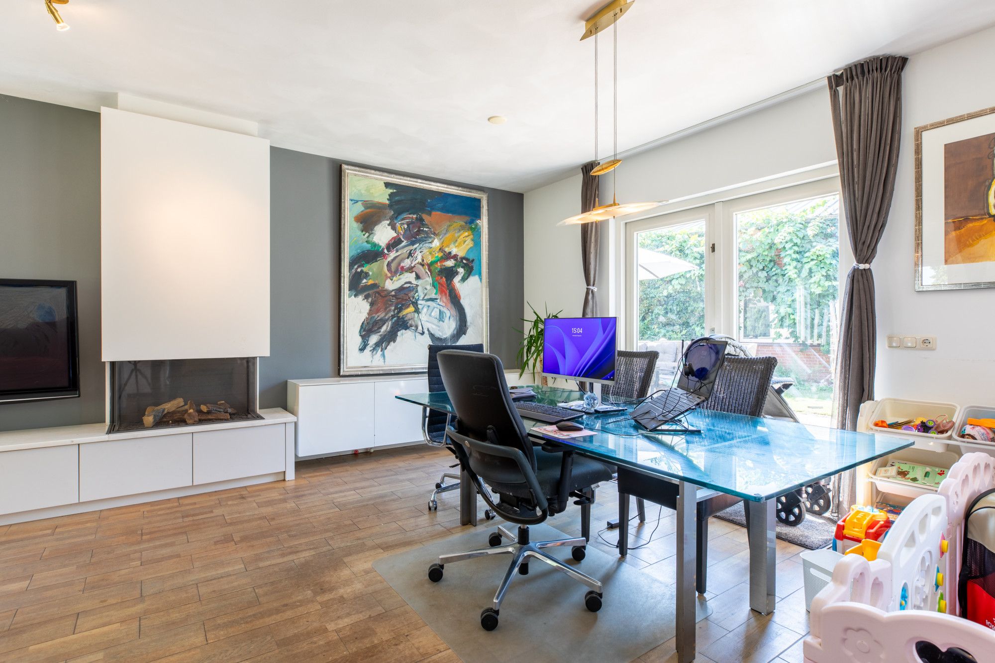 Je komt binnen in de hal met vide. De L-vormige woonkamer van circa 46 m² heeft een gashaard en sluit aan op de moderne keuken met hoogwaardige inbouwapparatuur. Daarnaast zijn er een kantoor/werkkamer, een bijkeuken met aanrecht en witgoedaansluitingen en een toiletruimte. De inpandige garage beschikt over een elektrische poort, via een vaste trap is de zolder bereikbaar met opslag en de opstelling van de cv-ketel voor de woning. Boven liggen vier slaapkamers van circa 15,7 m², 13 m², 10 m² en 8,2 m². De grootste slaapkamer is voorzien van een airco. De badkamer is modern en luxe uitgevoerd met een wastafel, inloopdouche, urinoir en toilet. Via een vlizotrap bereik je de tweede zolderverdieping, een open ruimte voor extra berging.