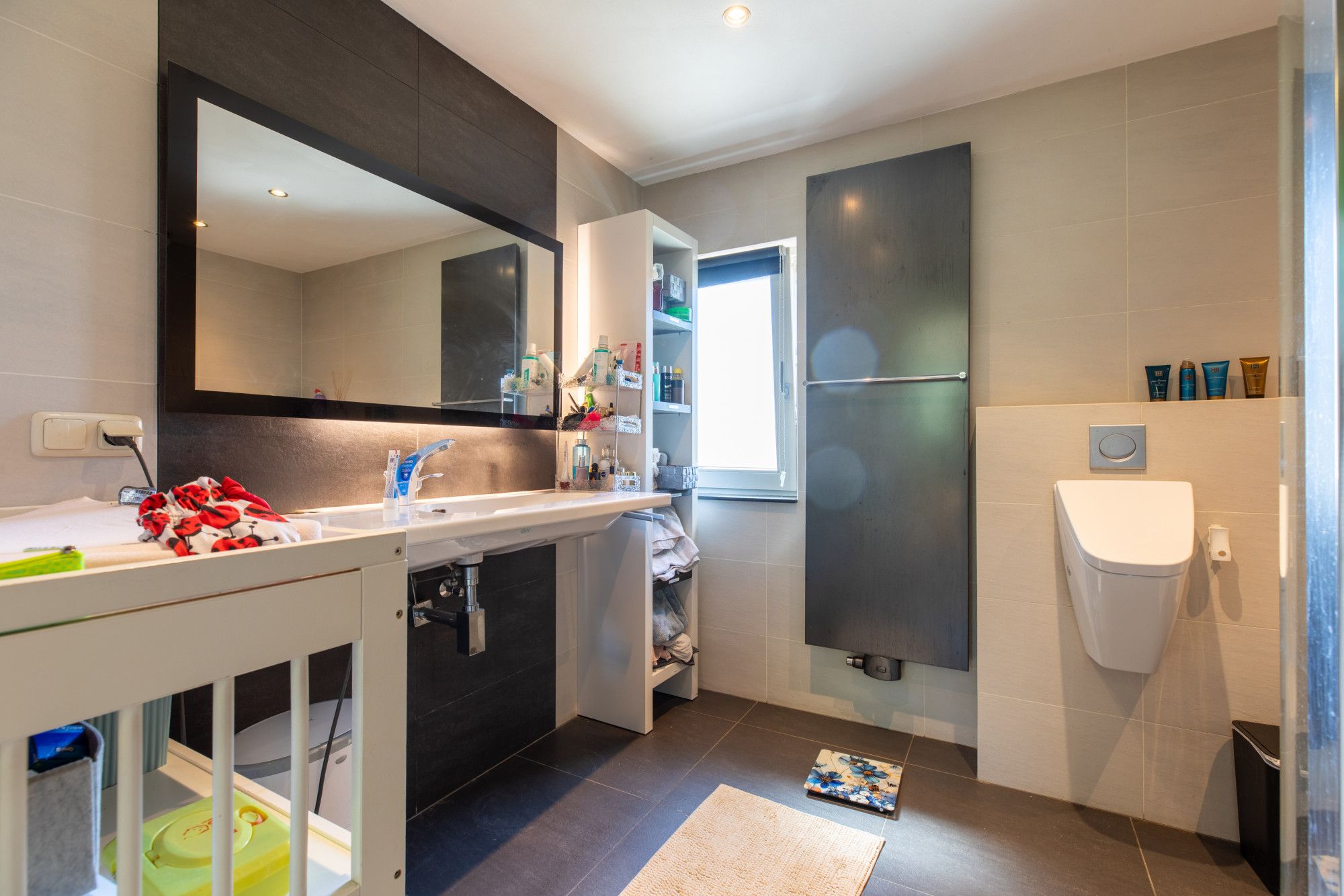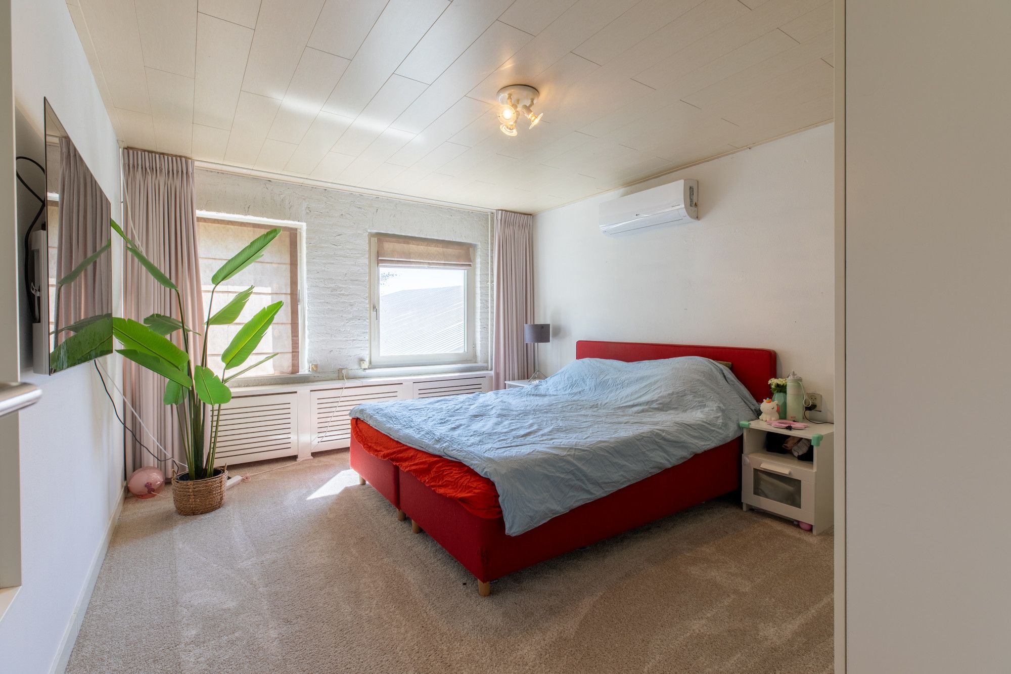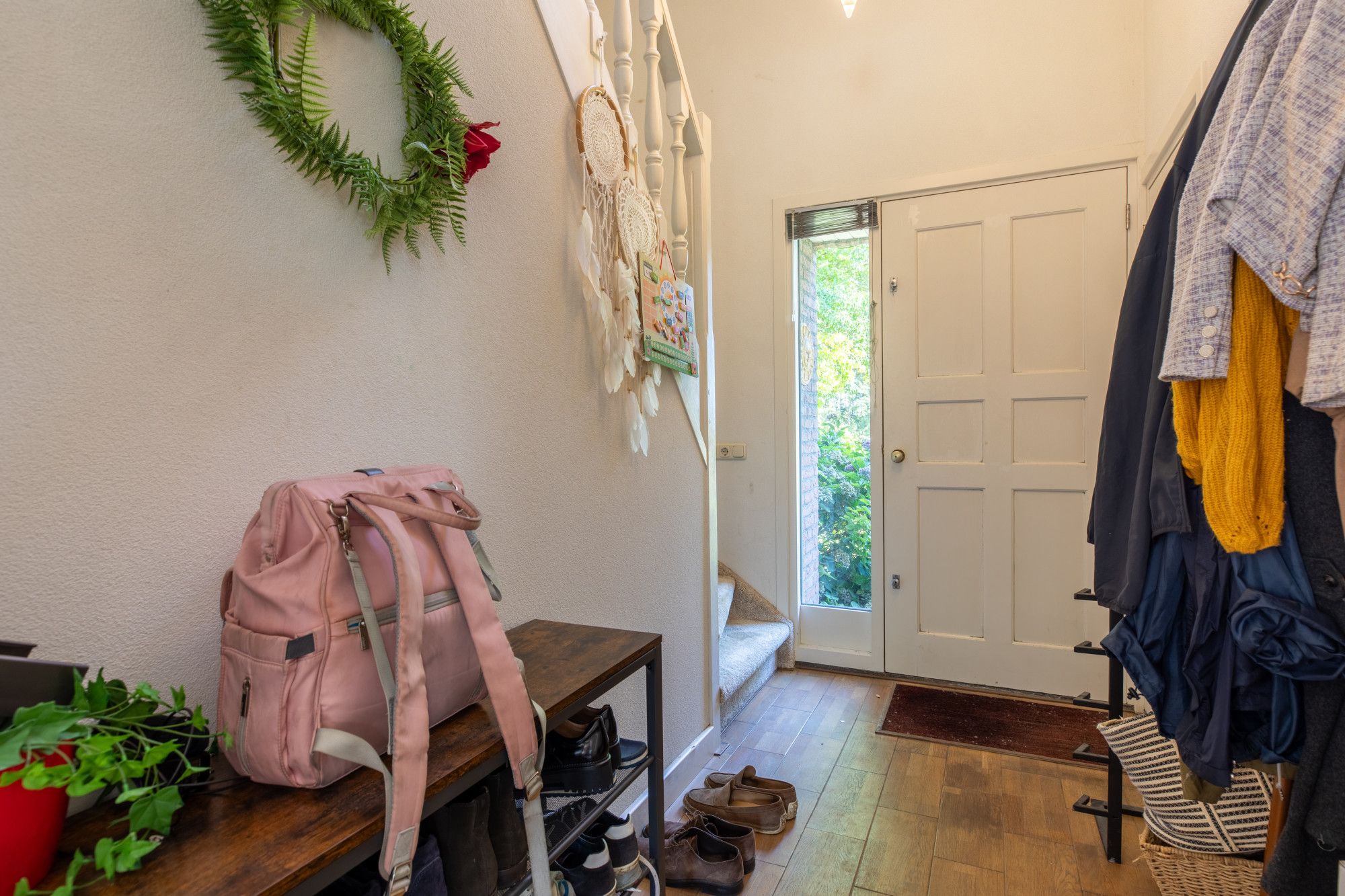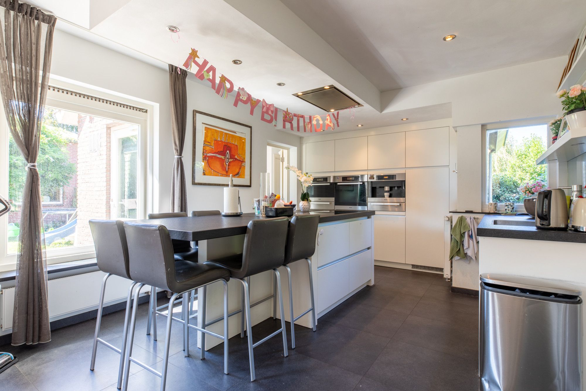 Je komt binnen in de hal met vide. De L-vormige woonkamer van circa 46 m² heeft een gashaard en sluit aan op de moderne keuken met hoogwaardige inbouwapparatuur. Daarnaast zijn er een kantoor/werkkamer, een bijkeuken met aanrecht en witgoedaansluitingen en een toiletruimte. De inpandige garage beschikt over een elektrische poort, via een vaste trap is de zolder bereikbaar met opslag en de opstelling van de cv-ketel voor de woning. Boven liggen vier slaapkamers van circa 15,7 m², 13 m², 10 m² en 8,2 m². De grootste slaapkamer is voorzien van een airco. De badkamer is modern en luxe uitgevoerd met een wastafel, inloopdouche, urinoir en toilet. Via een vlizotrap bereik je de tweede zolderverdieping, een open ruimte voor extra berging.