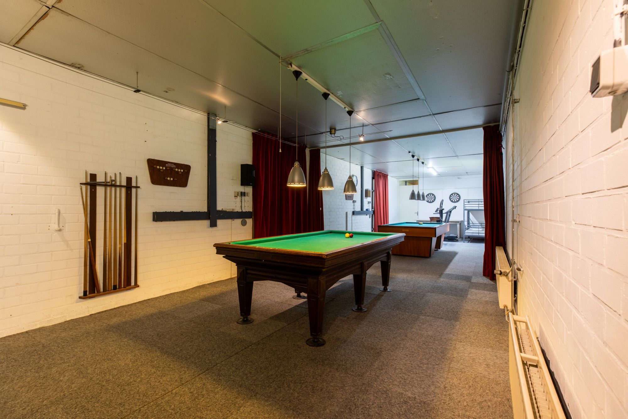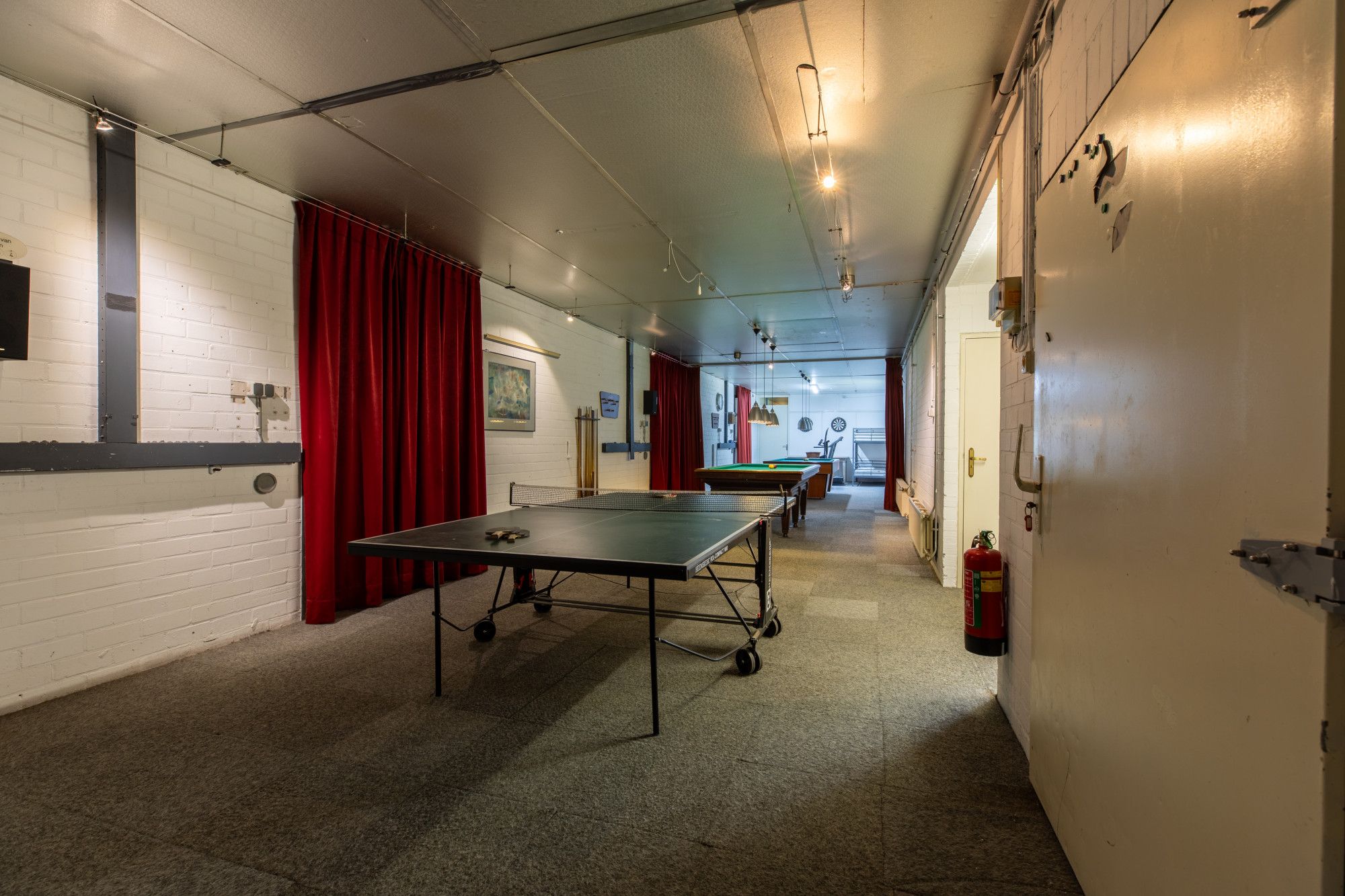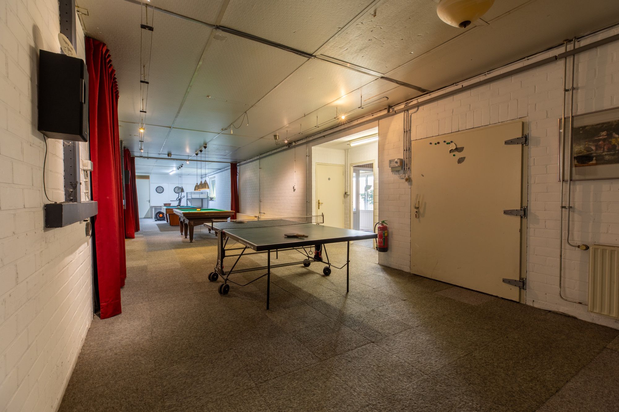 Verder is er een recreatieruimte van circa 79,2 m², momenteel ingericht met twee biljarts en een tafeltennistafel. De grote inpandige garage van circa 47,8 m² is uitgerust met een elektrisch bedienbare sectionaaldeur en loopdeur. Een compacte kantoor-/kantineruimte van circa 12,5 m² met keukenblok is eveneens aanwezig. Het geheel is aangesloten op kabel-tv en wifi en beschikt bovendien over een extra zolderruimte van circa 172 m².