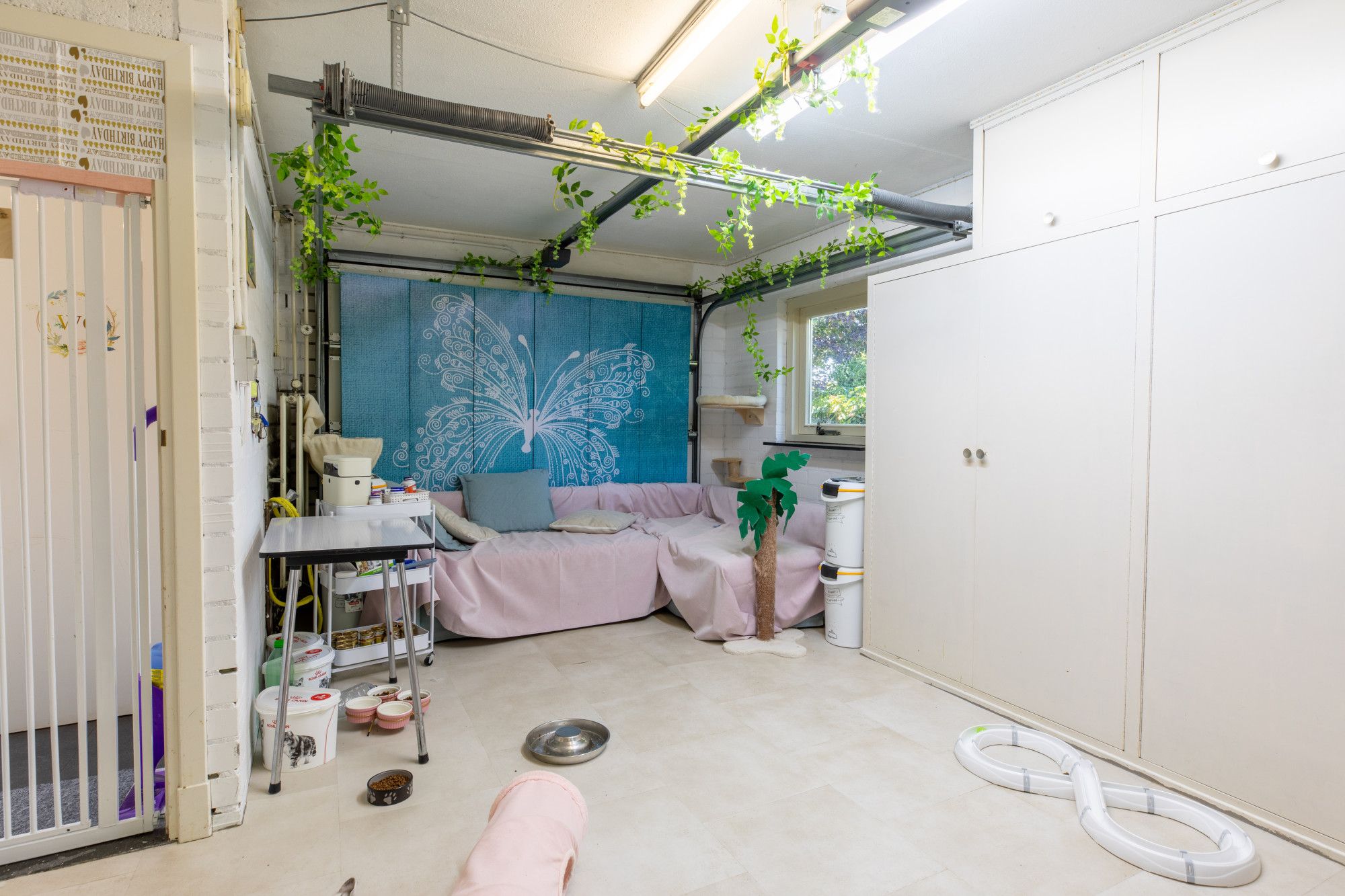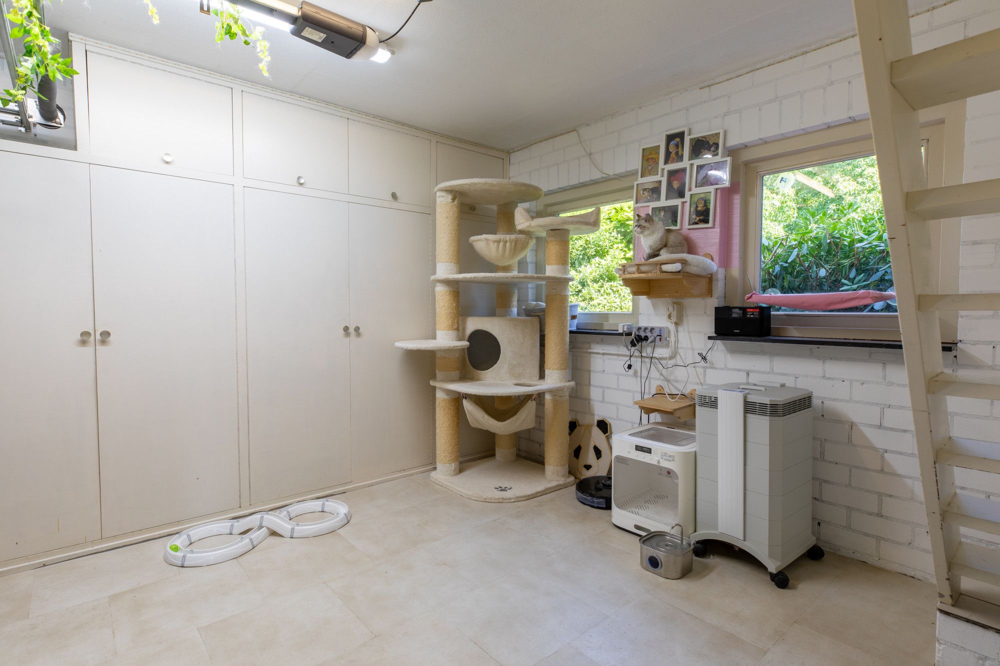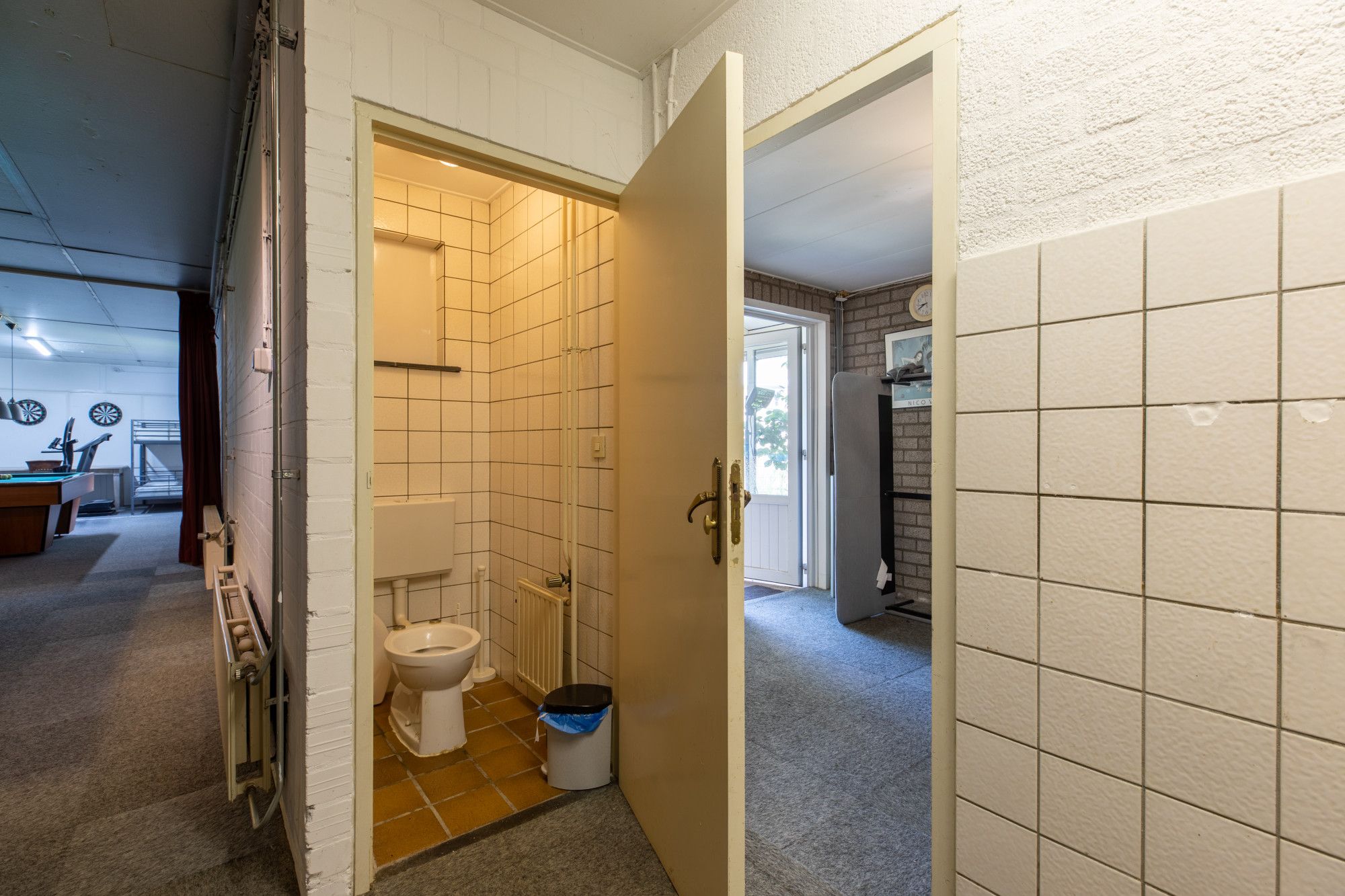 Verder is er een recreatieruimte van circa 79,2 m², momenteel ingericht met twee biljarts en een tafeltennistafel. De grote inpandige garage van circa 47,8 m² is uitgerust met een elektrisch bedienbare sectionaaldeur en loopdeur. Een compacte kantoor-/kantineruimte van circa 12,5 m² met keukenblok is eveneens aanwezig. Het geheel is aangesloten op kabel-tv en wifi en beschikt bovendien over een extra zolderruimte van circa 172 m².