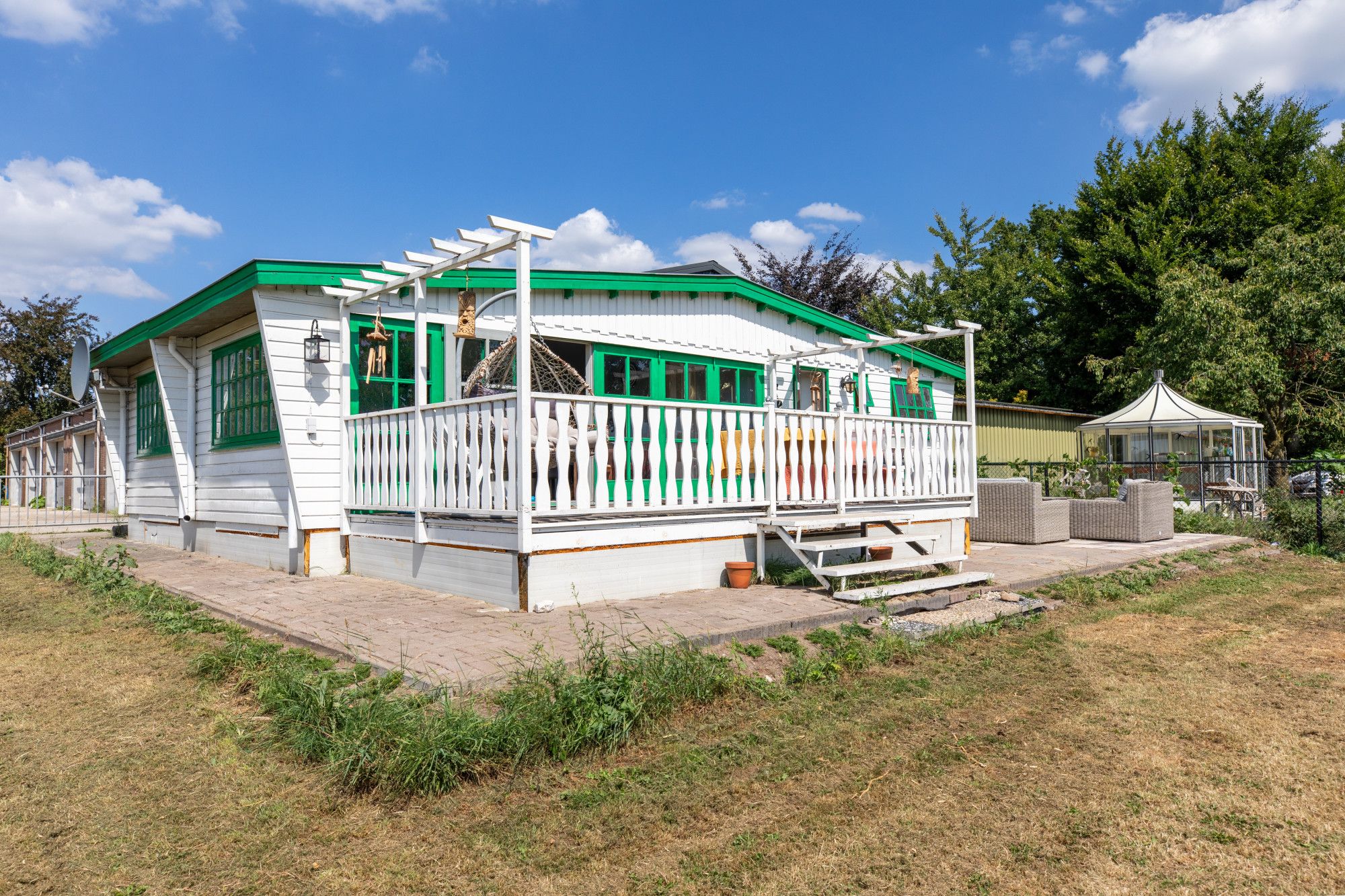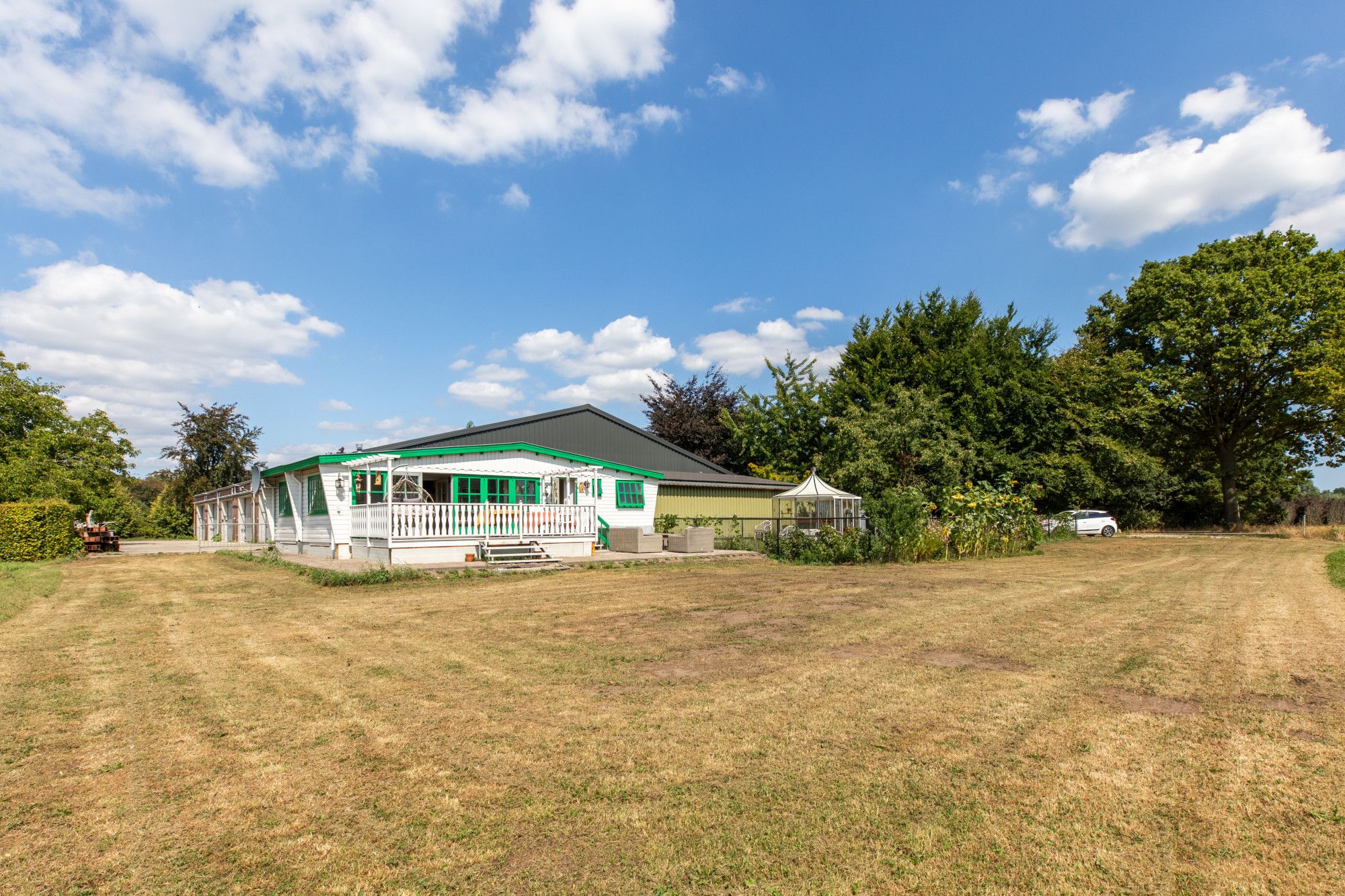 Achter de loods ligt een compleet ingerichte mantelzorgwoning van circa 90 m². Deze is aangesloten op alle voorzieningen en uitgerust met drie slaapkamers, een keuken, een badkamer, een ruime veranda en een rondom aangelegd terras. Direct naast de mantelzorgwoning bevindt zich een nieuw aangelegde moestuin met kas.