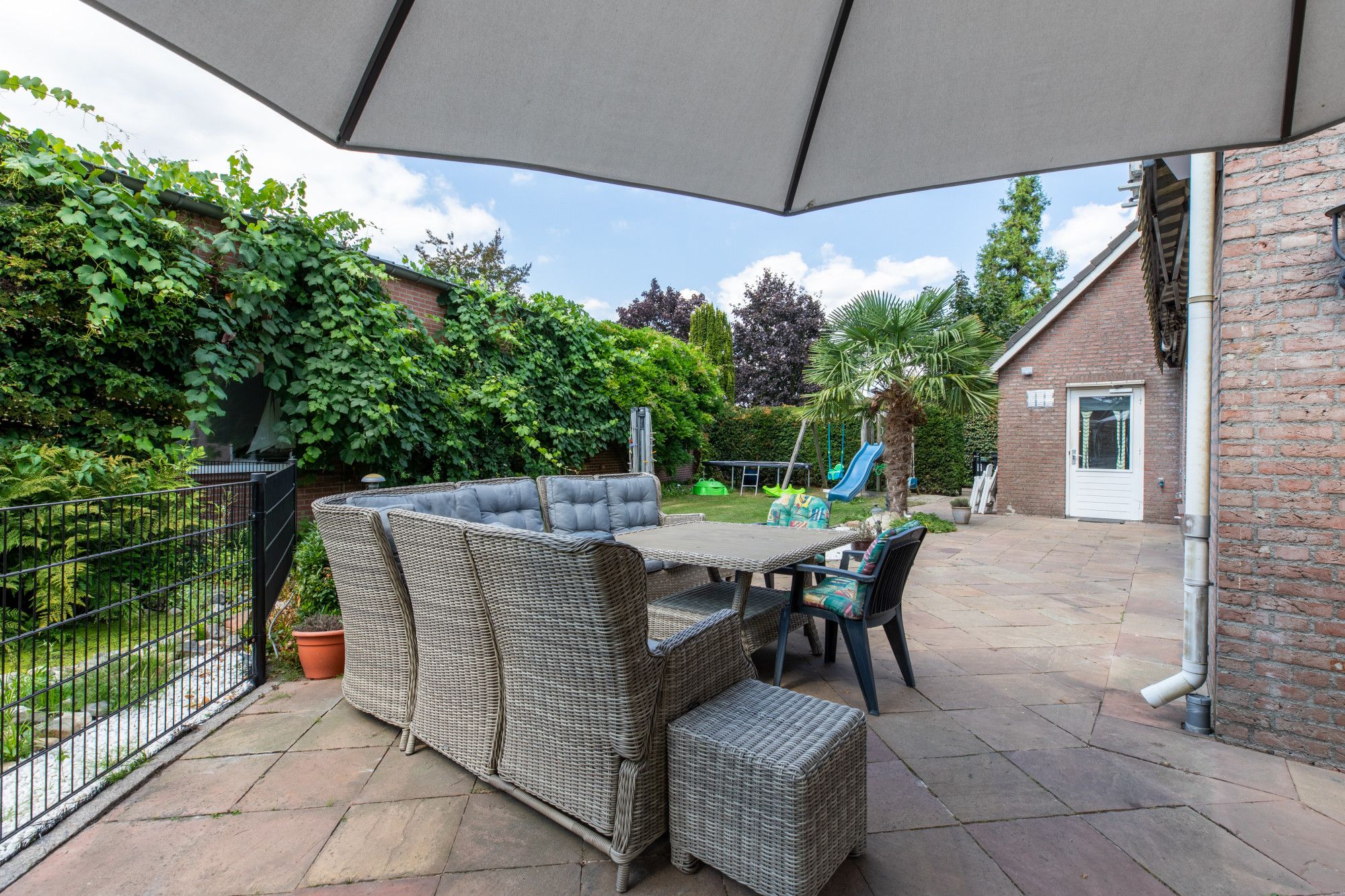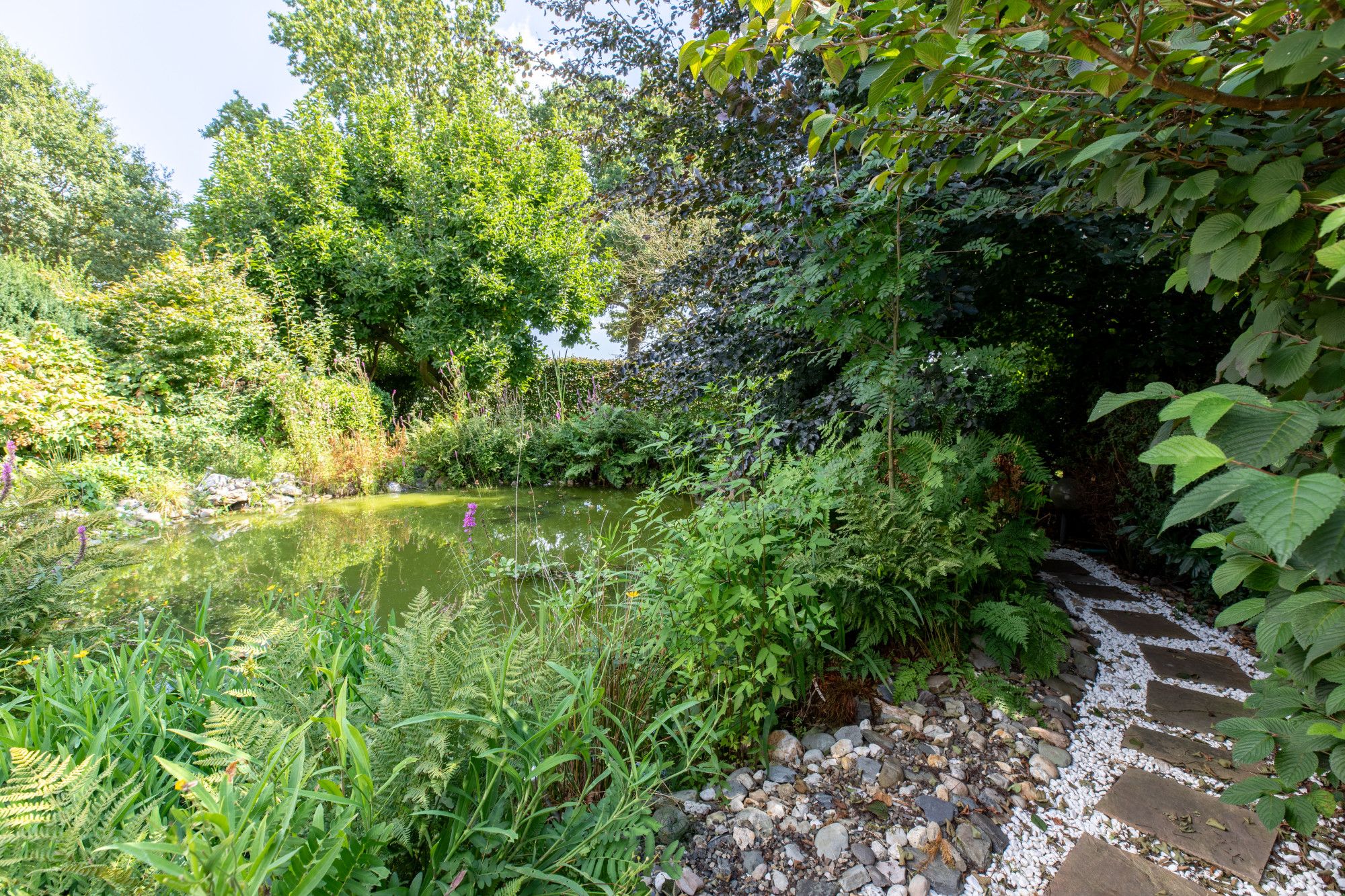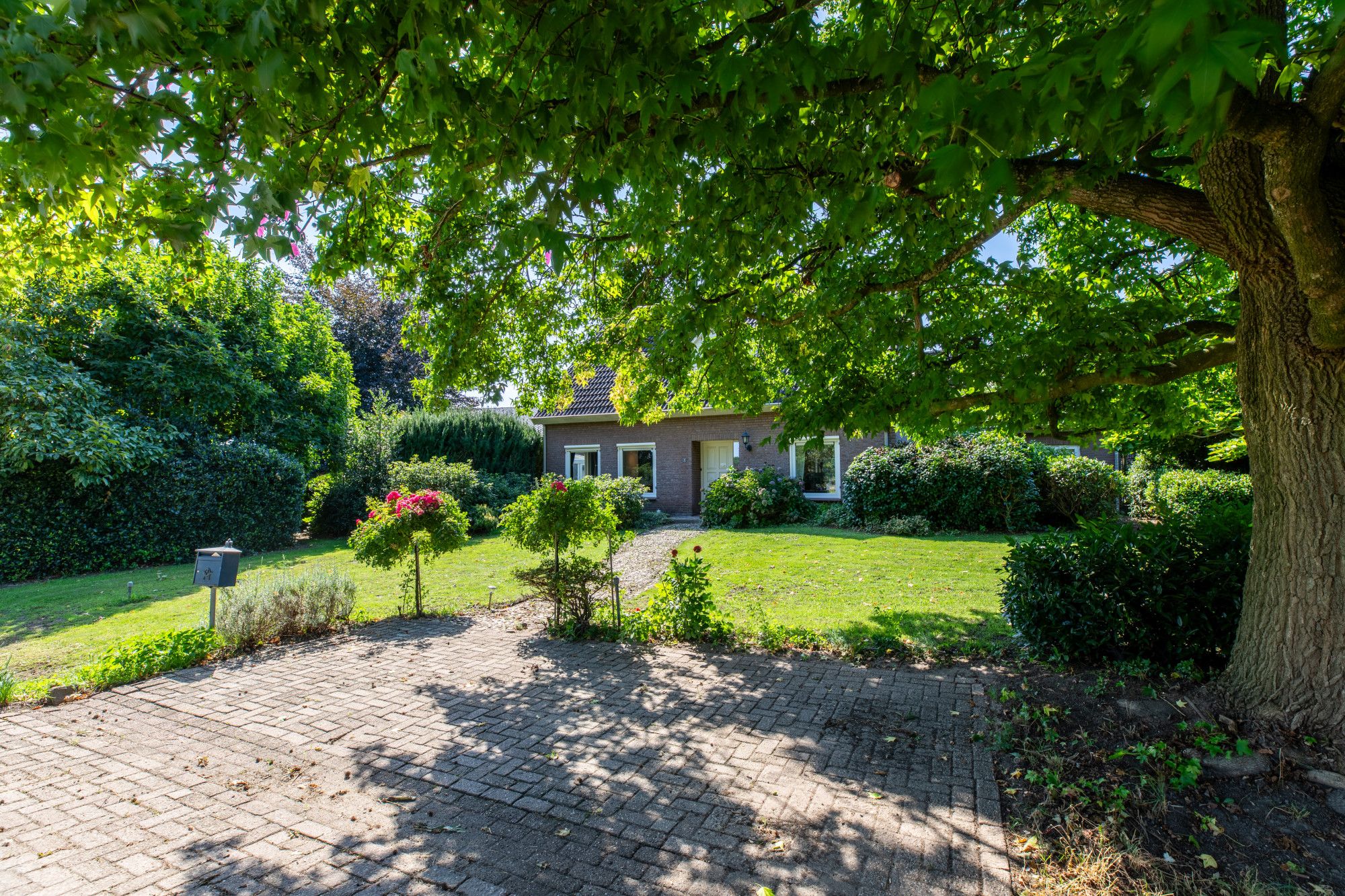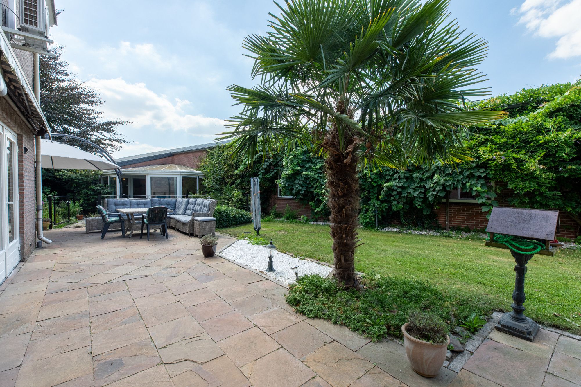 Rondom de gebouwen ligt een fraai aangelegde, met zorg onderhouden tuin met grote vijver, meerdere terrassen en een royaal gazon. Aan de voorzijde bevindt zich een brede, beklinkerde oprit met ruime parkeergelegenheid op eigen terrein. Voor de loodsen liggen betondelen als oprijlaan van circa 8,5 meter breed, zodat alle bedrijfsruimten goed bereikbaar zijn. De buitenschil bestaat uit gemetselde spouwmuren, de loodsen zijn voorzien van sectionaalpoorten.