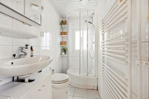 De overloop biedt toegang tot drie slaapkamers (3.50 x 3.20, 3.35 x 3.20 en 3.50 x 2.20) en de badkamer. De huidige badkamer beschikt over een kwartronde douche, tweede toilet, een wastafel met meubel. Er bestaat een nog niet uitgevoerd plan om een nieuwe badkamer te realiseren. Zie daartoe de foto's.