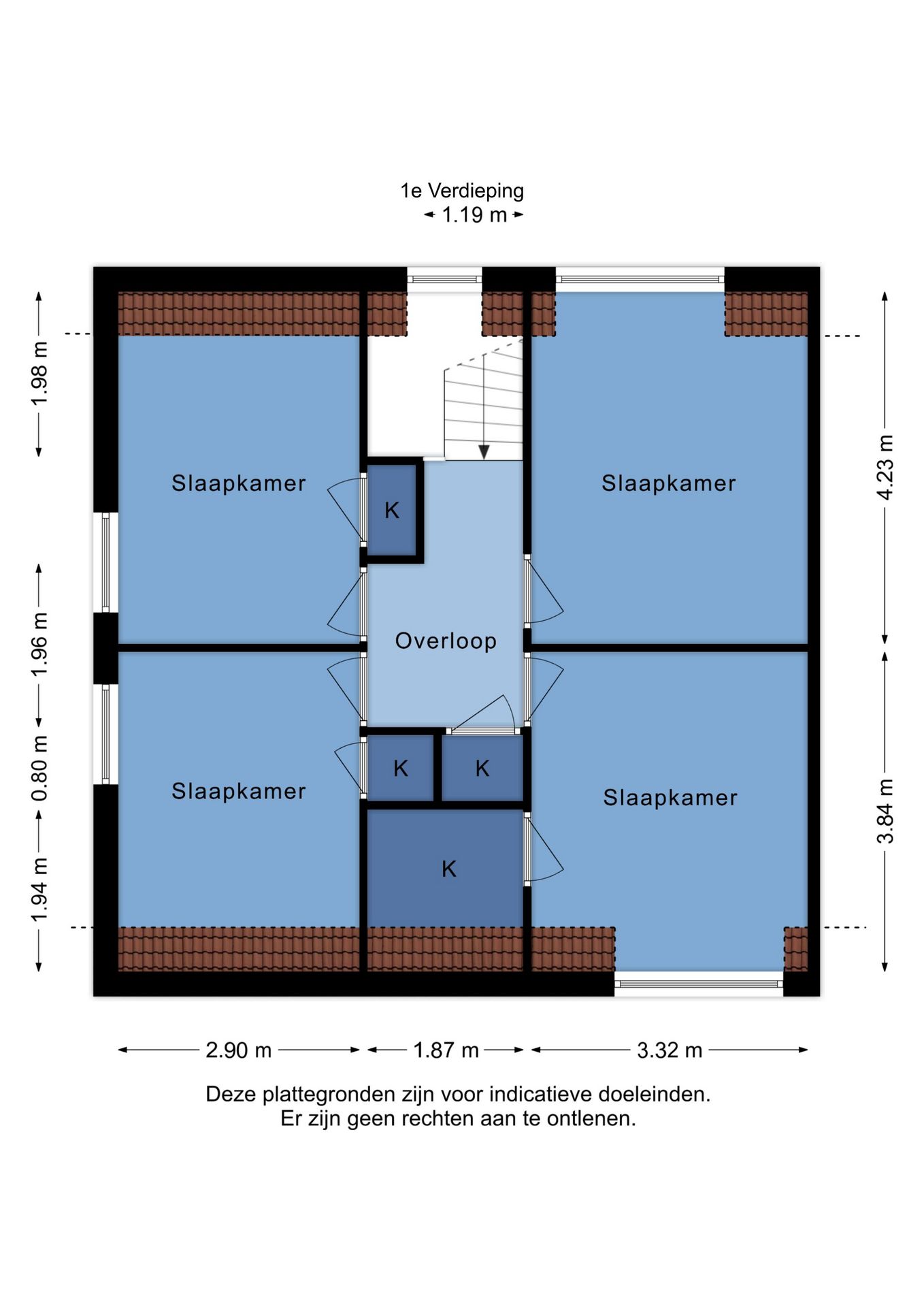 Op de eerste verdieping kun je vanuit de overloop naar vier ruime (slaap)kamers. Drie kamers hebben handige ingebouwde bergkasten. In één van de kamers is de c.v.-installatie geplaatst.