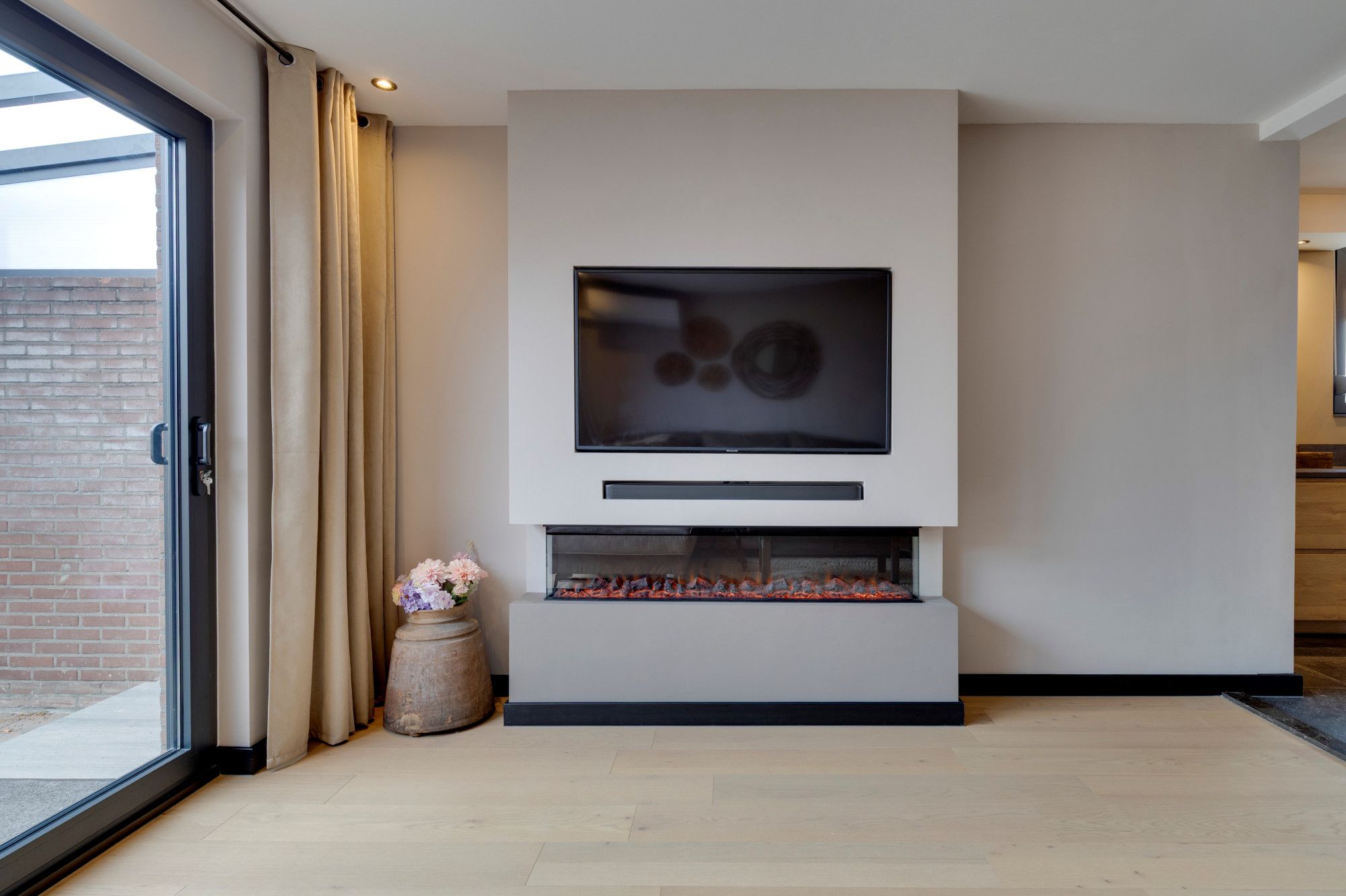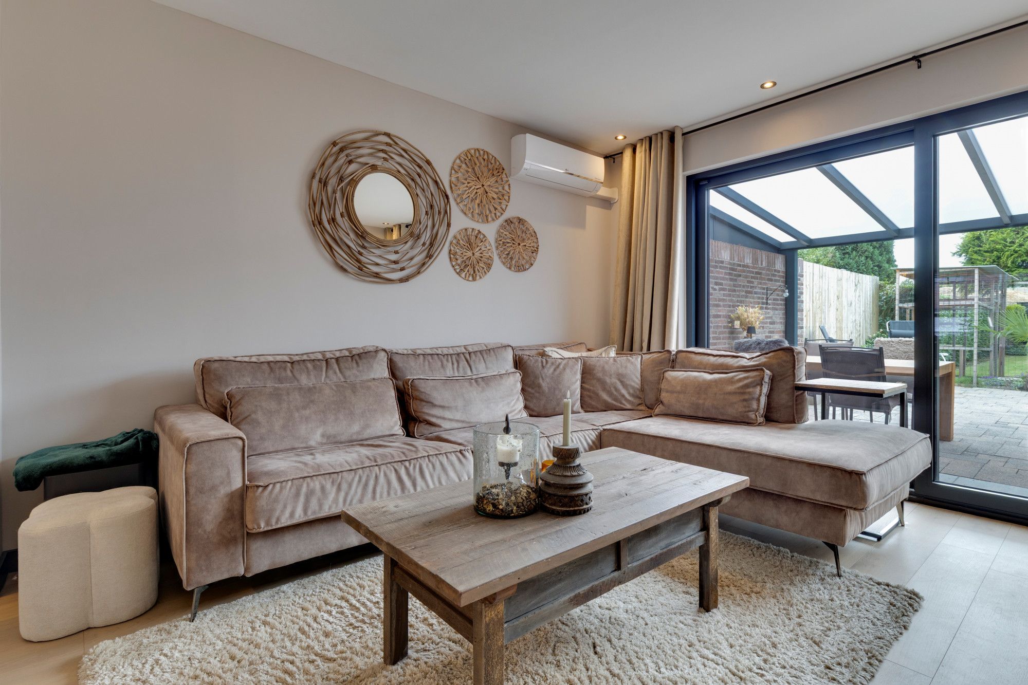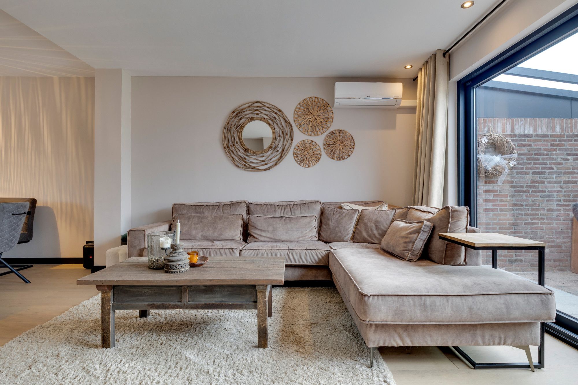 Riante L-woonkamer v.v. fraaie parketlaminaatvloer van maar liefst 9.50m diep (incl. aanbouw), airconditioning en moderne sfeerhaard en royale schuifpui naar het royale overdekte terras en de mooi aangelegde tuin met achtergelegen houten tuinhuis.