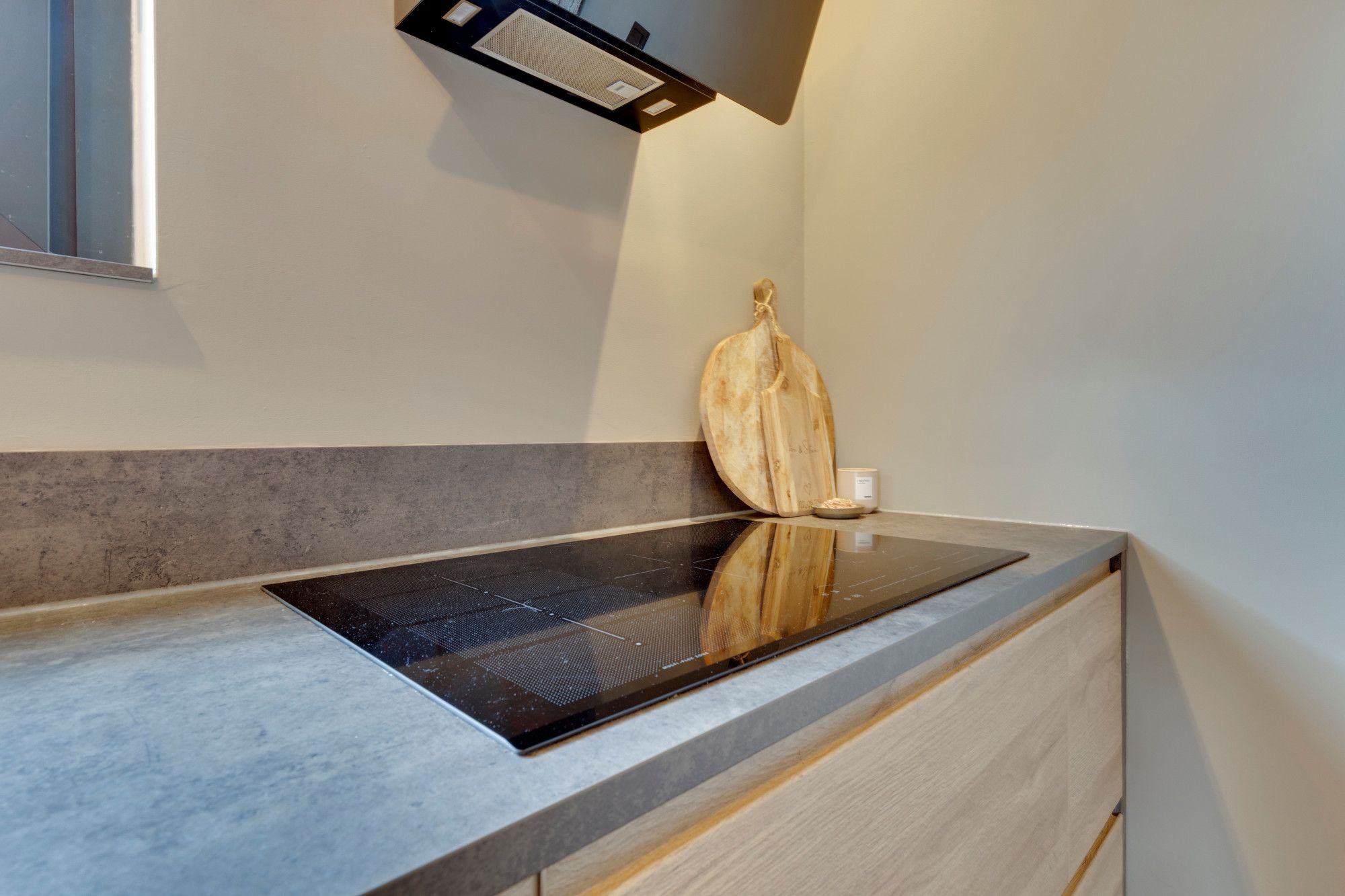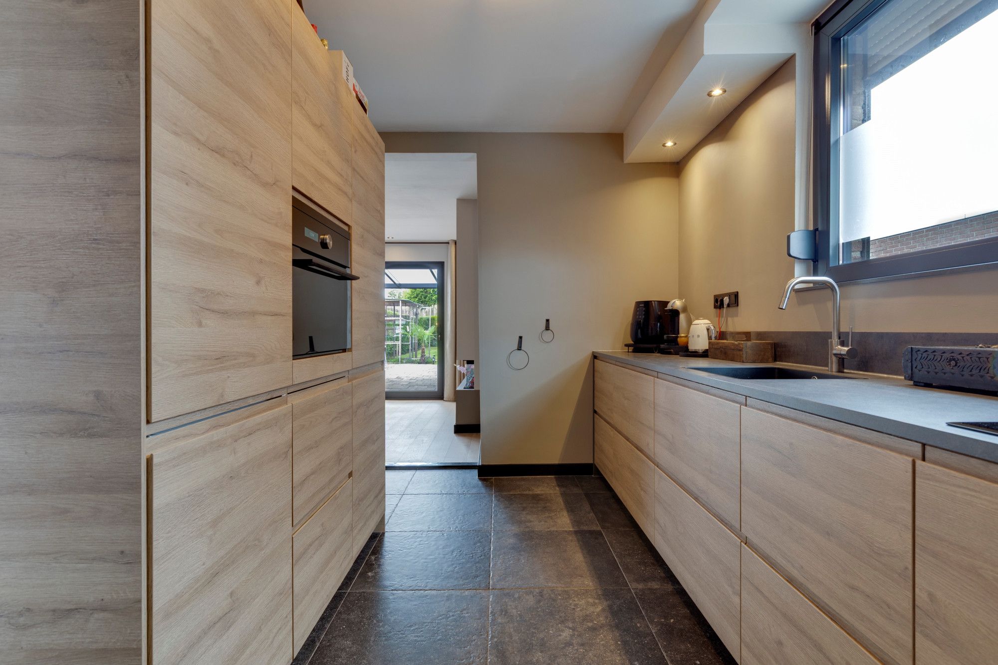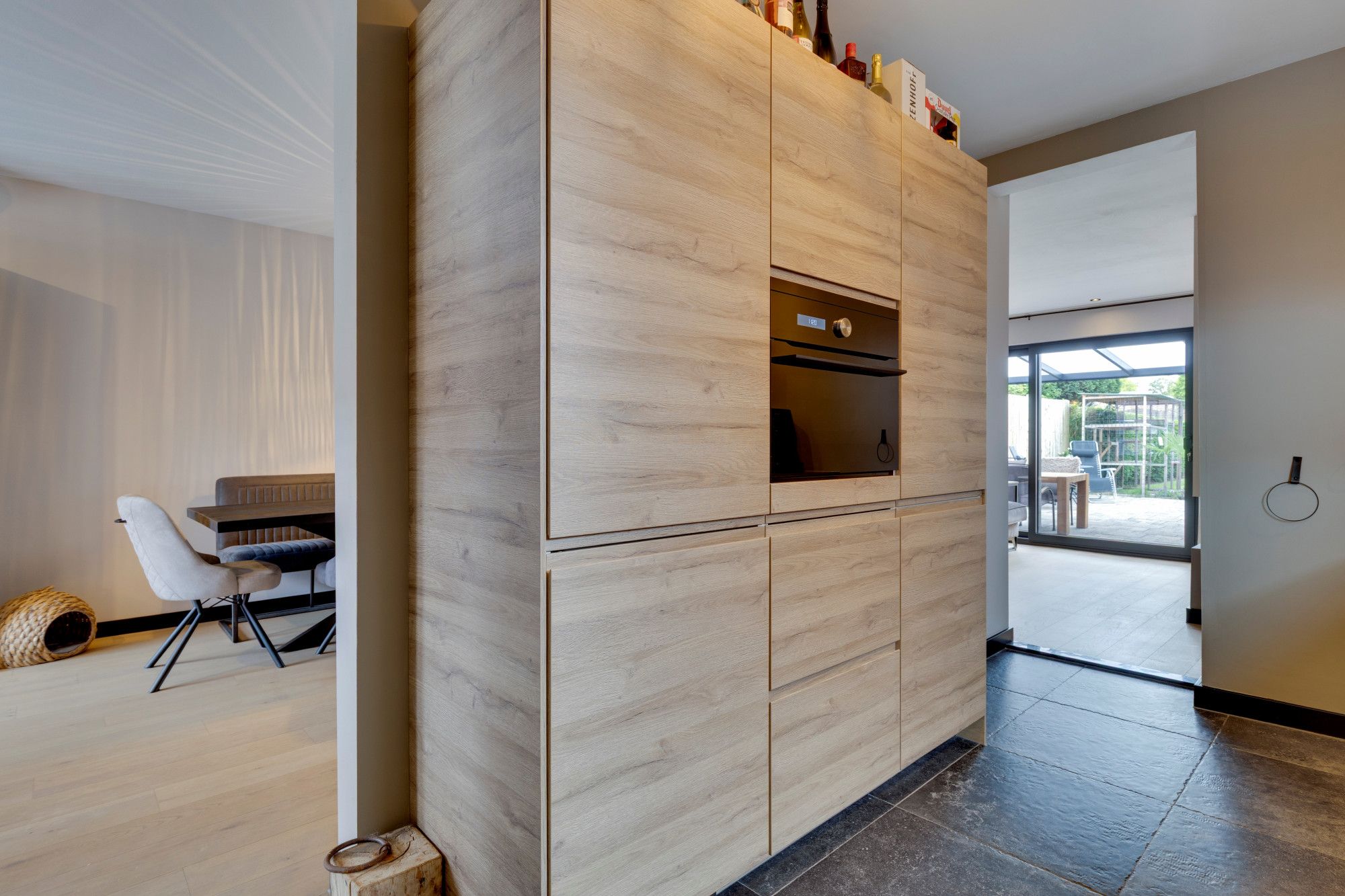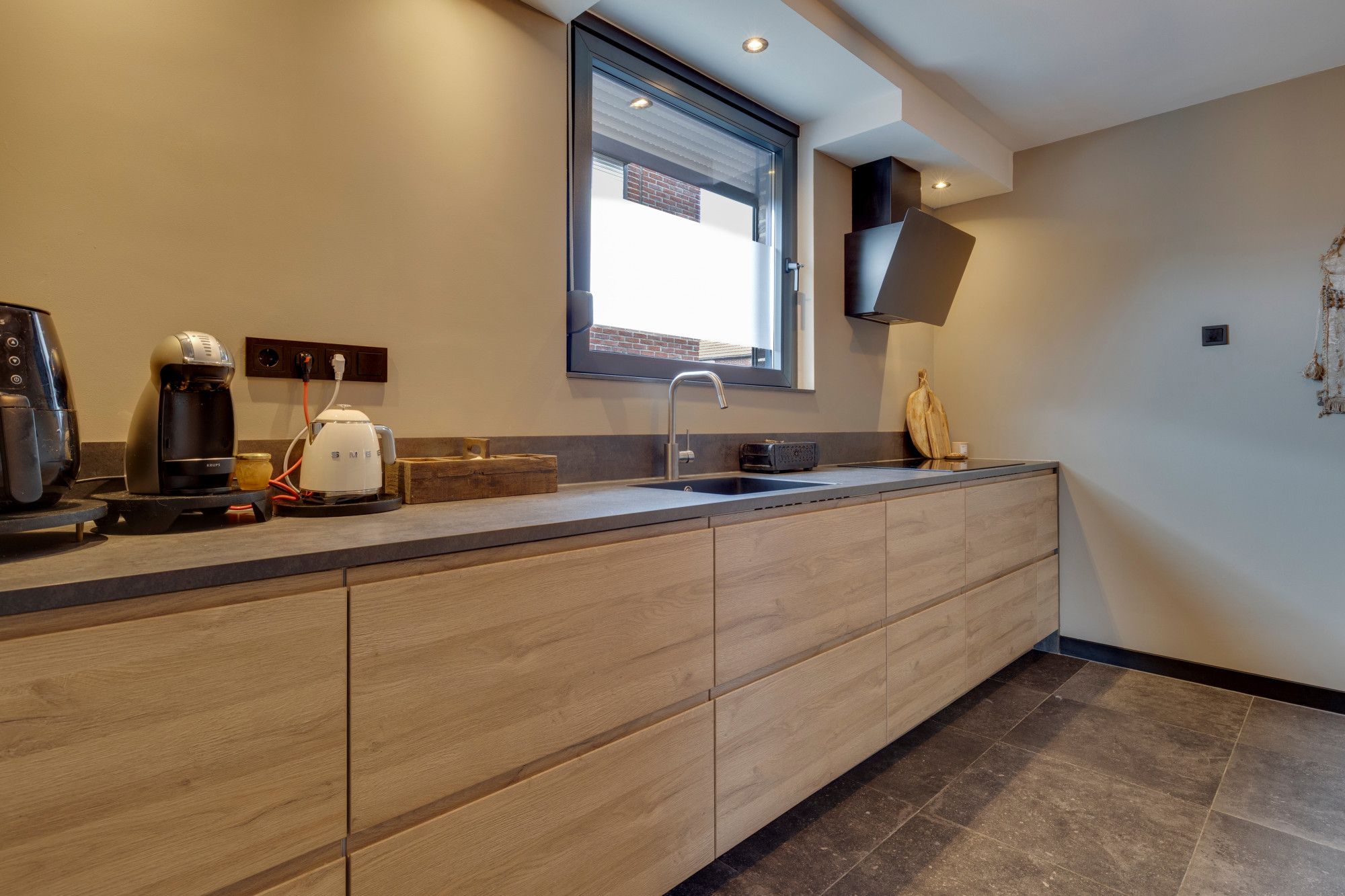 Halfopen keuken v.v. moderne hoogwaardige aanbouwkeuken incl. inbouwapparatuur, te weten, vaatwasser, koel/vriescombinatie, inductiekookplaat en design wasemkap en v.v. plavuizenvloer.