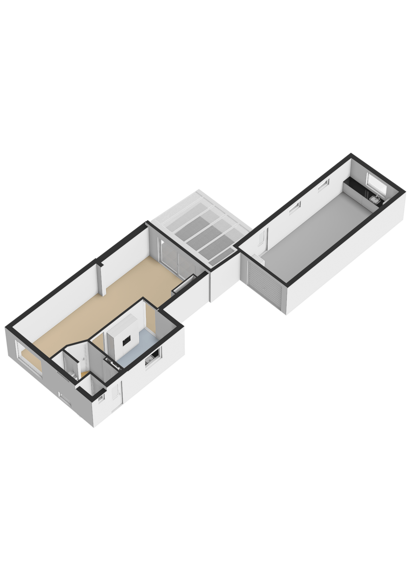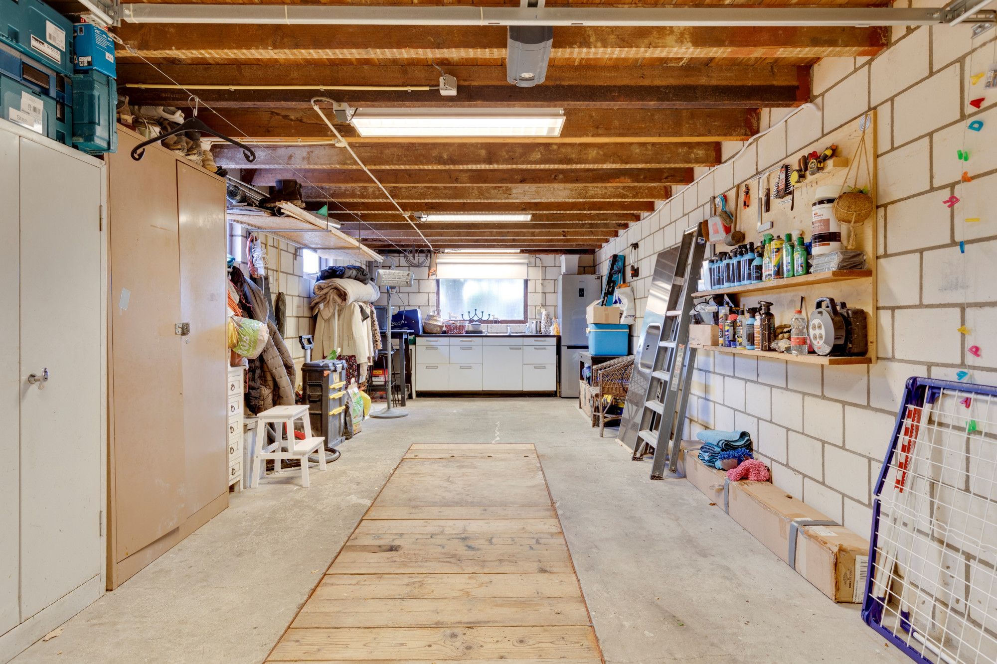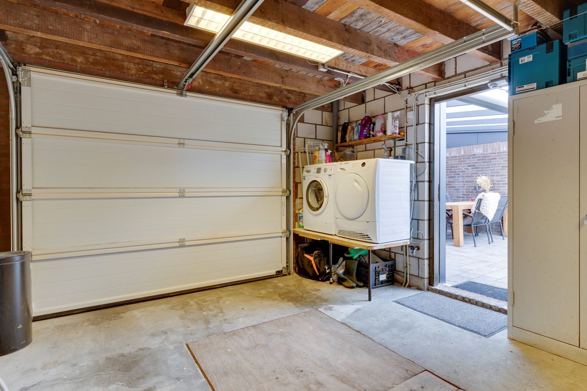 Zeer ruime achtergelegen stenen garage (9.50m diep) inclusief smeerput, elektrische sectionaalpoort, keukenblok en aansluitpunten voor wasmachine en droger.