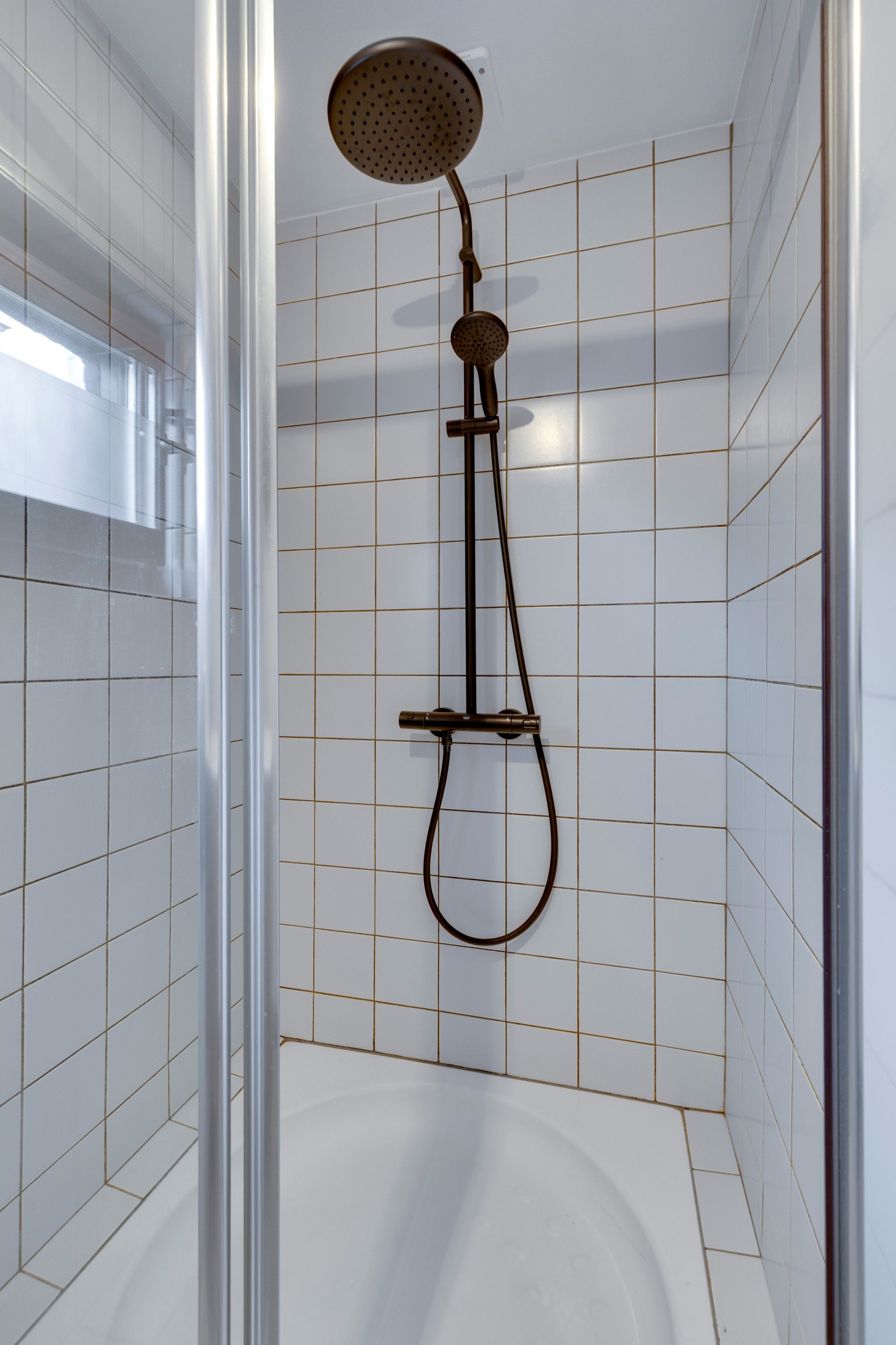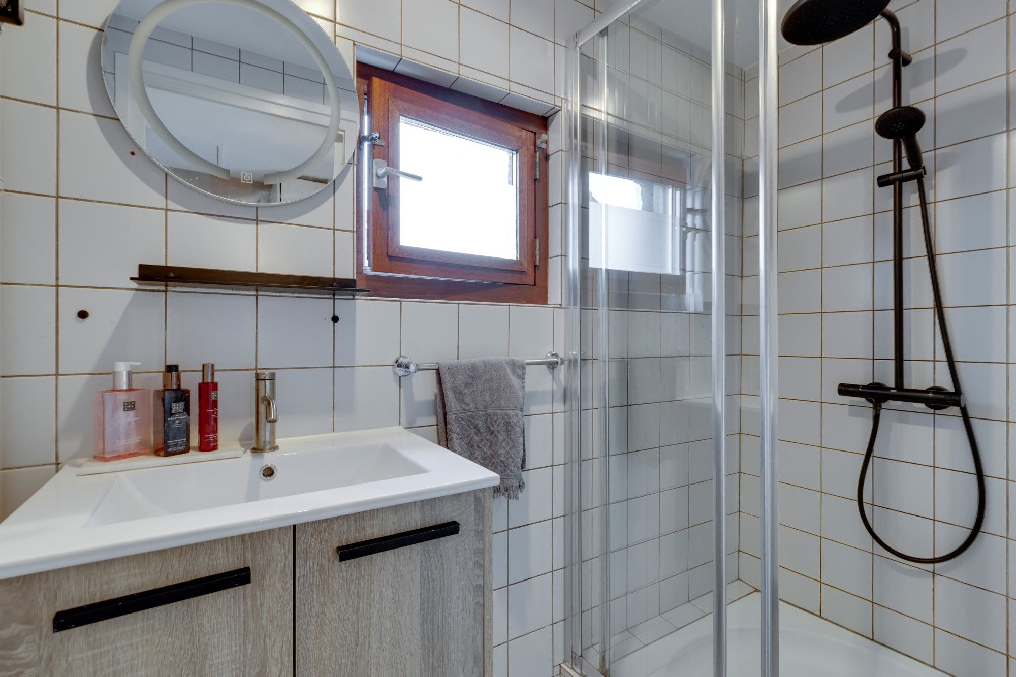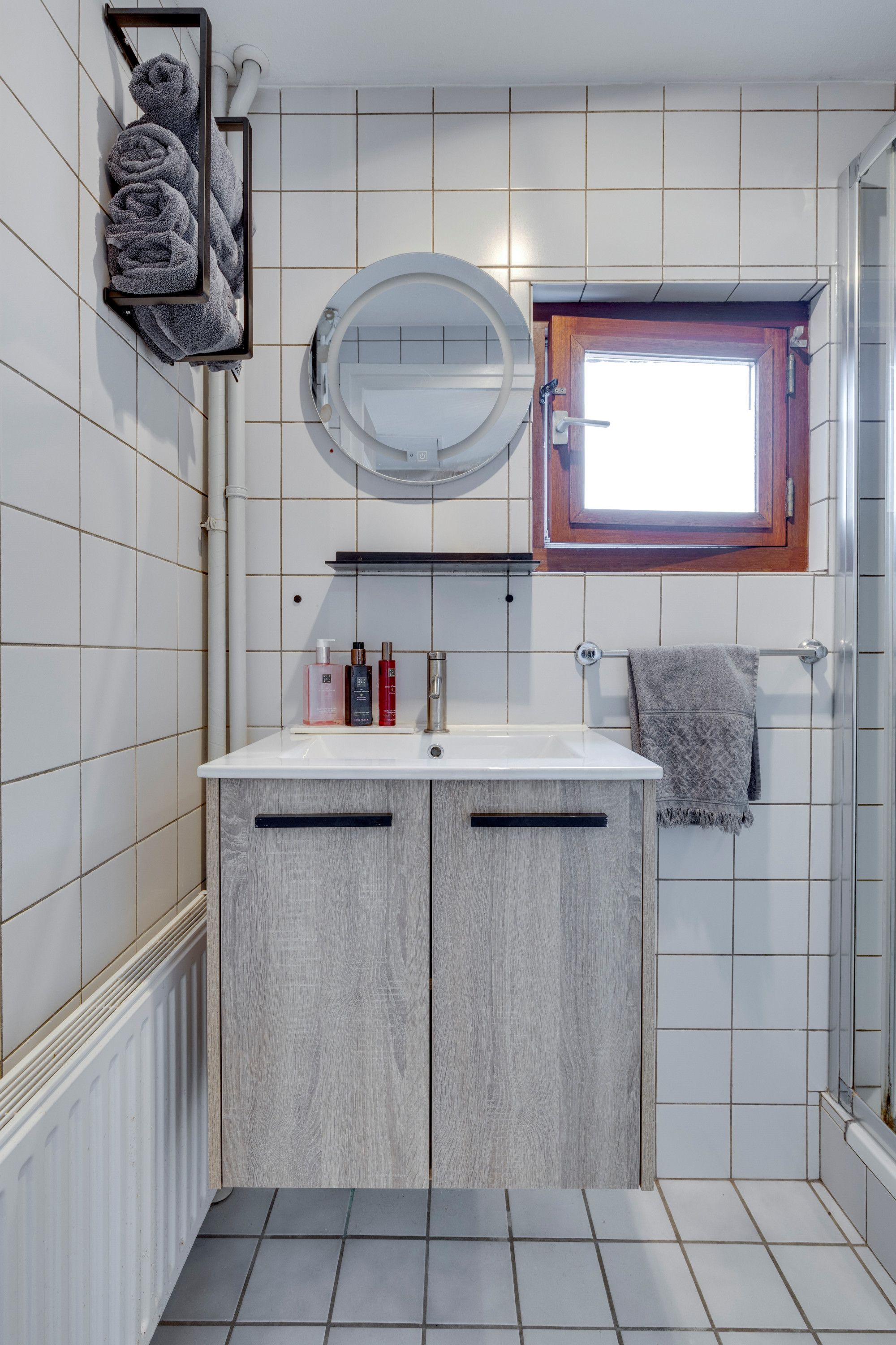 Geheel betegelde doucheruimte v.v. wastafelmeubel en douche.
