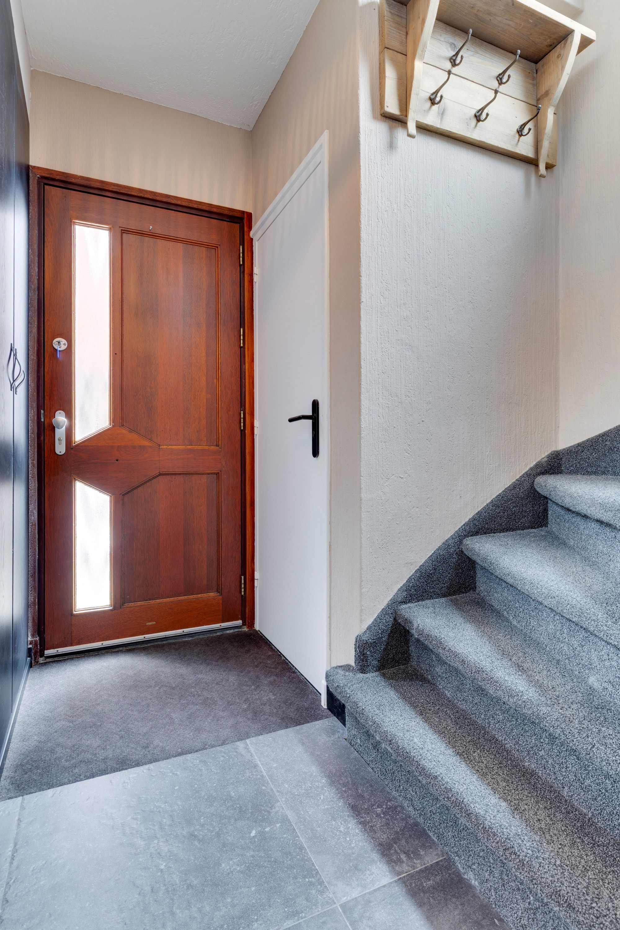 Hal/entree v.v. plavuizenvloer, Moderne betegelde toiletruimte met fonteintje, Meterkast (vernieuwd).
