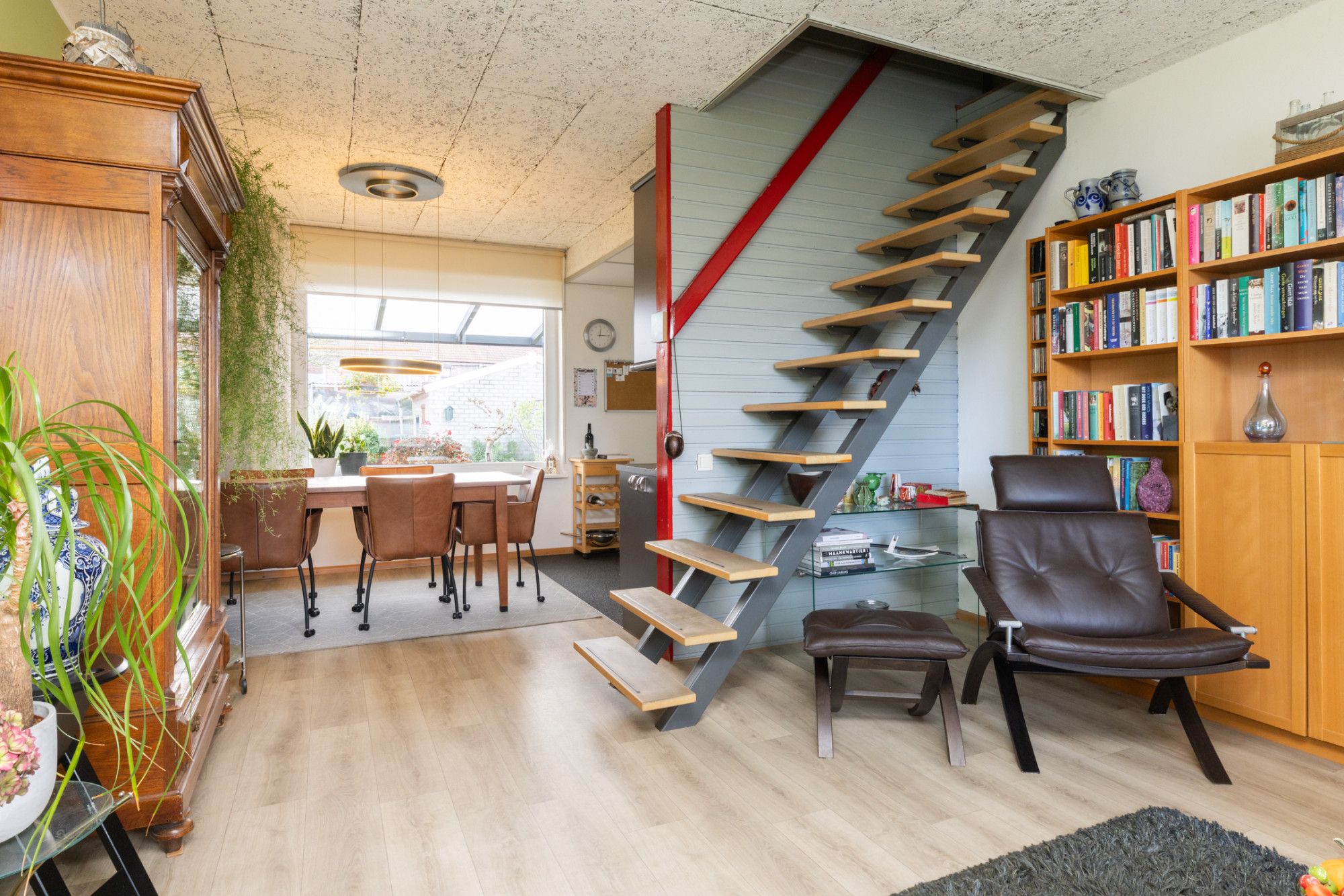 De lichte doorzon woonkamer biedt een prettige leefruimte met aan de voorzijde een comfortabele zithoek voorzien van audio-/visuele aansluitingen. De centraal geplaatste trapopgang vormt een natuurlijke scheiding tussen wonen en eten. Aan de achterzijde bevindt zich de eethoek, die in open verbinding staat met de keukenruimte.