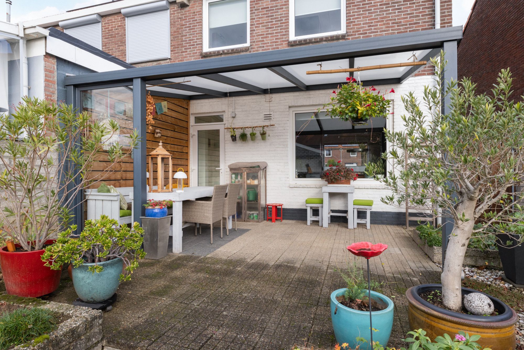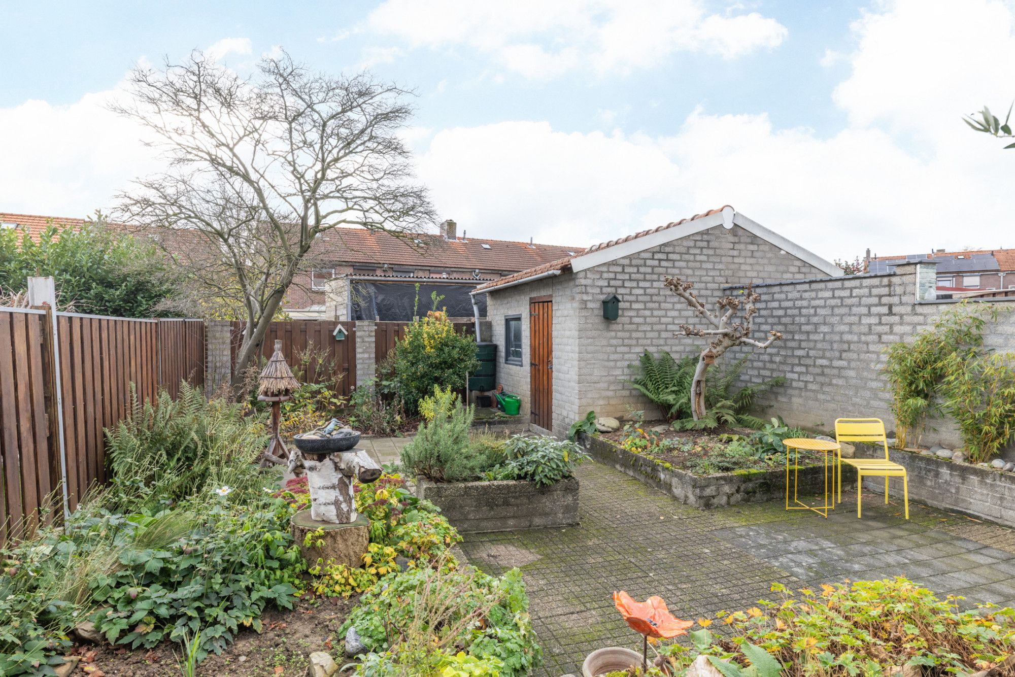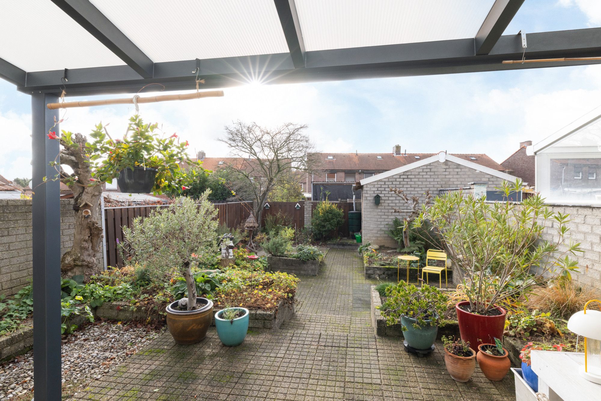 * DIEPE ACHTERTUIN MET OVERDEKT TERRAS, BORDERS VOORZIEN VAN AANPLANTING EN VEEL PRIVACY