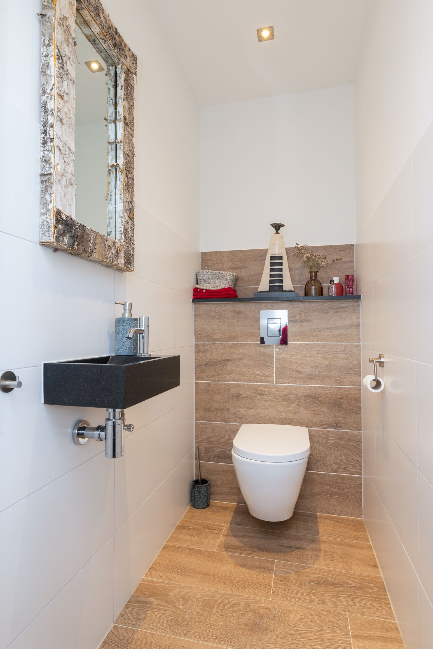 * MODERN, GEHEEL BETEGELD GASTENTOILET MET ZWEVEND WANDCLOSET EN FONTEINTJE